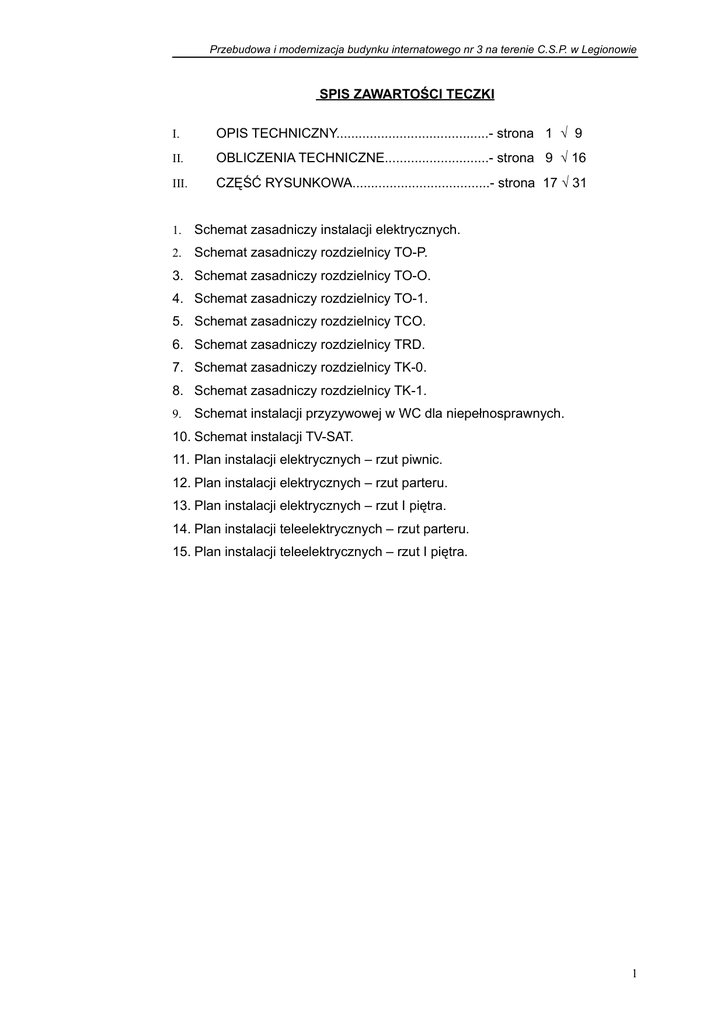 Przebudowa i modernizacja budynku internatowego nr 3 na terenie C.S.P. w Legionowie SPIS ZAWARTOŚCI TECZKI I. OPIS TECHNICZNY.........................................- strona 1 ÷ 9 II. OBLICZENIA TECHNICZNE............................- strona 9 ÷ 16 III. CZĘŚĆ RYSUNKOWA.....................................- strona 17 ÷ 31 1. Schemat zasadniczy instalacji elektrycznych. 2. Schemat zasadniczy rozdzielnicy TO-P. 3. Schemat zasadniczy rozdzielnicy TO-O. 4. Schemat zasadniczy rozdzielnicy TO-1. 5. Schemat zasadniczy rozdzielnicy TCO. 6. Schemat zasadniczy rozdzielnicy TRD. 7. Schemat zasadniczy rozdzielnicy TK-0. 8. Schemat zasadniczy rozdzielnicy TK-1. 9. Schemat instalacji przyzywowej w WC dla niepełnosprawnych. 10. Schemat instalacji TV-SAT. 11. Plan instalacji elektrycznych – rzut piwnic. 12. Plan instalacji elektrycznych – rzut parteru. 13. Plan instalacji elektrycznych – rzut I piętra. 14. Plan instalacji teleelektrycznych – rzut parteru. 15. Plan instalacji teleelektrycznych – rzut I piętra. 1 Przebudowa i modernizacja budynku internatowego nr 3 na terenie C.S.P. w Legionowie OPIS TECHNICZNY do projektu budowlano - wykonawczego instalacji elektrycznych i teleelektrycznych wraz z wydzielonym zasilaniem urządzeń komputerowych dla budynku internatowego w C.S.P. w Legionowie 1. PODSTAWA OPRACOWANIA. Projekt opracowano na zlecenie Inwestora w oparciu o: 1.1. Podkłady architektoniczno – budowlane. 1.2. Opracowania międzybranżowe. 1.3. Uzgodnienia z Inwestorem. 1.4. Obowiązujące normy, przepisy i wskazówki projektowania. 2. ZAKRES OPRACOWANIA. W budynku projektuje się następujące rodzaje instalacji: 2.1. Instalacja oświetlenia podstawowego. 2.2. Instalacja oświetlenia komunikacyjnego. 2.3. Instalacja oświetlenia awaryjnego. 2.4. Instalacja sterowania oświetleniem. 2.5. Instalacja siły technologicznej. 2.6. Instalacja siły pomocniczej. 2.7. Instalacja przyzywowa. 2.8. Instalacja antenowa TV-SAT. 2.9. Instalacja wydzielonego zasilania urządzeń komputerowych. 2.10. Instalacja ochrony przepięciowej. 2.11. Instalacja połączeń wyrównawczych i ochrony przeciwporażeniowej. 2.12. Instalacja odgromowa (nie jest ujęta niniejszym opracowaniem) UWAGA: Instalacja teleinformatyczna; sygnalizacji pożarowej; włamania i napadu są przedmiotem odrębnego opracowania. 2 Przebudowa i modernizacja budynku internatowego nr 3 na terenie C.S.P. w Legionowie 3. ZASILANIE I ROZDZIAŁ ENERGII ELEKTRYCZNEJ. Modernizowany budynek internatowy nr 3 zasilany jest linią kablową typu YAKY 4x120mm2 - 1kV z abonenckiej stacji transformatorowej C.S.P. wprowadzoną do złącza kablowego zlokalizowanego we wnęce ściennej od strony frontowej budynku. Rozdzielnicę główną TGB projektuje się w budynku przy wejściu głównym; a rozłącznik z wyzwalaczami wzrostowymi na jej zasilaniu stanowić będzie główny wyłącznik pożarowy obiektu. Z rozdzielnicy TGB zasilane są odpowiednie tablice obwodowe. WYŁĄCZENIE W RAZIE ZAISTNIENIA POŻARU. W razie zaistnienia pożaru przewidziano możliwość wyłączenia całego obiektu spod napięcia jednym wyłącznikiem pokrętnym zlokalizowanym przy wejściu głównym do budynku. Po odłączeniu budynku spod napięcia wyłącznikiem p. poż. w obiekcie pozostaje załączone oświetlenie awaryjne (ewakuacyjne). Ze względu na niebezpieczeństwo pożaru zgodnie z PN-IEC 60364-4-482 jest konieczne ograniczenie skutków prądów uszkodzeniowych (upływowych i ziemnozwarciowych) zabezpieczając instalację elektryczną urządzeniem różnicowoprądowym o prądzie wyzwalającym 500 mA. Ze względów przeciwpożarowych w celu zapewnienia ochrony dla rozprzestrzeniania pożaru należy przewidzieć bariery przeciwpożarowe izolujące wyznaczone strefy pożarowe. TABLICE I LINIE ZASILAJĄCE. Zestaw tablicy głównych projektuje się w obudowach XLA-250 montowanych w przedsionku wejścia głównego do budynku. Tablice obwodowe są zlokalizowane we wnękach ściennych – wg projektu budowlanego Linie zasilające projektuje się przewodami bądź kablami - wg załączonego schematu. 3 Przebudowa i modernizacja budynku internatowego nr 3 na terenie C.S.P. w Legionowie 4. OPISY INSTALACJI. 4.1 Instalacja oświetlenia podstawowego. Dla prawidłowego oświetlenia zgodnie z wymaganiami zawartymi w EN124641 : 2002 (E) zaprojektowano źródła światła o wysokiej temperaturze barwowej Tc (barwa ciepło - biała) i o dużym wskaźniku oddawania barw (IRC) . Ilość opraw oświetleniowych ustalono w wyniku obliczeń – wyniki podano na planach instalacji. Rodzaje opraw – wg załączonej legendy opraw. Obwody oświetleniowe projektuje się przewodem typu YDY (YDYp) 1,5 (2,5mm2) 750V w tynku lub w korytkach instalacyjnych mocowanych w przestrzeni miedzystropowej korytarzy. W pomieszczeniach sanitarnych; porządkowych; w piwnicy osprzęt instalacyjny projektuje się w wykonaniu hermetycznym; natomiast w pokojach internatowych i komunikacji - osprzęt podtynkowy. Wysokość instalowania łączników 1,4m od podłogi; natomiast gniazd wtykowych w zależności od rodzaju pomieszczenia. W pom. sanitarnych gniazda wtykowe montować na wysokości 1,0 m; w komunikacji i pokojach internatowych – 0,2m od podłogi. Osprzęt firmy [Legrand] o kolorystyce (RAL) ustalonej po konsultacji z Inwestorem. Łączenie przewodów w puszkach za pomocą zacisków „WAGO” . W WC dla niepełnosprawnych łączniki należy instalować na wysokości 0,8m. 4.2 Instalacja oświetlenia komunikacyjnego. Instalacja obejmowała będzie wydzieloną część opraw oświetleniowych w hallu wejściowym oraz korytarzach piętrowych oznaczonych symbolem „AW”. Zasilanie instalacji z wydzielonego obwodu na tablicy TGB w celu wyeliminowania nieprzewidzianych odłączeń konserwacyjno – remontowych co powodowałoby eksploatowanie układów awaryjnych. Wykonanie instalacji w sposób podany dla oświetlenia podstawowego. Instalacja ta może stanowić oświetlenie nocne. 4 Przebudowa i moder