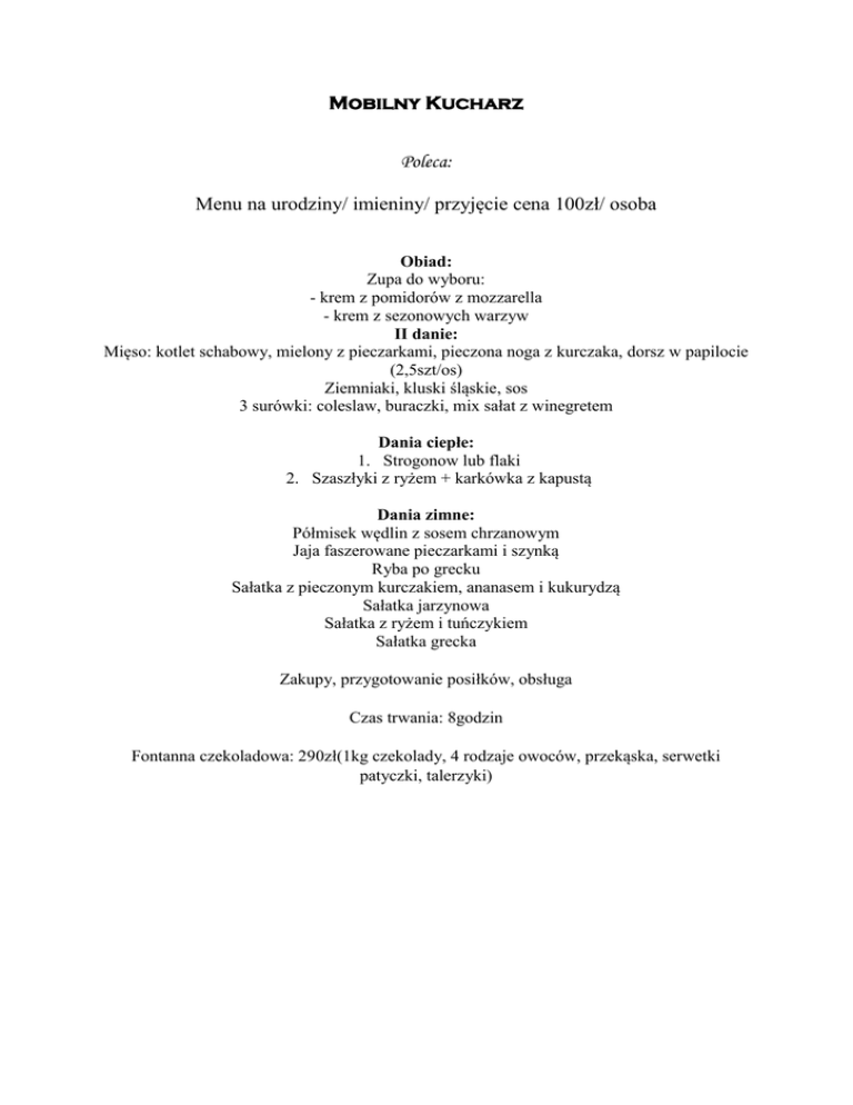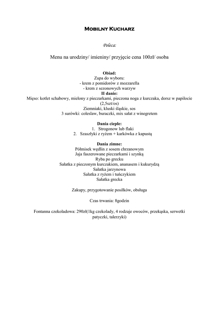Mobilny Kucharz Poleca: Menu na urodziny/ imieniny/ przyjęcie cena 100zł/ osoba Obiad: Zupa do wyboru: - krem z pomidorów z mozzarella - krem z sezonowych warzyw II danie: Mięso: kotlet schabowy, mielony z pieczarkami, pieczona noga z kurczaka, dorsz w papilocie (2,5szt/os) Ziemniaki, kluski śląskie, sos 3 surówki: coleslaw, buraczki, mix sałat z winegretem Dania ciepłe: 1. Strogonow lub flaki 2. Szaszłyki z ryżem + karkówka z kapustą Dania zimne: Półmisek wędlin z sosem chrzanowym Jaja faszerowane pieczarkami i szynką Ryba po grecku Sałatka z pieczonym kurczakiem, ananasem i kukurydzą Sałatka jarzynowa Sałatka z ryżem i tuńczykiem Sałatka grecka Zakupy, przygotowanie posiłków, obsługa Czas trwania: 8godzin Fontanna czekoladowa: 290zł(1kg czekolady, 4 rodzaje owoców, przekąska, serwetki patyczki, talerzyki)