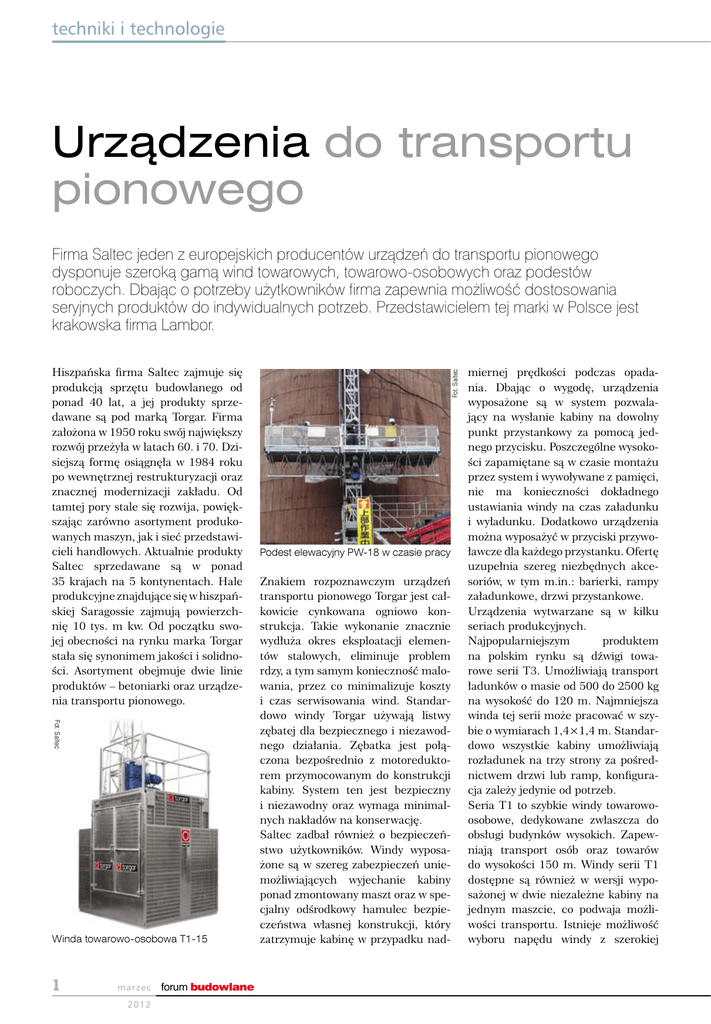 techniki i technologie Urządzenia do transportu pionowego Hiszpańska firma Saltec zajmuje się produkcją sprzętu budowlanego od ponad 40 lat, a jej produkty sprzedawane są pod marką Torgar. Firma założona w 1950 roku swój największy rozwój przeżyła w latach 60. i 70. Dzisiejszą formę osiągnęła w 1984 roku po wewnętrznej restrukturyzacji oraz znacznej modernizacji zakładu. Od tamtej pory stale się rozwija, powiększając zarówno asortyment produkowanych maszyn, jak i sieć przedstawicieli handlowych. Aktualnie produkty Saltec sprzedawane są w ponad 35 krajach na 5 kontynentach. Hale produkcyjne znajdujące się w hiszpańskiej Saragossie zajmują powierzchnię 10 tys. m kw. Od początku swojej obecności na rynku marka Torgar stała się synonimem jakości i solidności. Asortyment obejmuje dwie linie produktów – betoniarki oraz urządzenia transportu pionowego. Fot. Saltec Winda towarowo-osobowa T1-15 marzec 2012 forum budowlane Fot. Saltec Firma Saltec jeden z europejskich producentów urządzeń do transportu pionowego dysponuje szeroką gamą wind towarowych, towarowo-osobowych oraz podestów roboczych. Dbając o potrzeby użytkowników firma zapewnia możliwość dostosowania seryjnych produktów do indywidualnych potrzeb. Przedstawicielem tej marki w Polsce jest krakowska firma Lambor. Podest elewacyjny PW-18 w czasie pracy Znakiem rozpoznawczym urządzeń transportu pionowego Torgar jest całkowicie cynkowana ogniowo konstrukcja. Takie wykonanie znacznie wydłuża okres eksploatacji elementów stalowych, eliminuje problem rdzy, a tym samym konieczność malowania, przez co minimalizuje koszty i czas serwisowania wind. Standardowo windy Torgar używają listwy zębatej dla bezpiecznego i niezawodnego działania. Zębatka jest połączona bezpośrednio z motoreduktorem przymocowanym do konstrukcji kabiny. System ten jest bezpieczny i niezawodny oraz wymaga minimalnych nakładów na konserwację. Saltec zadbał również o bezpieczeństwo użytkowników. Windy wyposażone są w szereg zabezpieczeń uniemożliwiających wyjechanie kabiny ponad zmontowany maszt oraz w specjalny odśrodkowy hamulec bezpieczeństwa własnej konstrukcji, który zatrzymuje kabinę w przypadku nad- miernej prędkości podczas opadania. Dbając o wygodę, urządzenia wyposażone są w system pozwalający na wysłanie kabiny na dowolny punkt przystankowy za pomocą jednego przycisku. Poszczególne wysokości zapamiętane są w czasie montażu przez system i wywoływane z pamięci, nie ma konieczności dokładnego ustawiania windy na czas załadunku i wyładunku. Dodatkowo urządzenia można wyposażyć w przyciski przywoławcze dla każdego przystanku. Ofertę uzupełnia szereg niezbędnych akcesoriów, w tym m.in.: barierki, rampy załadunkowe, drzwi przystankowe. Urządzenia wytwarzane są w kilku seriach produkcyjnych. Najpopularniejszym produktem na polskim rynku są dźwigi towarowe serii T3. Umożliwiają transport ładunków o masie od 500 do 2500 kg na wysokość do 120 m. Najmniejsza winda tej serii może pracować w szybie o wymiarach 1,4×1,4 m. Standardowo wszystkie kabiny umożliwiają rozładunek na trzy strony za pośrednictwem drzwi lub ramp, konfiguracja zależy jedynie od potrzeb. Seria T1 to szybkie windy towarowoosobowe, dedykowane zwłaszcza do obsługi budynków wysokich. Zapewniają transport osób oraz towarów do wysokości 150 m. Windy serii T1 dostępne są również w wersji wyposażonej w dwie niezależne kabiny na jednym maszcie, co podwaja możliwości transportu. Istnieje możliwość wyboru napędu windy z szerokiej gamy silników zarówno klasycznych, jak i sterowanych częstotliwościowo. Znacznie tańszym rozwiązaniem od zaawansowanych technicznie wind serii T1, dla potrzebujących dostarczać zarówno materiały, jak i pracowników przeznaczone są windy serii PL. Są to typowe dźwigi towarowe serii T3 przystosowane do transportu również ludzi. Najciekawszym rozwiązaniem niespotykanym w innych seriach, jest platforma PL-40 do transportu ładunków o masie do 4000 kg i maks. wymiarach 1,8×4,0 m. Saltec oferuje również windy o napędzie linowym, oznaczone symbolem T2, o ładowności 750 i 1000 kg. Jest to jedyny produkt pokryty lakierem. Urządzenie cieszy się powodzeniem szczególnie w magazynach i zakładach produkcyjnych, co nie wyklucza jednak jego stosowania na budowach. Ciekawym, szeroko stosowanym rozwiązaniem, są masztowe podesty robocze. Z powodzeniem zastępują tradycyjne rusztowania, znacznie przyśpieszając pracę. Oznaczone symbolem PW, mogą mieć konfigurację jedno- lub dwumasztową. Przy maksymalnej rozbudowie osiągają szerokość do 32 m. Maks. udźwig tych urządzeń to prawie 4 t, a wysokość podnoszenia 120 m. Interesującym rozwiązaniem w dziedzinie transportu pionowego jest urządzenie PF-15. Sprzęt ten jest przeznaczony do przemieszczania całych sekcji szalunków stropowych bez konieczności ich rozbierania na pojedyncze elementy na czas transportu pomiędzy kondygnacjami. Jest to jedno z nielicznych takich rozwiązań na rynku. Uzupełnieniem powyższych produktów są wciągarki linowe montowane do rusztowań, stropów lub specjalnych stojaków. Służą do transportu materiałów, narzędzi i elementów rusztowań o ciężarze od 100 do 500 kg. Serię tych wciągarek oznaczono symbolem EC. Firma Saltec, w odpowiedzi na różnorodne potrzeby użytkowników, zapewnia możliwość modyfikacji seryjnych urządzeń. Windy na standardowych wieżach mogą pracować w zależności od serii do wysokości 120–150 m. Możliwa jest jednak modyfikacja tego parametru. Przykładem może być winda T1-05 zamontowana w kominie Elektrowni Opole. Winda ta o udźwigu 500 kg z napędem sterowanym częstotliwościowo osiągnęła wysokość 250 m. Możliwe jest również modyfikowanie rozmiaru i kształtu kabin ładunkowych. Przykładowo, dla potrzeb fabryki mebli zmodyfikowano kabinę w windzie T3-20 do rozmiaru 2,85×3,85 