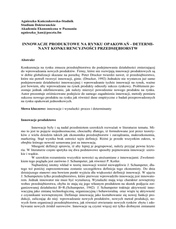 Agnieszka Kańczukowska-Stadnik Studium Doktoranckie Akademia Ekonomiczna w Poznaniu [email protected] INNOWACJE PRODUKTOWE NA RYNKU OPAKOWAŃ - DETERMINANT KONKURENCYJNOŚCI PRZEDSIĘBIORSTW Abstrakt Konkurencja na rynku zmusza przedsiębiorstwa do podejmowania działalności zmierzającej do wprowadzania nowych produktów. Firmy, które nie rozwijają innowacji produktowych są w dobie globalizacji skazane na porażkę. Peter Drucker twierdzi nawet, iż przedsiębiorstwo, które nie potrafi tworzyć innowacji, ginie. (Drucker, 1992) Jednakże nie wystarcza już samo podejmowanie działalności innowacyjnej i wprowadzanie tychże innowacji na rynek, ważne jest bowiem, aby wprowadzane na rynek produkty odnosiły sukces rynkowy. Problemem pozostaje jednak zdefiniowanie, jak należy mierzyć powodzenie nowego produktu na rynku. Autor prezentuje zróżnicowane podejście do samego zagadnienia innowacji, metody pomiaru sukcesu nowego produktu na rynku jak również dane empiryczne z badań przeprowadzonych na rynku opakowań jednostkowych. Słowa kluczowe: innowacje i wynalazki: proces i determinanty Innowacje produktowe Innowacje były i są nadal przedmiotem szerokich rozważań w literaturze tematu. Mimo to jest to pojęcie niejednoznaczne, chociażby dlatego, iż formułowane jest przez teoretyków z wielu dziedzin takich jak ekonomika przedsiębiorstw i zarządzania, makroekonomia, marketing. Stąd wynika brak ostrości tejże definicji. Różni je przede wszystkim zakres, w obrębie którego nowość uznawana jest za innowację. Mnogość definicji sprawia, iż aby lepiej je pogrupować, należy przyjąć pewne kryteria. W literaturze często spotyka się dwa podstawowe sposoby pojmowania innowacji: szerokie i wąskie. W szerokim rozumieniu wszystkie nowości są utożsamiane z innowacjami. Zwolennikiem tego poglądu jest zarówno J. Schumpeter, jak również P. Kotler. Najbardziej istotny wkład w teorię innowacji wniósł niewątpliwie J. Schumpeter, dlatego też poniżej zaprezentowana zostanie szczegółowa definicja tego ekonomisty. Do dnia dzisiejszego stanowi ona bowiem punkt wyjścia dla większości definicji innowacji. W ujęciu J. Schumpetera tylko przedsiębiorstwo, które pierwsze wprowadziło innowację jest innowatorem. Jednak innowator nie musi być wynalazcą. Wynalazki mają więc charakter zewnętrzny wobec przedsiębiorstwa, chyba że stają się jego własnym produktem na skutek podjęcia zorganizowanej działalności B+R.(Schumpeter, 1942) J. Schumpeter traktuje aktywność innowacyjną jako zmianę technologiczną, organizacyjną i behawioralną oraz wiąże tę aktywność z czynnikami wewnętrznymi. Definiuje innowację jako kształtowanie się nowej funkcji produkcji, zaliczając do niej: wprowadzanie nowych produktów, nowych metod produkcji, nowych form organizacji przedsiębiorstwa, jak również otwieranie nowych rynków zbytu i zdobywanie nowych źródeł surowców. Innowacje są czymś więcej niż tylko drobnymi zmianami 86 Agnieszka Kańczukowska-Stadnik zebranymi razem. Zdaniem J. Schumpetera innowacje są „nowymi kombinacjami” naruszającymi stan równowagi w systemie gospodarczym.(Schumpeter, 1912) Podkreśla również, iż wprowadzenie innowacji polega przede wszystkim nie na przyroście istniejących czynników produkcji, ale na przesuwaniu czynników istniejących ze starych do nowych zastosowań.(Schumpeter, 1939) Uważa również, iż innowację cechuje nieciągłość. Definicja Schumpetera ma bardzo szeroki zasięg przedmiotowy, obejmuje zmiany produktowe, procesowe, marketingowe i organizacyjne. Natomiast zakres czasowy nadawany innowacji przez Schumpetera jest bardzo wąski. Kotler natomiast postrzega innowację jako jakikolwiek produkt, usługę lub pomysł, który jest postrzegany przez kogoś jako nowy. Pomysł może istnieć od dawna lecz jest innowacją dla osoby, która postrzega go jako nowy.(Kotler, 2000) R. Rothwell definiuje innowację jako techniczne, finansowe jak i związane z zarządzaniem, projektowaniem, produkcją, marketingiem działania zaangażowane w komercjalizację nowego (bądź ulepszonego) procesu wytwarzania lub produktu (equipment).(Rothwell, 1985) W przytoczonej powyżej definicji mamy do czynienia z nieco zawężoną definicją, która jednak nie precyzuje czy nowość jest tu postrzegana z punktu widzenia rynku czy też producenta. Warto przytoczyć jeszcze definicję P. Druckera, który równie szeroko, jak zaprezentowani wyżej autorzy, postrzega innowację. Podkreśla natomiast, iż innowacja jest konkretnym narzędziem przedsiębiorczości.(Drucker, 2004, s.34) Jest terminem bardziej ekonomicznym czy społecznym niż technicznym i powinna być rozpatrywana raczej w kategoriach popytu niż podaży, tzn. jako zmienianie wartości i zadowolenia uzyskiwanego z zasobów przez konsumenta.(Drucker, 2004, s.38-39) W wąskim rozumieniu pojęcia innowacji, nie każda nowość jest uznawana za innowację. Dlatego właśnie O. Lange polemizuje z Schumpeterem, twierdząc iż zaprezentowana przez niego definicja innowacji jest zbyt szeroka. O. Lange uważa, iż istnieje zawsze bardzo wiele (może nawet nieskończenie wiele) sposobów zmieniania produkcji. Innowacja występuje natomiast tylko wtedy, gdy zachodzi możliwość takiej zmiany, która zwiększa (zdyskontowany) maksymalny efektywny zysk, jaki przedsiębiorstwo może osiągnąć. Przedsiębiorstwo nie uwzględnia żadnych innych możliwych zmian.(Lange, 1961) W jeszcze węższym rozumieniu za innowację uważa się tę nowość, która została po raz pierwszy wprowadzona na rynek. Może ona dotyczyć nowego produktu, nowego procesu, systemu czy metody zarządzania. Najbardziej znaną definicję zaprezentował Ch. Freeman, twierdząc, iż innowację stanowi pierwsze handlowe wprowadzenie (zastosowanie) nowego produktu, procesu, systemu lub urządzenia.(Freeman, 1982) Autor najprawdopodobniej przyjął, iż pierwsze handlowe wprowadzenie dotyczy skali cał
