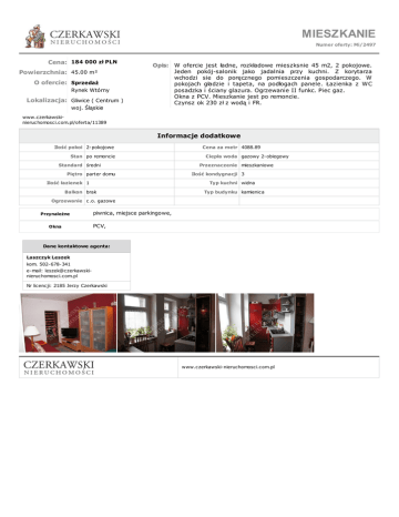 MIESZKANIE Numer oferty: Mi/2497 Cena: 184 000 zł PLN Powierzchnia: 45.00 m² O ofercie: Sprzedaż Rynek Wtórny Lokalizacja: Gliwice ( Centrum ) woj. Śląskie Opis: W ofercie jest ładne, rozkładowe mieszksnie 45 m2, 2 pokojowe. Jeden pokój-salonik jako jadalnia przy kuchni. Z korytarza wchodzi sie do poręcznego pomieszczenia gospodarczego. W pokojach gładzie i tapeta, na podłogach panele. Łazienka z WC posadzka i ściany glazura. Ogrzewanie II funkc. Piec gaz. Okna z PCV. Mieszkanie jest po remoncie. Czynsz ok 230 zł z wodą i FR. www.czerkawskinieruchomosci.com.pl/oferta/11389 Informacje dodatkowe Ilość pokoi 2-pokojowe Stan po remoncie Standard średni Piętro parter domu Ilość łazienek 1 Cena za metr 4088.89 Ciepła woda gazowy 2-obiegowy Przeznaczenie mieszkaniowe Ilość kondygnacji 3 Typ kuchni widna Balkon brak Typ budynku kamienica Ogrzewanie c.o. gazowe Przynależne Okna piwnica, miejsce parkingowe, PCV, Dane kontaktowe agenta: Laszczyk Leszek kom. 502-678-341 e-mail: [email protected] Nr licencji: 2185 Jerzy Czerkawski www.czerkawski-nieruchomosci.com.pl
