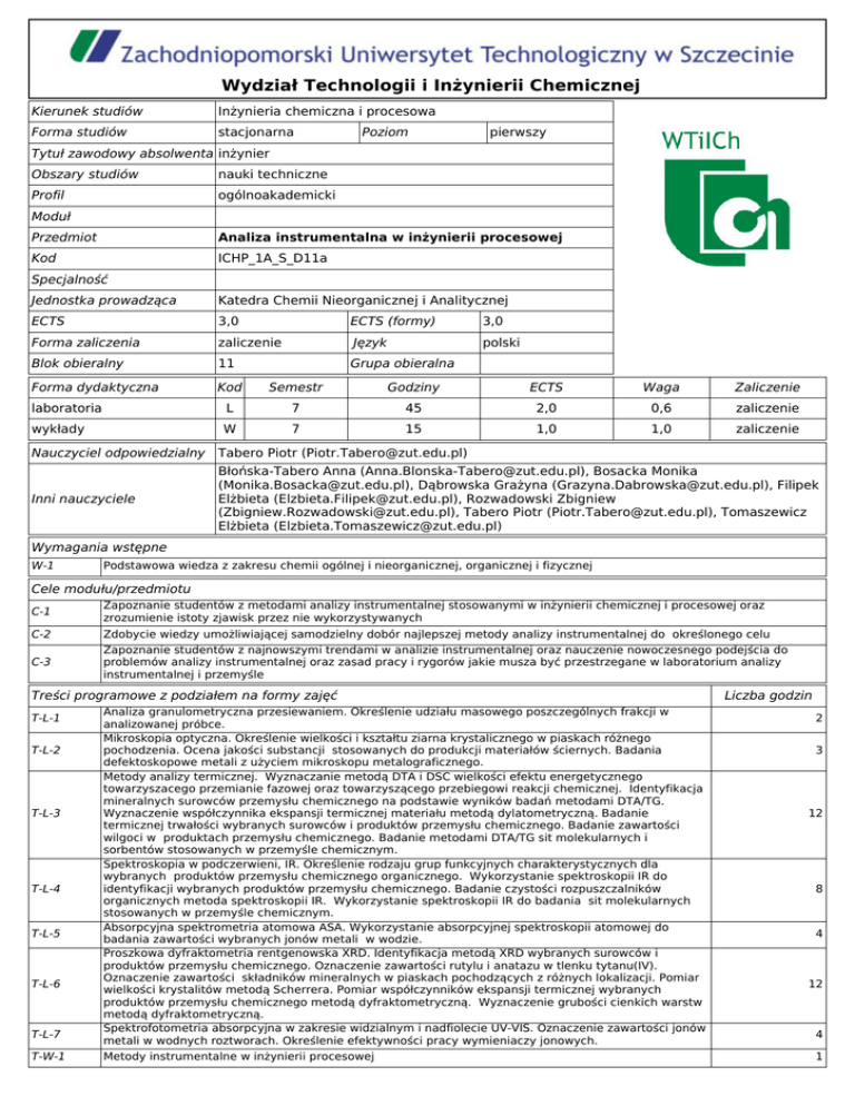 Wszystkie sylabusy do pobrania - Wydział Technologii i Inżynierii