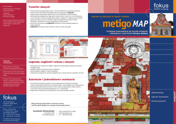 Strona tytułowa: Kościół Pielgrzyma w Ipthausen (fasada zachodnia) Kartowanie: Hendrik Romstedt, Kirchheim (Turyngia) Celem kartowania była ocena ubytków. Na tej podstawie można prognozować w jakim stopniu zmaleją koszty konserwacji. Transfer danych • • • • • • • Interfejs CAD dla bezpośredniego importu z formatu DWG/DXF jako podstawa kartowania funkcja importu dla istniejących projektów CAD i ich kontynuacji w metigo MAP Eksport wyników kartowania do plików (TIFF) lub CAD (DWG/DXF) w skali rzeczywistej dla każdej klasy kartograficznej mogą zostać utworzone pola z danymi (np. w celu znalezienia innych informacji na temat technologii danej metody) i mogą być im przypisane różne wartości wyznaczone ilości oraz dane o obiektach mogą być wyeksportowane razem w plikach tekstowych i opracowane w arkuszu kalkulacyjnym lub bazie danych przy pomocy darmowej wersji metigo VIEW są Państwo w stanie przesyłać projekty do swoich partnerów metigo VIEW towarzyszą funkcje pomiarowe i wydruk w skali rzeczywistej Pomiary na obrazach w formie cyfrowej. metigo MAP ® Cyfrowe kartowanie do celów ochrony i renowacji zabytków polska wersja • aparat cyfrowy lub analogowy oraz skaner do pozyskiwania obrazu • taśma miernicza, miarka teleskopowa lub dalmierz disto do pomiaru długości fasady • komputer PC z procesorem typu Pentium, minimalny rozmiar pamięci operacyjnej 512 MB RAM oraz system operacyjny Microsoft Windows 95/98/NT/2000/XP/VISTA. Legenda, nagłówki i arkusz z danymi • • • • zdefiniowane przez użytkownika nagłówki i legenda dla efektywnego przedstawienia projektu kartograficznego opcjonalne dodanie wyznaczonych ilości w legendzie jednolite legendy i nagłówki w różnych projektach indywidualne przedstawienie wyników kartograficznych w arkuszu danych w jednolitym formacie Szkolenie i jednodniowe seminaria • • • Jeśli istnieje taka potrzeba, jesteśmy w stanie zagwarantować indywidualne szkolenie, w którym wykorzystane zostaną dane z Państwa projektu, i które odbędzie się w Państwa biurze. Alternatywą jest jednodniowe seminarium, które możemy przeprowadzić w Lipsku (Niemcy) w biurze firmy Fokus (jeśli zostanie zgłoszonych min. 3 uczestników). Mogą Państwo testować pełną wersję programu przez okres jednego miesiąca1. Dokumentacja fokus Pomiary geodezyjne budynków, fotogrametria, obróbka obrazu Niemcy | Deutschland D – 04229 Lipsk | Leipzig Lauchstädter Straße 20 Tel: +49 (0) 3 41 2 17 84 60 Fax: +49 (0) 3 41 2 17 84 70 Cyfrowe kartowanie Kosztorysowanie Więcej informacji znajdą Państwo w internecie na stronie: www.fokus-gmbh-leipzig.de lub u naszego autoryzowanego partnera: Klaudiusz Wesolowski ul. Klaudyny 6/106 PL-01-684 Warszawa • http://restorer3d.com/metigo • klaudiuszw @ gmail.com • tel. +48 504 769 281 [email protected] www.fokus-GmbH-Leipzig.de © wittigdesign 2008 met_map_pol_08 metigoMAP Warunki techniczne: Dla kogo jest metigoMAP metigoMAP jest odpowiednim programem dla konserwatorów i restauratorów zabytków do cyfrowego kartowania na skalowalnych i przetworzonych obrazach. W pracach konserwatorsko-restauratorskich bardzo duży nacisk kładzie się na sporządzenie dokumentacji. Przetwarzanie zdjęć i montaż • • • • przetwarzanie zdjęć w skali rzeczywistej funkcja skalowania stosowana do zeskanowanych planów papierowych montaż i obróbka zdjęć połączenie wielu obrazów o różnych właściwościach (rozdzielczość, skala, kolorowe/czarno-białe) w ramach jednego projektu kartowania metigoMAP umożliwia wykonywanie i opracowywanie przetworzonych zdjęć zarówno w miejscu ich wykonania jak i w pracowni. Czym jest metigoMAP Narzędzia do rysowania i sygnatury kartograficzne metigoMAP jest programem do cyfrowego przetwarzania, kartowania i rejestrowania zabytków na przetworzonej fotomapie. • • • • • • • Przyjazne dla użytkownika połączenie obróbki zdjęć i funkcji CAD‘owskich umożliwia komfortową pracę zarówno w biurze jak i w terenie. metigoMAP został stworzony we współpracy z konserwatorami i architektami. Nowe możliwości od wersji 3.0 • administracja projektem z hierarchią obiektów • rozszerzona struktura warstw • rozszerzony interfejs użytkownika • legenda z wyznaczaniem ilości • nowe narzędzia do rysowania i sygnatury kartograficzne • interfejs CAD • arkusze danych • zarządzanie informacjami obiektowymi Poligony i linie rysowane ręcznie, krzywe linie i półokręgi, funkcje prostokąta i okręgów. Kosztorysowanie powierzchni i linii na podstawie kartowania w skali rzeczywistej można uzyskać automatycznie i pogrupować wg. klasyfikacji określonej przez użytkownika. Wypełnienie obszarów przeźroczystymi kolorami, kodami lub szrafurą. Funkcje CAD (wydłużanie, przycinanie, przenoszenie, funkcja lustro...) Funkcje przecinania się powierzchni (do opracowania konturów sąsiednich powierzchni i części nachodzących na siebie) Indywidualne szablony kartowania mogą być zdefioniowane i zaprojektowane przy pomocy ogromnej biblioteki sygnatur, typów linii i kolorów. Edytor sygnatur do nakładania indywidualnych szrafur, linii, sygnatur wektorowych i kolorów. Komfortowy interfejs użytkownika Zarządzanie klasami kartowania • • • • • • • • kontrola programu poprzez drzewo projektowe, listę z menu lub okno dialogowe kartowania indywidualne opcje interfejsu użytkownika pozwalające na optymalne korzystanie z programu zarówno na komputerze PC jak i komputerze przenośnym Tablet-PC w terenie szybka nawigacja w kartowanym obiekcie Do wyboru włączanie lub wyłączanie przeźroczystości warstw w rejestrze poprzez grupowanie klas. Oprogramowanie jest samodzielną aplikacją i nie wymaga dodatkowych programów. Jako podkład do kartowania mogą zostać użyte przetworzone obrazy i zeskanowane plany (TIF/JPEG/BMP) także jako rysunki CAD (DWG, DXF). Możemy wyróżnić klasy kartowania d
