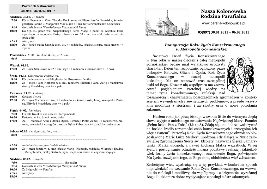 Porządek Nabożeństw od 30.01. do 06.02.2011 r. Niedziela 30.01. IV zwykła 7:30 Für + Ehemann u. Vater Theodor Rock, seine ++ Eltern Josef u. Franziska, Schwiegereltern Lorenz u. Margarette Moj u. alle ++ aus der Verwandtschaft beiderseits 9:30 Godzinki ku czci Niepokalanego Poczęcia NM Panny 10:00 Do Op. B., przez wst. Niepokalanego Serca Maryi z podz. za wszelkie łaski, z prośbą o dalszą opiekę Bożą i zdrowie z ok. 50 r. ur. oraz o bł. Boże w małżeństwie córki 17:15 Nieszpory 18:00 Za + żonę i matkę Urszulę z ok. ur., ++ rodziców, teściów, siostrę, brata oraz za ++ z pokr. Poniedziałek 31.01. św. Jana Bosko, przb. wsp. 6:45 ……………………………………………... Wtorek 01.02. 17:00 Za + ojca Stanisława w 12 r. śm., jego ++ rodziców i teściów oraz ++ z pokr. Środa 02.02. Ofiarowanie Pańskie, św. 8:00 Für die lebenden u. ++ Mitglieder der Rosenkranzfamilie 18:00 Za + męża i ojca Norberta w r. śm., rodziców Elżbietę i Jana, Zofię i Stanisława, siostrę Magdalenę oraz ++ z pokr. Czwartek 03.02. I miesiąca 16:00 Godzina Święta 17:00 Za + syna Marcina w r. śm., ++ rodziców i teściów, siostrę Irenę, szwagierki: Paulinę, Elfrydę i Magdalenę oraz ++ z pokr. Piątek 04.02. I miesiąca 7:00 Für alle Kranken aus unserer Pfarrgemeinde 16:30 Różaniec w int. dzieci i młodzieży 17:00 Za ++ rodziców Annę i Ottona Dykta, Elżbietę i Piotra Zuber, ++ rodzeństwo, bratowe, szwagierki, szwagrów z rodzin Dykta Zuber oraz ++ dziadków z obu stron Sobota 05.02. św. Agaty, dz. i m., wsp. 8:00 ……………………………………………... 17:00 18:00 Nabożeństwo maryjne I sobót miesiaca Za + męża Józefa w. r. oraz teściów Marię i Richarda, rodziców Wiktorię i Erwina, + Marię Teodor, ciotkę Gertrudę, syna, męża oraz dusze w. czyśćcu cierpiące. Niedziela 06.02. V zwykła 7:30 …………………………………… (Deutsch) 9:30 Godzinki ku czci Niepokalanego Poczęcia NM Panny 10:00 Za żyjących i ++ Parafian 17:15 Nieszpory 18:00 ……………………………………………... Nasza Kolonowska Rodzina Parafialna www.parafia-kolonowskie.pl 05(897) 30.01.2011 – 06.02.2011 Inauguracja Roku Życia Konsekrowanego w Metropolii Górnośląskiej Światowy Dzień Życia Konsekrowanego w tym roku w naszej diecezji i całej metropolii górnośląskiej będzie miał wyjątkowo uroczysty charakter. Dzień ten rozpocznie, ogłoszony przez biskupów Katowic, Gliwic i Opola, Rok Życia Konsekrowanego w naszej metropolii kościelnej. Ma on stanowić czas szczególnej łaski od Boga. Nasza z nią współpraca ma zaowocować pogłębieniem rzetelnej wiedzy na temat życia konsekrowanego, refleksją nad tożsamością i charyzmatem poszczególnych zgromadzeń w kontekście ich wewnętrznych i zewnętrznych problemów, a przede wszystkim modlitwą z siostrami i za siostry oraz o nowe powołania zakonne. Hasłem roku jak piszą biskupi w swoim liście do wiernych „będą słowa wyjęte z anielskiego zwiastowania Najświętszej Maryi Pannie: „Pełna łaski, Pan z Tobą” (Łk 1,28). Zdają się one dobrze wskazywać na boskie źródło tożsamości osób konsekrowanych i szczególną ich więź z Panem”. Patronką Roku Życia Konsekrowanego obwołano błogosławioną Marię Luizę Merkert, urodzoną i działającą w Nysie założycielkę Zgromadzenia Sióstr św. Elżbiety, nazywaną Śląską Samarytanką, Matką ubogich, a nawet kochaną Matką wszystkich. W jej życiu i posługiwaniu odnaleźć można podstawy realizacji jakiejkolwiek formy życia konsekrowanego: zawierzenie Bogu, poświęcenie Mu życia, rozwijanie tego, co Bogu miłe, oblubieńcza więź z Jezusem. Zechciejmy więc, wpatrując się w jej przykład, w konkretny sposób odpowiedzieć na wezwanie Roku Życia Konsekrowanego, na wezwanie do refleksji i modlitwy, do współpracy i wdzięczności wyrażanej Bogu i ludziom za dobro wypływające z posługi sióstr zakonnych. Rozliczenie Parafialnego Zespołu Caritas za 2010 rok Przychód: Saldo z 2009 roku 440,00 zł. Członkowie wspierający (20) 1.540,00 zł. Sponsorzy 5.115,00 zł. Skarbonka św. Antoniego 141,15 zł. Sprzedaż świec adwentowych 110,00 zł. Skarbonki wiekopostne i ofiara z W. Czwartku 820,00 zł. Sprzedaż skarpet i kartek świątecznych 473,00 zł. Sprzedaż pierników 695,00 zł Dotacja z OPS na Wigilię dla samotnych 1.100,00 zł. ——-————— Razem 10.434,15 zł. Dzisiaj obchodzimy IV niedzielę zwykłą Zapraszamy na nieszpory o godz. 17:15. 05/2011 We środę przypada Św. Ofiarowania Pańskiego. Czcimy Jezusa Chrystusa, który jest Światłością Świata i Jego Matkę w tytule „Matki Bożej Gromniczej”. Błogosławieństwo świec na Mszy św o godz. 18:00. W tym dniu przypada też Światowy Dzień Życia Konsekrowanego. Kolekta tego dnia przeznaczona jest na klasztory klauzurowe. W czwartek przypada wspomnienie św. Błażeja. Po Mszy św. udzielanie błogosławieństwa gardła ku jego czci. W czwartek Godziny Święta o godz. 16:00. Zapraszamy! W piątek odwiedziny chorych od godz. 8:00 (z wyj. ul. Haraszowskie i Pluderska. te ul. w sobotę od godz. 9:00) W sobotę po Mszy św. o godz. 8:00 święcenie chleba ku czci św. Agaty. Wydatki: W sobotę o godz. 15:00 nauka przedchrzcielne. Jubilaci i odwiedziny chorych (54) Zwrot kosztów transportu „C” - Opole Dzień Chorych i Tydzień Miłosierdzia Dotacja do biletów Zakup żywności i lekarstw „Wakacje z Bogiem” Dopłata do wycieczki Zapomogi okolicznościowe Paczki wielkanocne Św. Marcin, św. Mikołaj i św. Elżbieta Wigilia dla samotnych Inne (gaz, środki czystości, ksero…) Razem Saldo za 2010 rok 2.154,92 zł. 262,76 zł. 654,08 zł. 20,00 zł. 231,95 zł. 681,83 zł. 2.000,00 zł. 550,00 zł. 340,49 zł. 547,24 zł. 1.764,01 zł. 568,35 zł. ——————— 9.775,63 zł. 658,52 zł. W imieniu Parafialnej Rady Duszpasterskiej składamy serdeczne Bóg zapłać całemu Parafi