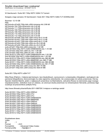 Szybki download bez czekania! Geschrieben von Smootousy - 2012/09/11 04:16 _____________________________________ W Garniturach / Suits S01 720p HDTV X264-TvT torrent Sciagnij z tego serwera: W Garniturach / Suits S01 720p HDTV X264-TvT DOWNLOAD Rozmiar: 12.10 GB Pliki: NFOs/suits.s01e05.720p.hdtv.x264-immerse.nfo 2.96 kB NFOs/suits.104.720p-dimension.nfo 0.40 kB NFOs/suits.111.720p-dimension.nfo 0.28 kB NFOs/suits.109.720p-dimension.nfo 0.28 kB NFOs/suits.108.720p-dimension.nfo 0.25 kB NFOs/suits.110.720p-dimension.nfo 0.24 kB NFOs/suits.112.720p-dimension.nfo 0.23 kB NFOs/suits.s01e06.720p.hdtv.x264-orenji.nfo 0.14 kB NFOs/suits.s01e01.720p.hdtv.x264-orenji.nfo 0.13 kB NFOs/suits.s01e07.720p.hdtv.x264-orenji.nfo 0.13 kB NFOs/suits.s01e03.720p.hdtv.x264-ctu.nfo 0.06 kB NFOs/suits.s01e02.720p.hdtv.x264-ctu.nfo 0.05 kB suits.s01e01.720p.hdtv.x264-orenji.mkv 1.32 GB Suits.S01E04.720p.HDTV.X264-DIMENSION.mkv 1.10 GB suits.s01e03.720p.hdtv.x264-ctu.mkv 1.09 GB suits.s01e02.720p.hdtv.x264-ctu.mkv 1.09 GB Suits.S01E12.720p.HDTV.X264-DIMENSION.mkv 1.02 GB Suit.S01E08.720p.HDTV.X264-DIMENSION.mkv 1.00 GB Suits.S01E10.720p.HDTV.X264-DIMENSION.mkv 990.86 MB Suits.S01E05.720p.HDTV.x264-IMMERSE.mkv 985.77 MB Suits.S01E11.720p.HDTV.X264-DIMENSION.mkv 960.38 MB Suits.S01E09.720p.HDTV.X264-DIMENSION.mkv 951.77 MB suits.s01e06.720p.hdtv.x264-orenji.mkv 897.75 MB suits.s01e07.720p.hdtv.x264-orenji.mkv 828.44 MB Suits.S01.720p.HDTV.x264-TvT Mike Ross (Patrick J. Adams) jest leniwym, lecz blyskotliwym, wyrzuconym z uniwersytetu chlopakiem, cechujacym sie pamiecia fotograficzna, ktora pomogla mu zdac egzaminy adwokackie, nie uczeszczajac do szkoly prawniczej. Harvey Specter (Gabriel Macht), jeden z najlepszych prawnikow na Manhattanie, zatrudnia Rossa na stanowisku jego nowego wspolpracownika. Jednakze musi on udawac, ze ukonczyl studia prawnicze na Uniwersytecie Harvarda, poniewaz tego oczekuje od pracownikow polityka firmy. http://www.filmweb.pl/serial/Suits-2011-585726 3 miejsce w rankingu seriali Suits.S01E01.720p.HDTV.x264-ORENJI Suits.S01E02.720p.HDTV.x264-CTU Suits.S01E03.720p.HDTV.x264-CTU Suits.S01E04.720p.HDTV.X264-DIMENSION Suits.S01E05.720p.HDTV.x264-IMMERSE Suits.S01E06.720p.HDTV.x264-ORENJI Suits.S01E07.720p.HDTV.x264-ORENJI Suits.S01E08.720p.HDTV.X264-DIMENSION Suits.S01E09.720p.HDTV.X264-DIMENSION Suits.S01E10.720p.HDTV.X264-DIMENSION Suits.S01E11.720p.HDTV.X264-DIMENSION Suits.S01E12.720p.HDTV.X264-DIMENSION Przykladowe dane: Video ID :1 Format : AVC Format/Info : Advanced Video Codec Format profile : [email protected] TV-Fredeburg - TV Fredeburg – Sportverein – Schmallenberger Sauerland _FB_PDF_VERSION _FB_PDF_DATE Format settings, CABAC : Yes Format settings, ReFrames : 8 frames Codec ID : V_MPEG4/ISO/AVC Duration : 42mn 52s Bit rate : 2 875 Kbps Width : 1 280 pixels Height : 720 pixels Display aspect ratio : 16:9 Frame rate : 23.976 fps Audio ID :2 Format : AC-3 Format/Info : Audio Coding 3 Mode extension : CM (complete main) Codec ID : A_AC3 Duration : 42mn 52s Bit rate mode : Constant Bit rate : 384 Kbps Channel(s) : 2 channels Channel positions : Front: L R Sampling rate : 48.0 KHz Bit depth : 16 bits Compression mode : Lossy Stream size : 118 MiB (12%) Info od uploadera Upload: 275 kb/s Dostepny: Tak Seed: 24/h Enjoy! /b zobacz tez: klezmafour 5th element download conan the barbarian (2011) pl.brrip.xvidhttp://norogh.jtbclan.com/viewtopic.php?f=7&t=831669 http://pubforum.crystalcoconut.com/showthread.php?tid=253 http://www.arkanian.net/wth//showthread.php?tid=54 ============================================================================ TV-Fredeburg - TV Fredeburg – Sportverein – Schmallenberger Sauerland _FB_PDF_VERSION _FB_PDF_DATE