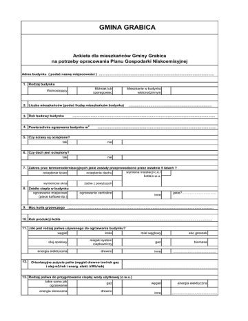 GMINA GRABICA Ankieta dla mieszkańców Gminy Grabica na potrzeby opracowania Planu Gospodarki Niskoemisyjnej Adres budynku ( podać nazwę miejscowości ) ……………………………………………………………………...………………… 1. Rodzaj budynku Bliźniak lub szeregowiec Wolnostojący Mieszkanie w budynku wielorodzinnym 2. Liczba mieszkańców (podać liczbę mieszkańców budynku) 3. Rok budowy budynku …………………………………………………………...………… ……………………………………………………………………………………………..………………. 4. Powierzchnia ogrzewana budynku m2 ……………………………………………………………………………...…………… 5. Czy ściany są ocieplone? tak nie 6. Czy dach jest ocieplony? tak nie 7. Zakres prac termomodernizacyjnych jakie zostały przeprowadzone przez ostatnie 5 latach ? wymiana instalacji c.o./ ocieplenie ścian ocieplenie dachu kotła/c.w.u. wymienione okna 8. Źródło ciepła w budynku ogrzewanie miejscowe (piece kaflowe itp.) żadne z powyższych ogrzewanie centralne inne jakie?………………………… 9. Moc kotła grzewczego ……………………………………………………………………………………………………………...… 10. Rok produkcji kotła ……………………………..…...…………………………………………………………………………………………… 11. Jaki jest rodzaj paliwa używanego do ogrzewania budynku? 12. węgiel koks miał węglowy eko groszek olej opałowy miejski system ciepłowniczy gaz biomasa energia elektryczna drewno inne Orientacyjne zużycie paliw (węgiel drewno ton/rok gaz i olej m3/rok i energ. elekt. kWh/rok) ………………………………………………....…………………………… 13. Rodzaj paliwa do przygotowania ciepłej wody użytkowej (c.w.u.) takie samo jak gaz ogrzewanie energia słoneczna drewno ……………………………….. węgiel inne energia elektryczna …………………………………. 14. Zużycie paliw (węgiel drewno ton/rok gaz i olej m3/rok i energ. elekt. kWh/rok) ……………………….…………………… 15. Czy planowana jest termomodernizacja budynku do 2020 r.? tak 16. Jeśli tak - to w jakim zakresie? wymiana starego kotła na nowy montaż pompy ciepła nie ocieplenie ścian zewnętrznych ocieplenie dachu/ stropodachu montaż kolektorów słonecznych inne jakie?…………….…………… podać roczny przebieg pojazdów w rozbiciu na: rodzaj stosowanego paliwa pojazdów: wymiana okien i drzwi 17. Dane dotyczące posiadanych pojazdów podać liczbę posiadanych pojazdów w rozbiciu na: osobowe : ….………………….. osobowe: ………………… ciężarowe: ………………. rolnicze: ……….………. benzyna ciężarowe : ………………….. ropa rolnicze: ……………………. gaz/Lpg 18. Dane dotyczące zużycia energii elektrycznej grupa taryfowa: ………………………………………………………………………………………………………………...…………. miesięczne zużycie prądu zł/miesiąc: ………………………………………………………………………….………………………. 19. Czy wyrażają Państwo chęć uczestnictwa w programach/projektach unijnych (umożliwiających dofinansowanie) tak nie