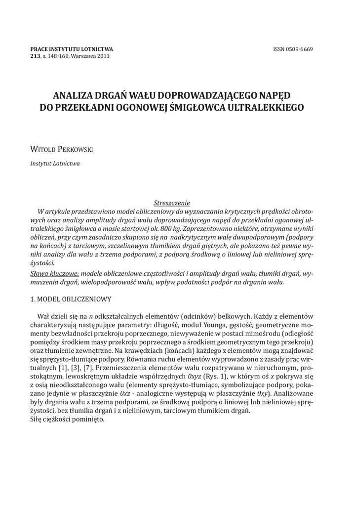 PRACE iNSTYTUTU LOTNiCTWA 213, s. 148-160, Warszawa 2011 ISSN 0509-6669 ANALiZA DRGAŃ WAŁU DOPROWADZAJĄCEGO NAPĘD DO PRZEKŁADNi OGONOWEJ ŚMiGŁOWCA ULTRALEKKiEGO WItold PerkoWSkI Instytut Lotnictwa Streszczenie W artykule przedstawiono model obliczeniowy do wyznaczania krytycznych prędkości obrotowych oraz analizy amplitudy drgań wału doprowadzającego napęd do przekładni ogonowej ultralekkiego śmigłowca o masie startowej ok. 800 kg. Zaprezentowano niektóre, otrzymane wyniki obliczeń, przy czym zasadniczo skupiono się na nadkrytycznym wale dwupodporowym (podpory na końcach) z tarciowym, szczelinowym tłumikiem drgań giętnych, ale pokazano też pewne wyniki analizy dla wału z trzema podporami, z podporą środkową o liniowej lub nieliniowej sprężystości. Słowa kluczowe: modele obliczeniowe częstotliwości i amplitudy drgań wału, tłumiki drgań, wymuszenia drgań, wielopodporowość wału, wpływ podatności podpór na drgania wału. 1. Model oblIczeNIoWy Wał dzieli się na n odkształcalnych elementów (odcinków) belkowych. każdy z elementów charakteryzują następujące parametry: długość, moduł younga, gęstość, geometryczne momenty bezwładności przekroju poprzecznego, niewyważenie w postaci mimośrodu (odległość pomiędzy środkiem masy przekroju poprzecznego a środkiem geometrycznym tego przekroju) oraz tłumienie zewnętrzne. Na krawędziach (końcach) każdego z elementów mogą znajdować się sprężysto-tłumiące podpory. równania ruchu elementów wyprowadzono z zasady prac wirtualnych [1], [3], [7]. Przemieszczenia elementów wału rozpatrywano w nieruchomym, prostokątnym, lewoskrętnym układzie współrzędnych 0xyz (rys. 1), w którym oś x pokrywa się z osią nieodkształconego wału (elementy sprężysto-tłumiące, symbolizujące podpory, pokazano jedynie w płaszczyźnie 0xz - analogiczne występują w płaszczyźnie 0xy). Analizowane były drgania wału z trzema podporami, ze środkową podporą o liniowej lub nieliniowej sprężystości, bez tłumika drgań i z nieliniowym, tarciowym tłumikiem drgań. Siłę ciężkości pominięto. ANAlIzA drgAń WAłu doProWAdzAjącego NAPęd do PrzekłAdNI ogoNoWej śMIgłoWcA... 149 rys. 1. Model wału do obliczeń częstotliwości drgań własnych 2. drgANIA lINIoWe WAłu W StANAch uStAloNych obliczenia polegały na wyznaczeniu za pomocą programu MeS kilku pierwszych częstości kołowych drgań własnych wału (rys. 1), w zależności od sztywności środkowej podpory kp. Przyjęto, że podpory są izotropowe, przegubowe i nie ma tłumienia (ct = c0 = cn = cp = 0). Parametry struktury wału są następujące (wyróżniono główne parametry, jednakowe w całym, tu przedstawionym opracowaniu): L = 3,32 [m] - długość, r = 2700 [kg/m3] - gęstość, A = 0,00022 [m2] - pole przekroju poprzecznego, 11 E = 0,7·10 [Pa] - moduł younga, i = 59,3·10 -9 [m4] - geometryczny, giętny moment bezwładności przekroju, k0 = kn =106 [N/m] - sztywność podpór zewnętzrnych, c0 = cn = cp = 0 [Ns/m] - współczynniki tłumienia w podporach, kp = 100 ¸ 109 [N/m] - sztywność podpory środkowej (parametr), ct = 0 [Ns/m2] - tłumienie zewnętrzne na jednostkę długości wału. rozważany wał jest „giętki” – charakteryzuje go niewielka sztywność giętna w porównaniu ze sztywnością podpór zewnętrznych. Wygodnie jest wprowadzić odniesieniową częstość kołową drgań wału w postaci pierwszej, kołowej częstość drgań belki jednorodnej o podanych wyżej parametrach materiałowo-geometrycznych, podpartej na końcach, w 2 podporach nieskończenie sztywnych. Wyznacza się ją z zależności [3], [5], [6]: Ω0 = 2 L2 EI A dla podanych wyżej parametrów wału W0 wynosi 74,85 rad/s. do analizy MeS wał podzielono na 6 elementów skończonych równej długości, a wyniki przedstawiono w tab. 1 i na rys. 2. kolejne częstości kołowe drgań wału rzeczywistego (z uwzględnieniem skończonej sztywności podpór oraz ew. tłumienia) oznaczono odpowiednio: ω01 , ω02 , ω03 . 150 WItold PerkoWSkI tab. 1. bezwymiarowe częstości kołowe drgań własnych wału w funkcji sztywności podpory środkowej kp (sztywność podpór skrajnych: k0 = kn = 106 N/m , Ω0 = 74,85) rys. 2. bezwymiarowe częstości kołowe drgań własnych wału w funkcji sztywności kp jak widać na rys. 2, przy małej sztywności podpory środkowej, wał jest belką jednoprzęsłową, której kolejne częstotliwości drgań własnych mają się do siebie w przybliżeniu tak, jak kwadraty kolejnych liczb naturalnych (miałyby się do siebie dokładnie jak 1 : 4 : 9… gdyby nie było podpory środkowej, a sztywność podpór zewnętrznych była nieskończenie duża). gdy sztywność podpory środkowej jest większa lub równa sztywności podpór zewnętrznych (kp ≥ 106 N/m), wał staje się belką dwuprzęsłową. jeżeli kp leży w przedziale 104 ÷ 106 N/m, a zwłaszcza gdy jest bliskie 105 N/m, występuje obszar przejściowy, w którym można się spodziewać ciekawych efektów, gdyż wał w zależności od dodatkowych czynników (np. nieliniowość sprężystości podpory środkowej, dodanie tłumienia albo siły wzdłużnej), może się zachowywać zarówno jak belka jednoprzęsłowa jak i dwuprzęsłowa. Widać to dobrze na przebiegu β01 i β02 - przy małej sztywności podpory środkowej są to odpowiednio pierwsza i druga kołowe częstości drgań belki jednoprzęsłowej, ale w miarę wzrostu sztywności tej podpory β01 ANAlIzA drgAń WAłu doProWAdzAjącego NAPęd do PrzekłAdNI ogoNoWej śMIgłoWcA... 151 rośnie, osiąga tę samą wartość co β02 i staje się pierwszą częstością kołową drgań belki dwuprzęsłowej. gdy sztywność podpory środkowej zrówna się ze sztywnościami podpór skrajnych, dalsze jej zwiększanie nie powoduje już istotnych zmian częstotliwości drgań wału. 3. oPIS Modelu tłuMIkA tArcIoWego W celu ograniczenia amplitudy drgań rozważanego wału dla śmigłow