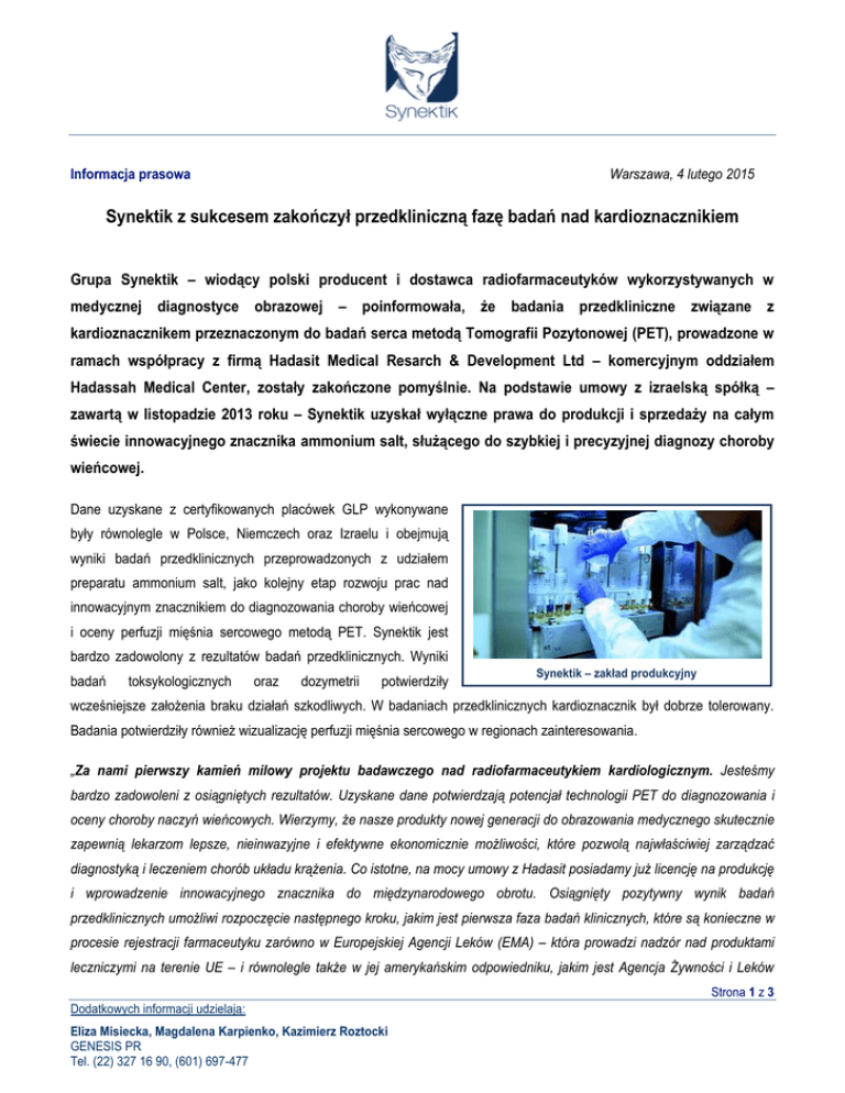 Informacja prasowa Warszawa, 4 lutego 2015 Synektik z sukcesem zakończył przedkliniczną fazę badań nad kardioznacznikiem Grupa Synektik – wiodący polski producent i dostawca radiofarmaceutyków wykorzystywanych w medycznej diagnostyce obrazowej – poinformowała, że badania przedkliniczne związane z kardioznacznikem przeznaczonym do badań serca metodą Tomografii Pozytonowej (PET), prowadzone w ramach współpracy z firmą Hadasit Medical Resarch & Development Ltd – komercyjnym oddziałem Hadassah Medical Center, zostały zakończone pomyślnie. Na podstawie umowy z izraelską spółką – zawartą w listopadzie 2013 roku – Synektik uzyskał wyłączne prawa do produkcji i sprzedaży na całym świecie innowacyjnego znacznika ammonium salt, służącego do szybkiej i precyzyjnej diagnozy choroby wieńcowej. Dane uzyskane z certyfikowanych placówek GLP wykonywane były równolegle w Polsce, Niemczech oraz Izraelu i obejmują wyniki badań przedklinicznych przeprowadzonych z udziałem preparatu ammonium salt, jako kolejny etap rozwoju prac nad innowacyjnym znacznikiem do diagnozowania choroby wieńcowej i oceny perfuzji mięśnia sercowego metodą PET. Synektik jest bardzo zadowolony z rezultatów badań przedklinicznych. Wyniki badań toksykologicznych oraz dozymetrii potwierdziły Synektik – zakład produkcyjny wcześniejsze założenia braku działań szkodliwych. W badaniach przedklinicznych kardioznacznik był dobrze tolerowany. Badania potwierdziły również wizualizację perfuzji mięśnia sercowego w regionach zainteresowania. „Za nami pierwszy kamień milowy projektu badawczego nad radiofarmaceutykiem kardiologicznym. Jesteśmy bardzo zadowoleni z osiągniętych rezultatów. Uzyskane dane potwierdzają potencjał technologii PET do diagnozowania i oceny choroby naczyń wieńcowych. Wierzymy, że nasze produkty nowej generacji do obrazowania medycznego skutecznie zapewnią lekarzom lepsze, nieinwazyjne i efektywne ekonomicznie możliwości, które pozwolą najwłaściwiej zarządzać diagnostyką i leczeniem chorób układu krążenia. Co istotne, na mocy umowy z Hadasit posiadamy już licencję na produkcję i wprowadzenie innowacyjnego znacznika do międzynarodowego obrotu. Osiągnięty pozytywny wynik badań przedklinicznych umożliwi rozpoczęcie następnego kroku, jakim jest pierwsza faza badań klinicznych, które są konieczne w procesie rejestracji farmaceutyku zarówno w Europejskiej Agencji Leków (EMA) – która prowadzi nadzór nad produktami leczniczymi na terenie UE – i równolegle także w jej amerykańskim odpowiedniku, jakim jest Agencja Żywności i Leków Strona 1 z 3 Dodatkowych informacji udzielają: Eliza Misiecka, Magdalena Karpienko, Kazimierz Roztocki GENESIS PR Tel. (22) 327 16 90, (601) 697-477 (FDA). Naszym celem jest rozpoczęcie samodzielnej produkcji i sprzedaży radiofarmaceutyku na całym świecie. Innowacyjność – w skali globalnej – znacznika ammonium salt oraz rosnące zapotrzebowanie na efektywne kosztowo metody diagnostyki kardiologicznej pozwalają szacować, że w perspektywie kilku lat Synektik może stać się znaczącym na międzynarodowym rynku radioznaczników podmiotem. Warto zaznaczyć, że otwarte w kwietniu 2014 roku Centrum Badawczo-Rozwojowe na terenie Wojskowego Instytutu Medycznego w Warszawie pozwala nam jeszcze sprawniej prowadzić dalsze prace. Jesteśmy przekonani, że współpraca z Hadasit nie tylko umocni naszą pozycję rynkową, ale przede wszystkim przyczyni się do postępu w diagnostyce chorób serca oraz zwiększy komfort pacjentów z problemami kardiologicznymi” – mówi Cezary Kozanecki, prezes zarządu Synektik SA. Według Światowej Organizacji Zdrowia (WHO) choroby układu krążenia są głównym zabójcą globalnym. Szacuje się, że 17,5 mln osób zmarło z powodu chorób układu krążenia w 2012 roku, co stanowiło 31% wszystkich zgonów. WHO podaje, że 7,4 mln osób zmarło z powodu chorób związanych z niedokrwieniem mięśnia sercowego, co oznacza, że choroby układu krążenia są najczęstszą przyczyną zgonów na całym świecie zarówno dla mężczyzn jak i kobiet. Badanie PET-MPI umożliwia dokładny pomiar perfuzji mięśnia sercowego, analizę przepływu krwi i funkcji w jednej sesji badania w czasie krótszym niż 30 min. W porównaniu z SPECT-MPI, PET-MPI zapewnia wyższą dokładność diagnostyczną ze względu na wyższą rozdzielczość przestrzenną i kontrast oraz stosowanie mniejszych dawek promieniowania w krótszym czasie badania. Szacunki firm analitycznych wskazują, że globalny rynek radiofarmaceutyków osiągnie wartość na poziomie 5,5-7,9 mld USD w latach 2017-2018.1 Nowy radiofarmaceutyk wykorzystywany będzie w badaniach PET, które daje wyższą rozdzielczość obrazu i dokładniejszą diagnostykę, a także są o wiele krótsze od najczęściej obecnie stosowanej metody SPECT. Czas badania będzie wynosił około 30-45 minut (w porównaniu do 3-4 godzin metodą SPECT) i zapewni obniżenie dawki promieniowania, którą otrzymuje pacjent. Technologia opiera się na innowacyjnym znaczniku, który umożliwia pomiar ilościowego przepływu krwi przez mięsień sercowy. Pozwala to na dokładne określenie stanu pacjenta po przebytym zawale mięśnia sercowego w chorobach niedokrwiennych serca oraz precyzyjną ocenę zaawansowania choroby wieńcowej. Dodatkowo warto zauważyć, że w 2014 roku Synektik zakupił cztery radiofarmaceutyki od austriackiej firmy IASON GmbH, stając się tym samym ich wyłącznym, dożywotnim właścicielem na teranie Polski, Litwy, Łotwy, Estonii, Ukrainy oraz Białorusi. Ponadto Grupa Synektik ma prawo wytwarzać i dostarczać w/w radiofarmaceutyki na terytorium Czech i Słowacji. Synektik zakupił cztery radiofarmaceutyki: EFDEGE®, IASOflu®, IASOdopa® i IASOcholine® (Pcolina). Umowa dotyczy pełnego know-how, technologii, dossier rejestracyjnych i wszelkich praw http://www.prweb.com/releases/radiopharmaceutic