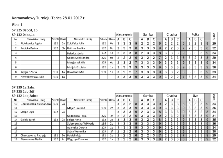 Karnawałowy Turnieju Tańca 28.01.2017 r. Blok 1 Nazwisko i imię Piotrkowicz Agata 2 Kubicka Karina 132 Nazwisko i imię 0a Zbicińska Julia 132 0b Ucińska Emilka Szkoła Klasa Szkoła Klasa A 132 0a 3 132 0b 2 132 1a 2 4 Dziadosz Julia Goliasz Aleksandra 225 0c 2 5 Matyjaszek Ola 225 0c 2 6 Misijuk Elżbieta 132 1a 3 139 1a 3 3 8 9 Krygier Zofia Nowakowska Julia 139 139 1a Rowland Mia 1a SP 139 1a,2abc SP 225 1ab,2df SP 132 1ab,2abce Nr 10 11 12 13 14 15 16 17 18 19 Nazwisko i imię B 3 3 C 3 3 9 8 3 2 3 3 3 2 2 3 8 6 7 9 2 3 3 3 3 2 3 3 3 2 3 3 8 7 9 9 3 2 3 3 3 3 3 3 3 3 3 3 9 8 9 9 3 3 3 3 3 2 3 3 3 3 3 3 9 8 9 9 34 29 34 36 2 3 2 3 7 9 3 3 3 3 3 3 9 9 3 3 3 2 2 2 8 7 3 3 3 3 3 3 9 9 33 34 8 9 9 6 9 9 9 6 6 6 Samba A B C 3 3 3 3 3 3 2 3 3 3 3 3 3 2 3 3 3 3 3 3 3 3 3 3 2 2 3 3 3 3 9 9 8 9 8 9 9 9 7 9 Chacha A B C 2 3 3 3 3 3 3 3 3 2 3 2 3 3 3 3 3 3 3 2 3 2 2 2 2 3 2 2 3 3 A 3 3 3 3 3 3 2 3 3 3 Jive B 3 3 3 3 3 3 3 3 3 3 C 3 3 2 3 3 3 3 3 3 3 9 9 8 9 9 9 8 9 9 9 Walc angielski Szkoła Klasa Gorzkowska Aleksandra 139 Nazwisko i imię 2a Majer Paulina Stolpe Olga 132 2a Galicki Jurek 132 Gadomska Tosia 2a Seliga Anna Sobolewska Wiktoria Chanczewska Patrycja Pieńkowska Nadia 3 132 132 Adamska Dorota Skóra Weronika 2e Dubiel Maja 2c Węgrzyn Zuzanna Szkoła Klasa A 3 139 2c 3 3 225 2f 2 132 2a 3 139 2b 3 225 1b 3 225 2f 2 132 2e 2 132 1a 2 B 3 3 3 2 3 3 3 2 2 2 C 2 3 3 2 3 3 3 2 2 2 6 9 Chacha A B C 2 2 2 2 2 3 6 7 Polka A B C 3 2 3 2 3 3 8 8 29 32 8 9 9 7 9 9 8 6 7 8 Suma Nr 1 Samba A B C 2 2 2 3 3 3 Walc angielski Suma SP 225 0abcd, 1b SP 132 0abc,1a 34 36 34 31 35 36 34 30 29 32