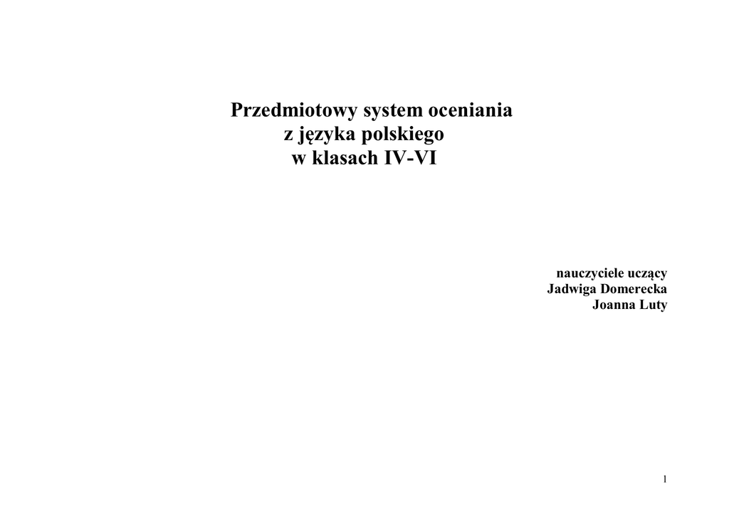 Przedmiotowy system oceniania z języka polskiego w klasach IV-VI nauczyciele uczący Jadwiga Domerecka Joanna Luty 1 I. PRZEWIDYWANE OSIĄGNIĘCIA UCZNIÓW SŁUCHANIE I MÓWIENIE Treść kształcenia Wypowiedź jednozdaniowa Klasa 4 Klasa 5 Precyzyjne formułowanie pytań, udzielanie wyczerpujących odpowiedzi i informacji z odpowiednią intonacją; uważne słuchanie, właściwe reagowanie na wypowiedzi innych osób Jak w klasie 4 Klasa 6 Budowanie precyzyjnych wypowiedzi w sytuacjach oficjalnych Wypowiedź wielozdaniowa Informacja Formułowanie własnego zdania, próba uzasadnienia własnego zdania po uważnym wysłuchaniu wypowiedzi kolegi, przestrzeganie zasad kulturalnej dyskusji . 2 Rozmowa Rozmowa z osobami z najbliższego otoczenia; koncentrowanie się na coraz dłuższych wypowiedziach rozmówcy, wykazywanie zrozumienia intencji wypowiedzi innych osób Aktywne uczestniczenie w rozmowie Jak w klasach poprzednich z różnymi osobami na rozmaite tematy w kulturalny sposób w sytuacjach wymyślonych i rzeczywistych; wykazywanie zainteresowania rozmową. Dyskusja Formułowanie własnego zdania, próba uzasadnienia własnego zdania po uważnym wysłuchaniu wypowiedzi kolegi, przestrzeganie zasad kulturalnej dyskusji. Krytyczne słuchanie wypowiedzi, Aktywny udział w dyskusji jako wyrażenie własnego punktu widzenia odbiorca i nadawca wypowiedzi, w jasny i przekonujący sposób, w uszanowanie zdania rozmówcy. zależności od sytuacji interpretowanie opinii dyskutantów. Opowiadanie Opowiadanie według planu opowiadanie odtwórcze i twórcze przekształcenie rozmowy na opowiadanie. Słuchanie z zainteresowaniem Opowiadanie na wskazany temat z zastosowaniem wybranego czasu narracji i chronologicznego układu zdarzeń Spójne i barwne opowiadanie na wskazany lub wybrany temat; oddanie treści właściwą intonacją, barwą i natężeniem głosu. Opis Opis przedmiotu i krajobrazu próba opisu postaci Doskonalenie opisu przedmiotu i krajobrazu opis postaci literackiej i rzeczywistej Opis dzieł sztuki Charakteryzowanie postaci literackiej i rzeczywistej Próby charakteryzowania postaci literackiej i rzeczywistej. Charakteryzowanie postaci literackiej i rzeczywistej. Sprawozdanie Sprawozdanie np. z uroczystości szkolnej, meczu, wycieczki, itp.; śledzenie toku wypowiedzi sprawozdawczej Sprawozdanie z lektury, filmu, audycji, widowiska teatralnego, ze szczególnym uwzględnieniem części informacyjnej; analizowanie i ocenianie wypowiedzi Streszczenie Próba streszczenia fabularnego utworu literackiego 3 Wygłaszanie tekstów Wygłaszanie z pamięci wierszy i Wygłaszanie z pamięci wierszy i fragmentów prozy wskazanych przez fragmentów prozy wybranych przez nauczyciela uczniów Wygłaszanie z pamięci ról w inscenizacjach szkolnych, wygłaszanie poezji własnej CZYTANIE TEKSTÓW SŁOWNYCH I ODCZYTYWANIE INNYCH TEKSTÓW KULTURY Treść kształcenia Czytanie głośne Klasa 4 Czytanie poprawne, wyraźne i wyraziste, płynne, z uwzględnieniem znaków przystankowych, akcentów logicznych, właściwego tempa i rytmu. Czytanie z podziałem na role; oddawanie głosem charakteru postaci; odróżnianie tekstu narracji od partii dialogowych Klasa 5 Klasa 6 Doskonalenie techniki czytania jak w klasie 4 Czytanie ciche Zapoznanie się z układem podręcznika Świadome korzystanie z książki jako źródła wiedzy, zaznaczenie ważnych treści Czytanie ze zrozumieniem Dosłowne rozumienie tekstu, Czytanie interpretacyjne, wyjaśnianie dostrzeganie ogólnego sensu utworu sensu utworu. Czytanie krytyczne i twórcze, motywujące do konstruktywnego myślenia i działania. Rodzaje i gatunki literackie Baśń ludowa i literacka, różnice między prozą i wierszem Baśń tradycyjna, fantastycznonaukowa; typy powieści; podróżniczo-przygodowa, obyczajowa, fantastyczna; utwór Legenda, podanie, mit Wyszukiwanie określonych treści, (informacyjnych, perswazyjnych, korzystanie z tekstu, ilustracji) 4 literacki i nieliteracki Świat przedstawiony w utworach literackich Fikcja prawdopodobna i fantastyczna; porównanie, uosobienie, ożywienie, wyraz dźwiękonaśladowczy; wers, strofa, rym, narrator, osoba mówiąca w wierszu. Fikcja literacka różnice między Obrazowanie realistyczne, wypowiedzią literacką, informacyjną a fantastyczne; rytm, podmiot liryczny naukową; epitet, przenośnia, refren; wiersz stroficzny i wiersz ciagły; narracja w 1 i 3.osobie; nadawca i odbiorca utworu. CZYTANIE I ODCZYTYWANIE ROŻNYCH TEKSTÓW KULTURY Treść kształcenia Klasa 4 Klasa 5 Klasa 6 Teatr, film Kulturalne uczestniczenie w przedstawieniach teatralnych i filmowych Scenografia, charakteryzacja, gra aktorów, obraz w filmie, dźwięk; utwór literacki i jego adaptacja filmowa Literackie środki wyrazu w porównaniu ze środkami wyrazu filmu, teatru i radia. Radio, telewizja Próby świadomego korzystania z audycji radiowych i telewizyjnych Świadomy wybór audycji radiowych i telewizyjnych Wykorzystanie informacji zawartych w radiowych i telewizyjnych programach oświatowych. Czasopisma Informacje o czasopiśmie, o przeczytanym artykule. Wskazywanie ciekawych działów czasopisma, uzasadnienie wyboru. Wybór materiału z czasopism na zadany temat; gromadzenie wycinków, prowadzenie teczek tematycznych, notatek. Katalogi Katalog alfabetyczny. Katalog alfabetyczny. Katalog rzeczowy. Wydawnictwa (znaki) informacyjne Znaki drogowe, znaki informacyjne, Słownik wyrazów bliskoznacznych i Słownik wyrazów obcych, słownik 5 ostrzegawcze, słownik ortograficzny, encyklopedia, leksykon języka polskiego. Instrukcje Odczytywanie prostej instrukcji, np. Odczytywanie instrukcji prostego gry planszowej. urządzenia elektrycznego. Komiksy Powiązanie obrazka z „dymkiem”, opowiedzenie treści. Łamigłówki Proste łamigłówki, krzyżówki. Reklama Odczytywanie instrukcji domowego urządzenia elektrycznego. Wartościowanie czytanych komiksów rebusy, Rebusy Wyrażenie opinii o reklamie. interpunkcyjny. Wyrazy wieloznaczn