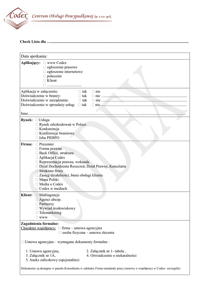 Check Lista dla …............................................................................................................................................... Data spotkania: Aplikujący: www Codex ogłoszenie prasowe ogłoszenie internetowe polecenie Klient …................................ Aplikacja w załączeniu: Doświadczenie w branży: Doświadczenie w zarządzaniu: Doświadczenie w sprzedaży usług: tak tak tak tak nie nie …..................................................................................... nie …..................................................................................... nie.......................................................................................... Inne.................................................................................................................................................................... Rynek: Usługa Rynek odszkodowań w Polsce Konkurencja Konferencje branżowe Izba PIDIPO Firma: Prezenter Forma prawna Back Office, struktura Aplikacja Codex Reprezentacja prawna, wokanda Dział Dochodzenia Roszczeń, Dział Prawny, Kancelaria Struktura firmy Zasięg działalności, biura obsługi klienta Mapa Polski Media o Codex Codex w mediach Klient: Multiagencje Agenci ubezp. Partnerzy Wywiad środowiskowy Telemarketing www Zagadnienia formalne: Charakter współpracy: firma – umowa agencyjna osoba fizyczna – umowa zlecenia Umowa agencyjna – wymagane dokumenty formalne : 1. Umowa agencyjna, 3. Załącznik nr 1A, 5. Aneks zaliczkowy (opcjonalnie) 2. Załącznik nr 1- tabela , 4. Oświadczenie o niekaralności Dokumenty są dostępne w panelu Konsultanta w zakładce Firma-standardy pracy (umowy o współpracy w Codex- szczegóły) Umowa zlecenie - wymagane dokumenty formalne: 1. Umowa zlecenie, 3. Załącznik nr 1A, 5. Oświadczenie o niekaralności, 7. Aneks zaliczkowy (opcjonalnie) 2. Załącznik nr 1 – tabela, 4. Oświadczenie dla celów ZUS, 6. Oświadczenie o tajemnicy przedsiębiorstwa Dokumenty są dostępne w panelu Konsultanta w zakładce Firma-standardy pracy (umowy o współpracy w Codex – szczegóły) Zgłoszenie na szkolenie: Karta uczestnictwa w szkoleniu Kaucja gwarancyjna – termin wpłaty................................................................... System szkoleń: Podstawowe Uzupełniające Terminy najbliższych szkoleń............................................., miejsce............................................................. Konferencje Codex Coaching IC Materiały: Teczka Foldery Formuła współpracy: Wynagrodzenie oraz rozliczenia Zaliczki (załącznik do umowy) Konto firmowe – bieżący adres e'mail........................................................................................................... Wizytówki Plany zawodowe............................................................................................................................................. …........................................................................................................................................................................ Działalność, charakter usługi: Źródła informacji o zdarzeniach Kim są klienci i jak do nich dotrzeć Charakterystyka wypadków objętych usługą Codex Elementy rozmowy z klientem Schemat rozmowy telefonicznej Dokumenty formalne do akt sprawy Szablon opisu zdarzenia Porównanie działań w dochodzeniu roszczeń (wywiad, szacowanie, zadośćuczynienie, ugody, honorarium, orzecznicy, biegli, doświadczenie) Dodatkowe ustalenia: Termin kolejnego spotkania: Umowa : Tak Nie Pytania i uwagi: 1. …..................................................................................................................................................... 2. …..................................................................................................................................................... 3. …..................................................................................................................................................... …............................................................................. ( Kierownik / Dyrektor)
