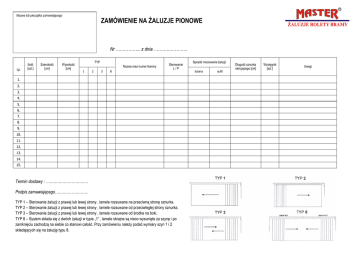 Nazwa lub pieczątka zamawiającego ZAMÓWIENIE NA ŻALUZJE PIONOWE Nr ……………... z dnia …………………… Lp. Ilość [szt.] Szerokość [cm] Wysokość [cm] TYP 1 2 Nazwa oraz numer tkaniny 3 8 Sterowanie L/P 1. 2. 3. 4. 5. 6. 7. 8. 9. 10. 11. 12. 13. 14. 15. Termin dostawy : …………………………… Podpis zamawiającego…………………….. TYP 1 – Sterowanie żaluzji z prawej lub lewej strony , lamele rozsuwane na przeciwną stronę sznurka. TYP 2 – Sterowanie żaluzji z prawej lub lewej strony , lamele rozsuwane od przeciwległej strony sznurka. TYP 3 – Sterowanie żaluzji z prawej lub lewej strony , lamele rozsuwane od środka na boki. TYP 8 – System składa się z dwóch żaluzji w typie „1” , lamele skrajne są nieco wysunięte za szynę i po zamknięciu zachodzą na siebie co stanowi całość. Przy zamówieniu należy podać wymiary szyn 1 i 2 składających się na żaluzję typu 8. Sposób mocowania żaluzji ściana sufit Długość sznurka sterującego [cm] Wysięgnik [szt.] Uwagi