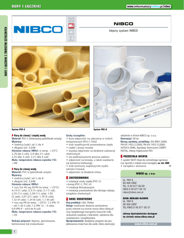 rury i łączniki / nibco www. rury i łączniki z tworzyw sztucznych NIBCO klejony system NIBCO System PVC-C ◗ Rury do zimnej i ciepłej wody Materiał: PVC-C (chlorowany polichlorek winylu) Wymiary: • średnica [cale]: od ½ do 4 • długość [m]: 3,048 Ciśnienie robocze [MPa]: w temp. +23°C: 2,76 (do 2 cali); 2,9 (dla 2½ cala); 2,55 (dla 3 cali); 2,21 (dla 4 cali) Maks. temperatura robocza czynnika [°C]: +80 ◗ Rury do zimnej wody Materiał: PVC-U (polichlorek winylu) Wymiary: • średnica [cale]: od ½ do 8 • długość [m]: 3,048 Ciśnienie robocze [MPa]: • rury Sch 40 wg ASTM (w temp. +23°C): 4,14 (½ cala); 3,3 (¾ cala); 3,1 (1 cal); 2,55 (1¼ cala); 2,28 (1½ cala); 1,93 (2 cale); 2,07 (2½ cala); 1,79 (3 cale); 1,52 (4 cale); 1,24 (6 cali); 1,1 (8 cali) • rury wg PN (w temp. +25°C): 1,5 (PN 15 – od ½ do 3 cali), 1,2 (PN 12 – 4 cale), 0,9 (PN 9 – od 6 do 8 cali) Maks. temperatura robocza czynnika [°C]: +45 Rodzaje połączeń: klejone, gwintowane, kołnierzowe lub śrubunkowe System PVC-U Cechy szczególne: • duża odporność na uderzenia w niskich temperaturach (PVC-C FGG) • niski współczynnik przewodzenia ciepła • szybki i prosty montaż • wysoka odporność na działanie substancji chemicznych • nie podtrzymywanie procesu palenia • odporność na korozję, a także osadzanie się kamienia kotłowego • niski termiczny współczynnik wydłużalności liniowej • odporność na działanie chloru ■ ZASTOSOWANIE • instalacje wody ciepłej (PVC-C) i zimnej (PVC-C, PVC-U) • instalacje klimatyzacyjne • instalacje przemysłowe dla różnego rodzaju związków chemicznych ■ DANE DODATKOWE Kraj produkcji: USA, Polska Usługi: możliwość złożenia zamówienia przez internet na stronie www.nibco-sklep.pl oraz bezpłatnego transportu (warunki indywidualnie ustalane z klientem), szkolenia dla instalatorów i projektantów Oprogramowanie: bezpłatny program do projektowania Instal San dla osób, które ukończyły szkolenie w firmie NIBCO sp. z o.o. Gwarancja: 50 lat Normy, aprobaty, certyfikaty: ISO 9001:2000, PN-EN 1452-2:2000, PN-EN 1452-3:2000, ASTM D-2846, Aprobaty Techniczne COBRTI INSTAL, Atesty Higieniczne PZH ■ PozostaŁa oferta • system NEXT-Heat do centralnego ogrzewania, łączniki z miedzi oraz mosiądzu ➥ str. XXX ■ • narzędzia i akcesoria NIBCO sp. z o.o. UL. PKP 6 92-402 ŁÓDŹ TEL. 0 42 677 56 00 FAKS 0 42 677 56 10 [email protected] dział obsługi klienta UL. PKP 6 92-402 ŁÓDŹ TEL./FAKS 0 42 677 56 31 adresy dystrybutorów dostępne na stronie www.nibco.com.pl www.nibco.com.pl rury i łączniki z tworzyw sztucznych rury i łączniki System PVC-U System PVC-C System NEXT-Heat Złączki z miedzi i mosiądzu INFORMATOR INSTALACYJNY-murator 2009