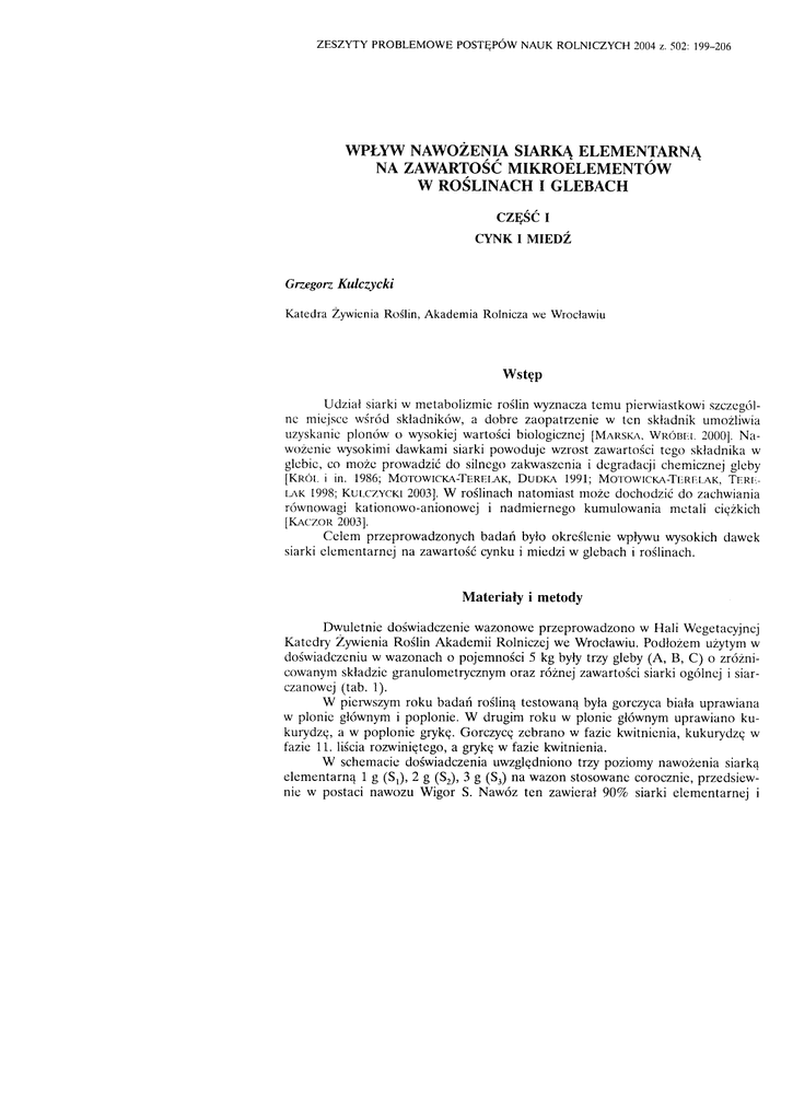 KULCZYCKI G. 2004. Wpływ nawożenia siarką elementarną na