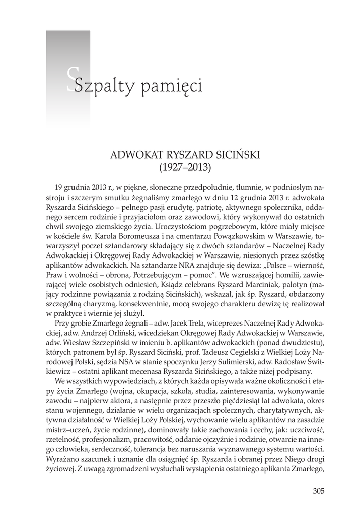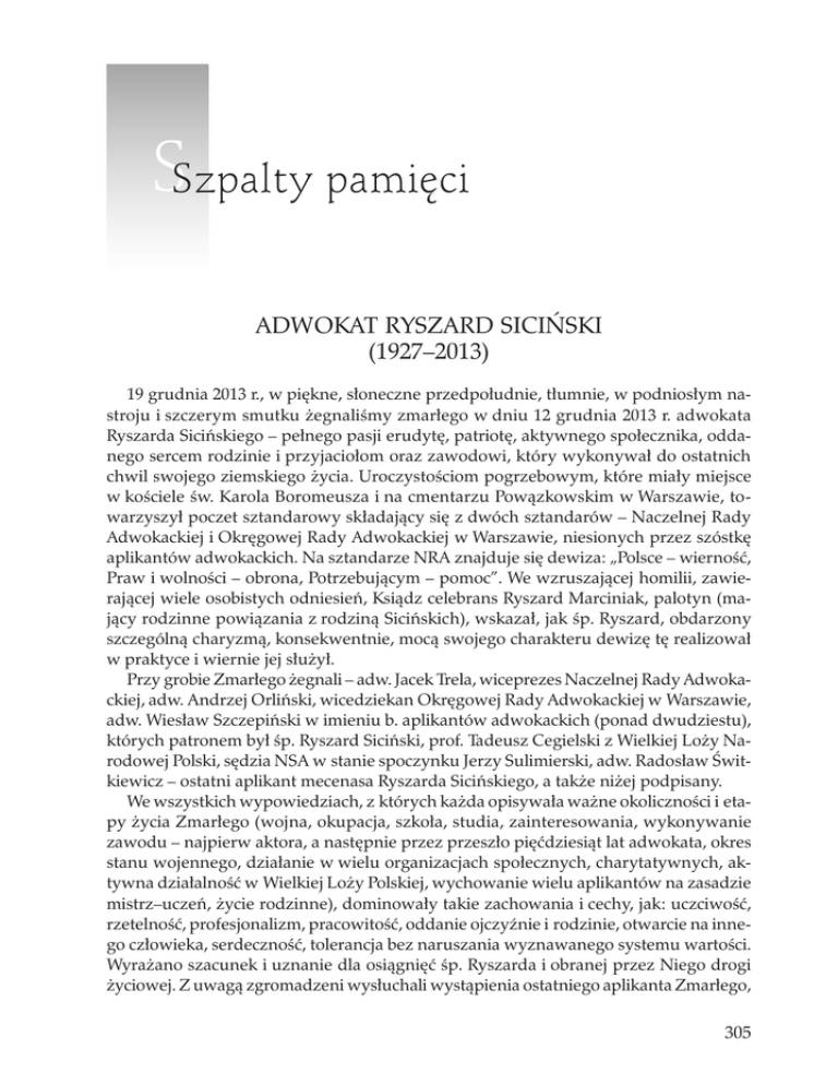 SSzpalty pamięci Adwokat Ryszard Siciński (1927–2013) 19 grudnia 2013 r., w piękne, słoneczne przedpołudnie, tłumnie, w podniosłym nastroju i szczerym smutku żegnaliśmy zmarłego w dniu 12 grudnia 2013 r. adwokata Ryszarda Sicińskiego – pełnego pasji erudytę, patriotę, aktywnego społecznika, oddanego sercem rodzinie i przyjaciołom oraz zawodowi, który wykonywał do ostatnich chwil swojego ziemskiego życia. Uroczystościom pogrzebowym, które miały miejsce w kościele św. Karola Boromeusza i na cmentarzu Powązkowskim w Warszawie, towarzyszył poczet sztandarowy składający się z dwóch sztandarów – Naczelnej Rady Adwokackiej i Okręgowej Rady Adwokackiej w Warszawie, niesionych przez szóstkę aplikantów adwokackich. Na sztandarze NRA znajduje się dewiza: „Polsce – wierność, Praw i wolności – obrona, Potrzebującym – pomoc”. We wzruszającej homilii, zawierającej wiele osobistych odniesień, Ksiądz celebrans Ryszard Marciniak, palotyn (mający rodzinne powiązania z rodziną Sicińskich), wskazał, jak śp. Ryszard, obdarzony szczególną charyzmą, konsekwentnie, mocą swojego charakteru dewizę tę realizował w praktyce i wiernie jej służył. Przy grobie Zmarłego żegnali – adw. Jacek Trela, wiceprezes Naczelnej Rady Adwokackiej, adw. Andrzej Orliński, wicedziekan Okręgowej Rady Adwokackiej w Warszawie, adw. Wiesław Szczepiński w imieniu b. aplikantów adwokackich (ponad dwudziestu), których patronem był śp. Ryszard Siciński, prof. Tadeusz Cegielski z Wielkiej Loży Narodowej Polski, sędzia NSA w stanie spoczynku Jerzy Sulimierski, adw. Radosław Świtkiewicz – ostatni aplikant mecenasa Ryszarda Sicińskiego, a także niżej podpisany. We wszystkich wypowiedziach, z których każda opisywała ważne okoliczności i etapy życia Zmarłego (wojna, okupacja, szkoła, studia, zainteresowania, wykonywanie zawodu – najpierw aktora, a następnie przez przeszło pięćdziesiąt lat adwokata, okres stanu wojennego, działanie w wielu organizacjach społecznych, charytatywnych, aktywna działalność w Wielkiej Loży Polskiej, wychowanie wielu aplikantów na zasadzie mistrz–uczeń, życie rodzinne), dominowały takie zachowania i cechy, jak: uczciwość, rzetelność, profesjonalizm, pracowitość, oddanie ojczyźnie i rodzinie, otwarcie na innego człowieka, serdeczność, tolerancja bez naruszania wyznawanego systemu wartości. Wyrażano szacunek i uznanie dla osiągnięć śp. Ryszarda i obranej przez Niego drogi życiowej. Z uwagą zgromadzeni wysłuchali wystąpienia ostatniego aplikanta Zmarłego, 305 Szpalty pamięci PALESTRA który w słowach pełnych emocji wyraził podziw i uznanie dla wiedzy i doświadczenia Patrona oraz szacunek dla Jego etycznych zachowań i pełnego zaangażowania w prowadzonych sprawach. Wyraził swoją wdzięczność oraz uczucie miłości synowskiej za wszystko, co dla niego śp. Patron uczynił. Ryszard Stanisław Siciński urodził się 15 lipca 1927 r. w Warszawie, w rodzinie inteligenckiej. Ukończył gimnazjum W. Górskiego i liceum S. Batorego. W czasie okupacji był żołnierzem Armii Krajowej ps. „Cedro”. Brał udział w „Małym Sabotażu”, w Powstaniu Warszawskim i w walkach partyzanckich w Kampinosie w oddziale „Znicza”. Został odznaczony przez Rząd w Londynie Medalem Wojska i Krzyżem Armii Krajowej. Po wojnie przez pewien czas był aktorem i członkiem ZASP-u. Ukończył Wydział Prawa Uniwersytetu Warszawskiego. W 1957 r. został wpisany na listę adwokatów w Warszawie. Był członkiem, a następnie zastępcą kierownika w Zespole Adwokackim nr 7 w Warszawie. Od 1992 r. wykonywał zawód w indywidualnej kancelarii adwokackiej w Warszawie. Specjalizował się w prawie cywilnym, był wybitnym znawcą prawa prasowego i wydawniczego. Kiedy zachodziła konieczność, występował, i to z wielkimi sukcesami, również w sprawach karnych, w szczególności w procesach politycznych po wydarzeniach marcowych i w stanie wojennym. Współpracował z Prymasowskim Komitetem Pomocy Uwięzionym. Udzielał niezbędnej i często skutecznej pomocy ludziom bezprawnie pozbawianym pracy i tym samym środków utrzymania ich rodzin. Pełnił liczne funkcje w samorządzie adwokackim, i to zarówno w organach samorządowych Izby warszawskiej, jak i w centralnych organach Adwokatury. Był wielokrotnie wybierany do Okręgowej Rady Adwokackiej, gdzie pełnił funkcje sekretarza i skarbnika oraz przewodniczącego lub wiceprzewodniczącego wielu komisji: etyki i wykonywania zawodu, informacyjno-prasowej, socjalno-bytowej, pracy społecznej, współpracy z zagranicą, ds. remontów i adaptacji lokali przy ORA, samopomocy koleżeńskiej i sanatoryjnej. Brał udział w charakterze wykładowcy w procesie szkolenia aplikantów adwokackich i doskonalenia zawodowego adwokatów. Był przewodniczącym Komisji Rewizyjnej oraz Koła Seniorów przy ORA. W organach centralnych Adwokatury wchodził w skład Prezydium Naczelnej Rady Adwokackiej, pełniąc funkcję skarbnika, a ponadto był także wiceprezesem Wyższego Sądu Dyscyplinarnego. W latach 2003–2006 Ryszard Siciński pełnił godność Wielkiego Mistrza Wielkiej Loży Polskiej. Był również członkiem komitetów redakcyjnych czasopism prawniczych „Gazety Prawniczej” i „Palestry”. Pisał artykuły i sprawozdania z różnych wydarzeń prawniczych. Za swoją działalność społeczną i zawodową był odznaczony Złotym Krzyżem Zasłu Szczegółowy biogram Zmarłego ukaże się w tomie III „Słownika Biograficznego Adwokatów Polskich”. 306 1–2/2014 Szpalty pamięci gi, Medalem Pamiątkowym Ministra Sprawiedliwości z okazji 30-lecia powstania NSZZ „Solidarność”, odznaką samorządową „Adwokatura Zasłużonym” i innymi. Po wygłoszeniu przemówień pożegnalnych, odmówieniu przez Księdza celebransa stosownych modlitw i złożeniu Ciała Zmarłego do grobu rozpoczęło się składanie przez uczestniczących w ceremonii pogrze