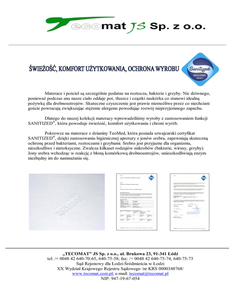 Materace i pościel są szczególnie podatne na roztocza, bakterie i grzyby. Nic dziwnego, ponieważ podczas snu nasze ciało oddaje pot, tłuszcz i cząstki naskórka co stanowi idealną pożywkę dla drobnoustrojów. Skuteczne czyszczenie jest prawie niemożliwe przez co niechciani goście powracają zwiększając stężenie alergenu powodując rozwój nieprzyjemnego zapachu. Dlatego do naszej kolekcji materacy wprowadziliśmy wyroby z zastosowaniem funkcji SANITIZED®, która powoduje świeżość, komfort użytkowania i chroni wyrób. Pokrowce na materace z dzianiny TeoMed, która posiada szwajcarski certyfikat SANITIZED®, dzięki zastosowaniu higienicznej apretury z jonów srebra, zapewniają skuteczną ochronę przed bakteriami, roztoczami i grzybami. Srebro jest przyjazne dla organizmu, nieszkodliwe i nietoksyczne. Zwalcza kilkaset rodzajów mikrobów (bakterie, wirusy, grzyby). Jony srebra wchodząc w reakcję z błoną komórkową drobnoustrojów, unieszkodliwiają enzym niezbędny im do namnażania się. „TECOMAT” JS Sp. z o.o., ul. Brukowa 23, 91-341 Łódź tel: /+ 0048 42 640-70-65, 640-75-58; fax: /+ 0048 42 640-75-74, 640-75-73 Sąd Rejonowy dla Łodzi-Śródmieścia w Łodzi XX Wydział Krajowego Rejestru Sądowego /nr KRS 0000348768/ www.tecomat.com.pl; e-mail: [email protected] NIP: 947-19-67-054 Właściwości wyrobu dzięki zastosowaniu apretury SANITIZED® Trwała i skuteczna ochrona przed bakteriami, roztoczami i grzybami Zapobieganie powstawaniu nieprzyjemnego zapachu Przedłużona trwałość wyrobu Niezawodna świeżość, higiena i komfort użytkowania Zachowanie właściwości antybakteryjnych i antygrzybiczych nawet po wielokrotnym praniu „TECOMAT” JS Sp. z o.o., ul. Brukowa 23, 91-341 Łódź tel: /+ 0048 42 640-70-65, 640-75-58; fax: /+ 0048 42 640-75-74, 640-75-73 Sąd Rejonowy dla Łodzi-Śródmieścia w Łodzi XX Wydział Krajowego Rejestru Sądowego /nr KRS 0000348768/ www.tecomat.com.pl; e-mail: [email protected] NIP: 947-19-67-054
