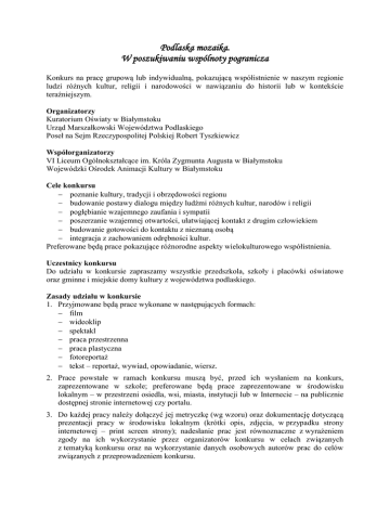 Podlaska mozaika. W poszukiwaniu wspólnoty pogranicza Konkurs na pracę grupową lub indywidualną, pokazującą współistnienie w naszym regionie ludzi różnych kultur, religii i narodowości w nawiązaniu do historii lub w kontekście teraźniejszym. Organizatorzy Kuratorium Oświaty w Białymstoku Urząd Marszałkowski Województwa Podlaskiego Poseł na Sejm Rzeczypospolitej Polskiej Robert Tyszkiewicz Współorganizatorzy VI Liceum Ogólnokształcące im. Króla Zygmunta Augusta w Białymstoku Wojewódzki Ośrodek Animacji Kultury w Białymstoku Cele konkursu poznanie kultury, tradycji i obrzędowości regionu budowanie postawy dialogu między ludźmi różnych kultur, narodów i religii pogłębianie wzajemnego zaufania i sympatii poszerzanie wzajemnej otwartości, ułatwiającej kontakt z drugim człowiekiem budowanie gotowości do kontaktu z nieznaną osobą integracja z zachowaniem odrębności kultur. Preferowane będą prace pokazujące różnorodne aspekty wielokulturowego współistnienia. Uczestnicy konkursu Do udziału w konkursie zapraszamy wszystkie przedszkola, szkoły i placówki oświatowe oraz gminne i miejskie domy kultury z województwa podlaskiego. Zasady udziału w konkursie 1. Przyjmowane będą prace wykonane w następujących formach: film wideoklip spektakl praca przestrzenna praca plastyczna fotoreportaż tekst – reportaż, wywiad, opowiadanie, wiersz. 2. Prace powstałe w ramach konkursu muszą być, przed ich wysłaniem na konkurs, zaprezentowane w szkole; preferowane będą prace zaprezentowane w środowisku lokalnym – w przestrzeni osiedla, wsi, miasta, instytucji lub w Internecie – na publicznie dostępnej stronie internetowej czy portalu. 3. Do każdej pracy należy dołączyć jej metryczkę (wg wzoru) oraz dokumentację dotyczącą prezentacji pracy w środowisku lokalnym (krótki opis, zdjęcia, w przypadku strony internetowej – print screen strony); nadesłanie prac jest równoznaczne z wyrażeniem zgody na ich wykorzystanie przez organizatorów konkursu w celach związanych z tematyką konkursu oraz na wykorzystanie danych osobowych autorów prac do celów związanych z przeprowadzeniem konkursu. 4. Prace powinny dotyczyć działań realizowanych w latach 2012/2013 i 2013/2014 i nienagrodzonych we wcześniejszych edycjach konkursu. 5. Konkurs trwa do końca marca 2014 r. 6. Nieprzekraczalny termin nadsyłania prac: 11 kwietnia 2014 r.; prace, które wpłyną po tym terminie, nie będą uwzględnione. 7. Prace należy nadsyłać na adres: VI Liceum Ogólnokształcące im. Króla Zygmunta Augusta w Białymstoku, ul. Warszawska 8, 15-063 Białystok z dopiskiem: „praca konkursowa” 8. Prace oceni komisja konkursowa, w skład której będą wchodzić osoby wskazane przez organizatorów. 9. Dla autorów najlepszych prac gwarantujemy atrakcyjne nagrody indywidualne i zespołowe. 10. Po ogłoszeniu wyników konkursu autorzy prac konkursowych mogą odebrać je nie później niż 26 czerwca 2014 r.; po tym terminie o przeznaczeniu nieodebranych prac zdecydują organizatorzy. SERDECZNIE ZAPRASZAMY DO UCZESTNICTWA! Załącznik do regulaminu konkursu „Podlaska mozaika. W poszukiwaniu wspólnoty pogranicza” Metryczka pracy konkursowej Tytuł pracy: Imię i nazwisko autora (imiona i nazwiska autorów): Klasa: Imię i nazwisko opiekuna: Krótki opis pracy (w wypadku filmu także czas jego trwania): Dane adresowe szkoły: pełna nazwa szkoły (łącznie z patronem szkoły): miejscowość: kod pocztowy: nazwa ulicy i numer: numer telefonu: Imię i nazwisko dyrektora szkoły: Oświadczenia rodzica (opiekuna prawnego) ucznia lub pełnoletniego ucznia – autora pracy: Wyrażam zgodę na wykorzystanie mojej pracy* / pracy mojego dziecka**, złożonej na konkurs „PODLASKA MOZAIKA. W POSZUKIWANIU WSPÓLNOTY POGRANICZA”, przez organizatorów konkursu w celach związanych z jego tematyką. Wyrażam zgodę na wykorzystanie moich danych osobowych* / danych osobowych mojego dziecka** w celach związanych z organizacją konkursu. * dotyczy osoby pełnoletniej; ** dotyczy rodziców (prawnych opiekunów) osoby niepełnoletniej ………………………………………………………. czytelny podpis rodzica (opiekuna prawnego) ucznia lub pełnoletniego ucznia