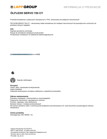 INFORMACJA O PRODUKCIE ÖLFLEX® SERVO 720 CY Przewód enkoderowy z płaszczem zewnętrznym z PVC, ekranowany do połączeń nieruchomych ÖLFLEX® SERVO 720 CY – ekranowany kabel enkoderowy do instalacji nieruchomych lub sporadycznie ruchomych do produkcji różnych napędów Info Sygnały sprzężenia zwrotnego Pasuje do enkoderów wiodących producentów W obszarach wrażliwych na zakłócenia elektromagnetyczne Sygnały zakłócające Korzyści Cienki, lekki, niezawodna funkcjonalność Łatwa instalacja Całkowite ekranowanie zmniejsza zakłócenia z sąsiednich przewodów Zakres zastosowania Enkodery analogowe i inkrementalne w serwonapędach Połączenia nieruchome i sporadycznie ruchome Pomiary, regulacja i sieci elektryczne Budowa maszyn i instalacji przemysłowych Na wolnym powietrzu tylko z ochroną przed działaniem promieniowania UV i pod warunkiem przestrzegania zakresu temperatury Cechy produktu Samogasnący (IEC 60332-1-2) Ostania aktualizacja (27.02.2017) ©2017 Lapp Group - all rights reserved. Zarządzanie produktem http://lapppoland.lappgroup.com Aktualne dane w pliku Dane techniczne. PN 0456 / 02_03.16 INFORMACJA O PRODUKCIE ÖLFLEX® SERVO 720 CY Normy i aprobaty Żyła zgodna z VDE 0812/0285 Płaszcz zewnętrzny zgodny z VDE 0250/0285 Ten wyrób jest oznaczony jako odpowiedni do stosowania w zakresie napięć < 50 V AC lub 75 V DC. Dlatego nie ma tutaj zastosowania Dyrektywa Niskonapięciowa (EWG) Budowa produktu Żyła cienkodrutowa z czystej miedzi Izolacja żyły: na bazie PVC Identyfikacja zgodnie z kodem kolorów patrz "Dane techniczne" Żyły i pary skręcone razem Ekran z plecionki z drucików z ocynowanej miedzi (*z drutem uziemiającym) Płaszcz z PVC, szary (RAL 7001) Dane techniczne Klasyfikacja: ETIM 5.0 Class-ID: EC000104 Opis klasy ETIM 5.0: Przewód sterowniczy Oznaczenie żył: 0036170 pary: rd/bk, bn/gn, gy/pk, bl/vt; żyły pojedyncze: wt, bn0036175 żyły 0.14: wt, bn, gn, ye, gy, pk, bl, rd, bk, vt; żyły 0.5: wt, bn0036177 żyły 0.14: wt, bn, gn, ye, gy, pk, bl, rd, bk, vt; żyły 0.5: wt, bn, bl, bk 0036178 żyły 0.5: wh, bn, gn, ye; żyły 0.14 DIN 47100 od koloru szarego 0036181 pary 0.14: rd/bk, bn/gn, ye/vt, gy/pk; żyła pojedyncza 0.5: wh, bl, wtgn, bngn 0036168 pary: 0.14 gn/ye, rd/bl, gy/pk; żyła pojedyncza 0.5: wt, bn Szczytowe napięcie robocze: 350 V Uss (nie do zastosowań silnoprądowych) Napięcie nominalne: 48 V AC Budowa żyły: Z cienkich drucików według VDE 0295, klasa 5/IEC 60228, klasa 5 od 0,5 mm² Minimalny promień gięcia: Połączenia sporadycznie ruchome: 20 x średnica zewnętrzna Połączenia nieruchome: 6 x średnica zewnętrzna Napięcie próbne: Żyła/żyła: 2000 V żyła/ekran: 1000 V Zakres temperatury: Połączenia sporadycznie ruchome: od -5°C do +70°C Połączenia nieruchome: od -40°C do +80°C Wskazówka Wszystkie podane wartości dotyczące produktów są wartościami nominalnymi (o ile nie wskazano inaczej). Inne wartości, takie jak np. tolerancje mogą być przedstawione na zamówienie (jeżeli są dostępne i przeznaczone do publikacji). Standardowe odcinki proszę sprawdzić na: www.lapppolska.pl Rodzaj opakowania: krążek ≤ 30 kg lub ≤ 250 m, w przeciwnym razie bęben Prosimy określić wielkość opakowania (np. 1 x 500 m bęben lub 5 x 100 m krążek) Fotografie nie mogą być używane do wymiarowania oraz nie stanowią szczegółowego odwzorowania przedstawionych produktów. * Podane ceny to ceny netto bez podatku VAT i dodatkowych opłat. Sprzedaż klientom biznesowym. Ostania aktualizacja (27.02.2017) ©2017 Lapp Group - all rights reserved. Zarządzanie produktem http://lapppoland.lappgroup.com Aktualne dane w pliku Dane techniczne. PN 0456 / 02_03.16 Powered by TCPDF (www.tcpdf.org) Liczba żył i przekrój [mm²] Średnica zewnętrzna [mm] Indeks miedzi [kg/km] Waga [kg/km] 0036170 4 x 2 x 0,25 + 2 x 1,0 * 8,9 70,8 128 0036175 10 x 0,14 + 2 x 0,5 7,9 39,3 88 0036177 10 x 0,14 + 4 x 0,5 8 51,1 94 0036178 15 x 0,14 + 4 x 0,5 8,7 59,7 125 0036181 4 x 2 x 0,14 + 4 x 0,5 8,1 48,8 95 0036168 3 x (2 x 0,14) + 2 x (0,5) 8,5 67 129 ÖLFLEX® SERVO 720 CY ÖLFLEX® SERVO 720 CY Ostania aktualizacja (27.02.2017) ©2017 Lapp Group - all rights reserved. Zarządzanie produktem http://lapppoland.lappgroup.com Aktualne dane w pliku Dane techniczne. PN 0456 / 02_03.16 INFORMACJA O PRODUKCIE Powered by TCPDF (www.tcpdf.org) Numer katalogowy