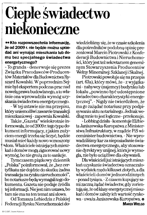 Cieple świadectwo niekonieczne wiedzieliśmy się, że w czasie szkolenia dla pośredników podobną opinię prezentował Marcin Piotrowski z Konfederacji Budownictwa i Nieruchomości, któryjest też sekretarzem general- To granda - denerwuje się prezes nym Stowarzyszenia Producentów Związku Pracodawców-Producen- Wełny Mineralnej: Szklanej i Skalnej. tów Materiałów dla Budownictwa RyPiotrowski powołuje się na przepis szard Kowalski. W poprzednim Sej- (art. 63a), który mówi, że - z wyjątkamie był ekspertem podczas prac nad mi - nabywcy (najemcy) budynku lub nowelą prawa budowlanego, a to wła- lokalu „powinno być udostępnione śnie ona wprowadziła wymóg uzy- świadectwo charakterystyki energeskania świadectwa energetycznego. tycznej". - Nigdy nie twierdziłem, że - W tej ustawie nie ma przepisu, ma go zażądać notariusz przy podpiktóry uniemożliwi zawarcie transakcji sywaniu aktu notarialnego. Jednak wemieszkaniowej - zapewnia Kowalski. dług mnie to jest logiczne - przekonuje. Także „Gazeta" wielokrotnie in- Lobbing działa - komentuje Elżbieformowała, że od 2009 r. tego typu do- ta Janiszewska-Kuropatwa z Ministerkument informujący, zjakim zuży- stwa Infrastruktury, w rządzie PiS wiciem energii trzeba się liczyć, będzie ceminister budownictwa - Nie wpromusiał mieć każdy nowo wznoszony wadziliśmy kar za nieposiadanie świa••dom. Właściciele istniejących miesz- dectwa energetycznego, aby stosowakań i domów mogą zignorować nowy nie dyrektywy unijnej, któraje wymowymóg, bo nie grożą za to sankcje. gła, nie było uciążliwe dla obywateli. Tymczasem piątkowy dziennik Dla właścicielijuż istniejących miesz„Polska" poinformował, że „bez cer- kań uzyskanie świadectwa oznaczałotyfikatu nie dojdzie do skutku żadna by wydatek rzędu kilkuset złotych, a dla transakcja na rynku nieruchomości", właścicieli domówjednorodzinnych bo notariusze będą wymagali tego do- - ponad tysiąca. - Z czasem kupujący sakumentu. Gazeta nie podaje źródła mi zaczną żądać świadectw, gdy zorientej informacji. Niejest nim ustawa, bo tują się, że od klasy energetycznej mieszkań i domów zależy ich wartość rynkotam nie ma na ten temat ani słowa. Od Tomasza Lebiedzia z Polskiej wa - uważa Janiszewska-Kuropatwa. o MAREK WIELGO Federacji Rynku Nieruchomości do•• Kto rozpowszechnia informację, że od 2009 r. nie będzie można sprzedać ani wynająć mieszkania lub domu bez specjalnego świadectwa energetycznego? B-12-2007, Gazeta Wybo