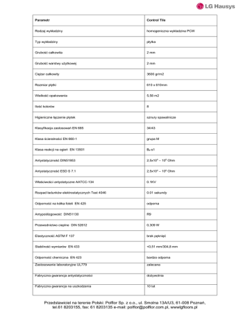 Parametr Control Tile Rodzaj wykładziny homogeniczna wykładzina PCW Typ wykładziny płytka Grubość całkowita 2 mm Grubość warstwy użytkowej 2 mm Ciężar całkowity 3600 gr/m2 Rozmiar płytki 610 x 610mm Wielkość opakowania 5,58 m2 Ilość kolorów 8 Higieniczne łączenie płytek sznury spawalnicze Klasyfikacja zastosowań EN 685 34/43 Klasa ścieralności EN 660-1 grupa M Klasa reakcji na ogień EN 13501 Bfl-s1 Antystatyczność DIN51953 2,5x104 – 106 Ohm Antystatyczność ESD S 7.1 2,5x104 – 106 Ohm Właściwości antystatyczne AATCC-134 0.1KV Rozpad ładunków elektrostatycznych Test 4046 0.01 sekundy Odporność na kółka foteli EN 425 odporna Antypoślizgowość DIN51130 R9 Przewodnictwo cieplne DIN 52612 0,309 W Elastyczność ASTM F 137 brak pęknięć Stabilność wymiarów EN 433 <0,51 mm/304,8 mm Odporność chemiczna EN 423 bardzo odporna Zastosowanie laboratoryjne UL779 zalecana Fabryczna gwarancja antystatyczności dożywotnia Fabryczna gwarancja na uszkodzenia 10 lat Przedstawiciel na terenie Polski: Polflor Sp. z o.o., ul. Smolna 13A/U3, 61-008 Poznań, tel.61 8203155, fax: 61 8203135 e-mail: [email protected], wwwlgfloors.pl