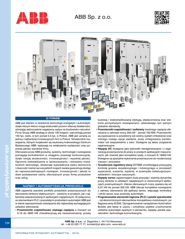ABB Sp. z o.o. O FIRMIE abb.automatykab2b.pl 154 ABB jest liderem w dziedzinie technologii energetyki i automatyki, dzięki którym klienci mogą doskonalić poziom własnej działalności, obniżając jednocześnie negatywny wpływ na środowisko naturalne. Firmy Grupy ABB działają w około 100 krajach i zatrudniają ponad 150 tys. osób, w tym ponad 3,5 tys. w Polsce. ABB jest uznana za jedną z najbardziej innowacyjnych firm w Polsce. Nowatorskie rozwiązania, których inicjatorem są naukowcy krakowskiego Centrum Badawczego ABB, wpływają na zwiększenie wydajności oraz poprawę jakości wyrobów firmy. Oferowane przez ABB produkty, systemy, technologie i rozwiązania pomagają kontrahentom w osiąganiu przewagi konkurencyjnej, dzięki swojej skuteczności, innowacyjności i wysokiej jakości. Ogromne doświadczenie w opracowywaniu i wdrażaniu nowatorskich technologii, doskonale wykształcona kadra techniczna i obecność niemal we wszystkich krajach świata gwarantują dostęp do najnowocześniejszych rozwiązań. Innowacyjność i jakość to dwie podstawowe cechy oferowanych przez firmę produktów oraz usług. NAPĘDY I AUTOMATYZACJA PRODUKCJI ABB zapewnia szerokie portfolio produktów przeznaczonych do sterowania silnikami elektrycznymi – zarówno w prostych, jak i najbardziej zaawansowanych aplikacjach napędowych. W połączeniu ze sterownikami PLC i pozostałymi produktami automatyki ABB jest w stanie zaproponować rozwiązanie dla najbardziej wymagających układów sterowania: Przemienniki częstotliwości niskiego napięcia o mocach od 0,18 do 5600 kW charakteryzują się niezawodnością, prostą budową i nieskomplikowaną obsługą, elastycznością oraz wieloma pomysłowymi rozwiązaniami, ustanawiając tym samym globalne standardy. Przemienniki częstotliwości i softstarty średniego napięcia oferowane w zakresie mocy 250 kW – ponad 100 MW. Przemienniki są wyposażone w powietrzny lub wodny system chłodzenia oraz różnego rodzaju opcje zasilania: przez zintegrowany transformator lub bezpośrednio z sieci. Dostępne są także urządzenia regeneracyjne. Napędy DC dostępne jako jednostki nieregeneracyjne i z regeneracją przeznaczone do pracy w prostych aplikacjach maszynowych, jak również jako kompletne szafy, o mocach 9–18000 kW. Dostępne są specjalne wykonania przeznaczone do modernizacji maszyn i procesów. Tyrystorowe regulatory mocy DCT880 umożliwiające precyzyjną kontrolę grzania rezystancyjnego i indukcyjnego w procesach wyżarzania, suszenia, topienia, w przemyśle metalurgicznym, szklarskim i tworzyw sztucznych. Napędy serwo zapewniające dużą precyzję i wysoką dynamikę pracy silników w układach napędowych w różnorodnych aplikacjach przemysłowych. Zakres oferowanych mocy zawiera się od 0,37 kW do ponad 350 kW. ABB oferuje kompletne rozwiązania z zakresu sterowania dla aplikacji serwo, włączając kontrolery i silniki serwo oraz produkty automatyki. Programowalne sterowniki logiczne (PLC) i panele operatorskie – od ekonomicznych sterowników kompaktowo-modułowych, po flagową serię AC500. Oprogramowanie narzędziowe Automation Builder jest łatwe w użyciu i umożliwia szybkie uruchomienie układów automatyki opartych o sterowniki, napędy, panele operatorskie i technologie komunikacyjne. ABB Sp. z o.o., ul. Żegańska 1, 04-713 W arszawa tel. +48 22 223 77 77, [email protected], www.abb.pl I N F O R M AT O R R Y N KO W Y AU T O M AT Y K I 2016 SILNIKI I GENERATORY To szerokie spektrum sprawdzonych, niezawodnych i wysoko sprawnych produktów. Portfolio silników asynchronicznych klatkowych niskiego napięcia obejmuje rozwiązania w klasach sprawności IE2, IE3 oraz IE4 przeznaczone do stref bezpiecznych oraz do stref zagrożonych wybuchem gazów i pyłów. Uzupełnieniem tego zakresu są specjalne rozwiązania silnikowe, takie jak: synchroniczne silniki reluktancyjne, silniki z magnesami trwałymi, serwosilniki asynchroniczne HDP oraz rodzina silników trakcyjnych. Spektrum silników i generatorów średnionapięciowych to najwyższej jakości produkty, konfigurowane zgodnie z precyzyjnymi wymaganiami klienta i obejmujące maszyny asynchronicze o mocach do ponad 20 MW oraz synchroniczne o mocach do 75 MW. Pod marką Baldor ABB dostarcza kompletny zakres silników niskiego i średniego napięcia w standardzie NEMA, w tym specjalistyczne rozwiązania, takie jak: silniki do bezprzekładniowego napędu wentylatorów chłodni wentylatorowych, silniki w korpusach ze stali nierdzewnej dla przemysłu spożywczego oraz różnego rodzaju serwosilniki. Od 2008 roku w Polsce działa Centrum Aplikacji Zrobotyzowanych (PAC). Obszarem działania Centrum obejmuje całą Polskę oraz kraje Europy. Jego celem jest rozwijanie aplikacji pakowania, paletyzacji i pick & place (sortowania). Aplikacje te wykorzystywane są głównie w przemyśle spożywczym, a także drzewnym, kosmetycznym, farmaceutycznym czy w sektorze materiałów budowlanych. Centrum Aplikacji ABB oferuje wiele usług – od studium wykonalności projektu, poprzez testy na produktach klientów, przygotowywanie ofert zgodnie z wymaganiami zlecających oraz uruchomienie i wdrożenie skomplikowanych aplikacji na obiekcie. Centrum wspiera również integratorów zrobotyzowanych systemów. Obejmuje to nie tylko planowanie i projektowanie, ale również programowanie oraz uruchomienie całej instalacji, projektowanie chwytaków, testy laboratoryjne i wreszcie wypożyczanie robotów. W ofercie Centrum znajdują się również gotowe aplikacje – cele produkcyjne dla realizacji określonych zadań technologicznych. Wraz z przejęciem marki Dodge, spektrum rozwiązań ABB poszerzone zostało o zakres elementów mechanicznego przeniesienia napędu. Są to sprawdzone produkty w wykonaniach metrycznych oraz calowych obejmujące: oprawy łożyskowe z łożyskami kulkowymi, baryłkowymi, ślizgowymi i stożkowymi, szeroki zakres sprzęgieł obejmujący sprzęgła oponowe, elastyczn