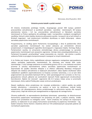 <Z:Ktz t/< W>EddKZMt dzdKE/h tĂƌƐnjĂǁĂ͕ĚŶŝĂϬϱŐƌƵĚŶŝĂϮϬϭϯ KƐƚĂƚŶŝĂƉƌŽƐƚĂďĂƚĂůŝŝŽƉŽůƐŬŝŵĞŶƚŽů t ŝŵŝĞŶŝƵ ƑƌŽĚŽǁŝƐŬĂ ƉŽůƐŬŝĞŐŽ ŚĂŶĚůƵ͕ ƐŬƵƉŝĂũČĐĞŐŽ ƉŽŶĂĚ ϱϬϬ ƚLJƐŝħĐLJ ƉŽůƐŬŝĐŚ ƉƌĂĐŽǁŶŝŬſǁ njĂƚƌƵĚŶŝŽŶLJĐŚ ǁ ƉƵŶŬƚĂĐŚ ƐƉƌnjĞĚĂǏLJ ǁLJƌŽďſǁ ƚLJƚŽŶŝŽǁLJĐŚ͕ ϲϬ ƚLJƐŝħĐLJ ƉůĂŶƚĂƚŽƌſǁ ƚLJƚŽŶŝƵ ŝ ϲ͕ϱ ƚLJƐ͘ ƉƌĂĐŽǁŶŝŬſǁ njĂƚƌƵĚŶŝŽŶLJĐŚ ǁ ĨĂďƌLJŬĂĐŚ ǁLJƌŽďſǁ ƚLJƚŽŶŝŽǁLJĐŚǁWŽůƐĐĞĂƉĞůƵũĞŵLJĚŽƉŽůƐŬŝĞŐŽƌnjČĚƵŝĞƵƌŽƉŽƐųſǁŽƉŽĚũħĐŝĞƐnjĐnjĞŐſůŶLJĐŚ ǁLJƐŝųŬſǁ͕ŬƚſƌLJĐŚĐĞůĞŵďLJųŽďLJƐŬƵƚĞĐnjŶĞƉŝůŶŽǁĂŶŝĞǁLJŶŝŬƵƚŽĐnjČĐLJĐŚƐŝħǁƚLJĐŚĚŶŝĂĐŚǁ ƌƵŬƐĞůŝ ŶĞŐŽĐũĂĐũŝ ŶĂĚ ŽƐƚĂƚĞĐnjŶLJŵ ŬƐnjƚĂųƚĞŵ ĚLJƌĞŬƚLJǁLJ ǁ ĐnjħƑĐŝ ĚŽƚLJĐnjČĐĞũ njĂŬĂnjƵ ƐƉƌnjĞĚĂǏLJƉĂƉŝĞƌŽƐſǁŵĞŶƚŽůŽǁLJĐŚ͘ WƌnjLJƉŽŵŝŶĂŵLJ͕ ǏĞ ǁĞĚųƵŐ ŽƉŝŶŝŝ WĂƌůĂŵĞŶƚƵ ƵƌŽƉĞũƐŬŝĞŐŽ nj ĚŶŝĂ ϴ ƉĂǍĚnjŝĞƌŶŝŬĂ ϮϬϭϯ ƐƉƌnjĞĚĂǏ ƉĂƉŝĞƌŽƐſǁ ŵĞŶƚŽůŽǁLJĐŚ ŵĂ njŽƐƚĂđ njĂŬĂnjĂŶĂ ƉŽ ŽƑŵŝŽůĞƚŶŝŵ ŽŬƌĞƐŝĞ ƉƌnjĞũƑĐŝŽǁLJŵ͘ŶŝĞƉŽŬŽũČĐLJĐŚƐLJŐŶĂųſǁĚŽĐŝĞƌĂũČĐLJĐŚnjŶĞŐŽĐũĂĐũŝŵŝħĚnjLJ<ŽŵŝƐũČ͕ZĂĚČĂ WĂƌůĂŵĞŶƚĞŵ ǁLJŶŝŬĂ͕ ǏĞ ƵƚƌnjLJŵĂŶŝĞ ŽƑŵŝŽůĞƚŶŝĞŐŽ ŽŬƌĞƐƵ ƉƌnjĞũƑĐŝŽǁĞŐŽ ŶĂ ƐƉƌnjĞĚĂǏ ƉĂƉŝĞƌŽƐſǁŵĞŶƚŽůŽǁLJĐŚũĞƐƚƉŽǁĂǏŶŝĞnjĂŐƌŽǏŽŶĞ͘/ƐƚŶŝĞũĞĚƵǏĞƉƌĂǁĚŽƉŽĚŽďŝĞŷƐƚǁŽ͕ǏĞ WĂƌůĂŵĞŶƚ ƵƌŽƉĞũƐŬŝ ͣƉƌnjĞŚĂŶĚůƵũĞ͟ ƐǁŽũĞ ƐƚĂŶŽǁŝƐŬŽ ǁƐ͘ ŵĞŶƚŽůŝ͕ ƚĂŬ ŝƐƚŽƚŶĞ nj ƉƵŶŬƚƵ ǁŝĚnjĞŶŝĂWŽůƐŬŝnjĂƉƌnjLJũħĐŝĞŬŽŵƉƌŽŵŝƐŽǁLJĐŚƌŽnjǁŝČnjĂŷǁŝŶŶLJĐŚĚnjŝĞĚnjŝŶĂĐŚ͘ ƚŽ WŽůƐŬĂ ũĞƐƚ ŬƌĂũĞŵ͕ ŬƚſƌLJ ŶĂũĚŽƚŬůŝǁŝĞũ ŽĚĐnjƵũĞ ŶĞŐĂƚLJǁŶĞ ŶĂƐƚħƉƐƚǁĂ ǁƉƌŽǁĂĚnjĞŶŝĂ njĂŬĂnjƵ ƐƉƌnjĞĚĂǏLJ ƉĂƉŝĞƌŽƐſǁ ŵĞŶƚŽůŽǁLJĐŚ͕ ďŽ ƐƚĂŶŽǁŝČ ŽŶĞ ŶŝĞŵĂů ϮϬй ƌLJŶŬƵ ƚLJƚŽŶŝŽǁĞŐŽ͘ƌĂĐũŝŶĂƐnjĞŐŽƉŽųŽǏĞŶŝĂŶĂǁƐĐŚŽĚŶŝĞũŐƌĂŶŝĐLJhƚŽƵŶĂƐƐŬŽŬŽǁŽǁnjƌŽƑŶŝĞ ƉƌnjĞŵLJƚ ǁ ƐLJƚƵĂĐũŝ ǁƉƌŽǁĂĚnjĞŶŝĂ njĂŬĂnjƵ ƐƉƌnjĞĚĂǏLJ ƉĂƉŝĞƌŽƐſǁ ŵĞŶƚŽůŽǁLJĐŚ ĐŽ ĚŽƉƌŽǁĂĚnjŝ ĚŽ ƐƉĂĚŬƵ ŽďƌŽƚſǁ ƐŬůĞƉſǁ Ă ǁ ĞĨĞŬĐŝĞ ĐĂųŬŽǁŝƚĞũ ůŝŬǁŝĚĂĐũŝ ŵŶŝĞũƐnjLJĐŚ ƐŬůĞƉſǁ ůƵď ƌĞĚƵŬĐũŝ njĂƚƌƵĚŶŝĞŶŝĂ ǁ ǁŝħŬƐnjLJĐŚ ƉůĂĐſǁŬĂĐŚ͘ ĂŬĂnj ďħĚnjŝĞ ƐŬƵƚŬŽǁĂđ ƚĂŬǏĞ ƌĂĚLJŬĂůŶLJŵ ƐƉĂĚŬŝĞŵ njĂƉŽƚƌnjĞďŽǁĂŶŝĂ ŶĂ ŬƌĂũŽǁLJ ƐƵƌŽǁŝĞĐ ƚLJƚŽŶŝŽǁLJ͕ Ă ĐŽ njĂ ƚLJŵ ŝĚnjŝĞ ƉŽŐŽƌƐnjĞŶŝĞŵƐŝħǁĂƌƵŶŬſǁďLJƚŽǁLJĐŚϲϬƚLJƐ͘ůƵĚnjŝƵƉƌĂǁŝĂũČĐLJĐŚƚĞŶƐƵƌŽǁŝĞĐǁϭϰ͕ϱƚLJƐ͘ ŐŽƐƉŽĚĂƌƐƚǁ ƌŽůŶLJĐŚ͕ ŐųſǁŶŝĞ ǁĞ ǁƐĐŚŽĚŶŝĐŚ ƌĞũŽŶĂĐŚ WŽůƐŬŝ njĂŐƌŽǏŽŶLJĐŚ ƐƚƌƵŬƚƵƌĂůŶLJŵ ďĞnjƌŽďŽĐŝĞŵ͘ ħĚnjŝĞ ƚĞǏ ƐƚĂŶŽǁŝų njĂŐƌŽǏĞŶŝĞ ĚůĂ ϲ͘ϱ ƚLJƐŝħĐLJ ŵŝĞũƐĐ ƉƌĂĐLJ ǁ ƉƌnjĞŵLJƑůĞ ƚLJƚŽŶŝŽǁLJŵ͕ŬƚſƌLJǁLJďƌĂųWŽůƐŬħũĂŬŽƐǁŽũĞĐĞŶƚƌƵŵƉƌŽĚƵŬĐLJũŶĞ͘ EĂǁĞƚ ŶĂũĚųƵǏƐnjLJ ŽŬƌĞƐ ƉƌnjĞũƑĐŝŽǁLJ ŶŝĞ ƌŽnjǁŝČǏĞ ƉƌŽďůĞŵſǁ nj ũĂŬŝŵŝ ƐƉŽƚŬĂ Ɛŝħ ƉŽůƐŬŝ ŚĂŶĚĞů͕ ƉůĂŶƚĂƚŽƌnjLJ ŝ ƉƌĂĐŽǁŶŝĐLJ ƉŽ ǁĞũƑĐŝƵ ǁ ǏLJĐŝĞ ƚĞũ ĚLJƌĞŬƚLJǁLJ͘ :ĞĚŶĂŬ ŬĂǏĚLJ ǁLJǁĂůĐnjŽŶLJ ƌŽŬ ŽďŽǁŝČnjLJǁĂŶŝĂ ŽŬƌĞƐƵ ƉƌnjĞũƑĐŝŽǁĞŐŽ ƚŽ ŽĚƌŽĐnjĞŶŝĞ ǁLJƌŽŬƵ ĚůĂ ŶĂƐnjLJĐŚ ŵŝĞũƐĐƉƌĂĐLJ͘^ƚČĚƚĂŬŝƐƚŽƚŶĞũĞƐƚnjĂĂŶŐĂǏŽǁĂŶŝĞǁŶĞŐŽĐũĂĐũĞĚŽƐĂŵĞŐŽŬŽŷĐĂ͘ ŚĐĞŵLJ ƉŽĚŬƌĞƑůŝđ͕ ǏĞ ǁƉƌŽǁĂĚnjĞŶŝĞ ĚLJƌĞŬƚLJǁLJ ƚLJƚŽŶŝŽǁĞũ ƐƉŽǁŽĚƵũĞ͕ǏĞĚŽƚLJĐŚĐnjĂƐŽǁŝ ŬŽŶƐƵŵĞŶĐŝ ƉĂƉŝĞƌŽƐſǁ ŵĞŶƚŽůŽǁLJĐŚ ŶŝĞ ƉƌnjĞƐƚĂŶČ ŝĐŚ ƉĂůŝđ͕ Ă ũĞĚLJŶŝĞ njŵŝĞŶŝČ ǍƌſĚųŽ njĂŬƵƉƵ ƚLJĐŚ ƉƌŽĚƵŬƚſǁ ŶĂ ŶŝĞůĞŐĂůŶLJ ƌLJŶĞŬ͘ dLJƚŽŷ ƐŵĂŬŽǁLJ ŶŝĞ njĂĐŚħĐĂ ĚŽ ƌŽnjƉŽĐnjħĐŝĂ ƉĂůĞŶŝĂ͕ǁǁŝħŬƐnjŽƑĐŝƚŽũƵǏƉĂůČĐLJŬŽŶƐƵŵĞŶĐŝƉƌnjĞĐŚŽĚnjČŶĂƉĂƉŝĞƌŽƐLJŵĞŶƚŽůŽǁĞʹǁŐ͘ ďĂĚĂŷŝŶƐƚLJƚƵƚƵ,ŽŵŽ,ŽŵŝŶŝnjŬǁŝĞƚŶŝĂϮϬϭϯĂǏϳϭйĂŶŬŝĞƚŽǁĂŶLJĐŚnjĂĐnjLJŶĂųŽƉĂůĞŶŝĞŽĚ ŶŽƌŵĂůŶLJĐŚƉĂƉŝĞƌŽƐſǁ͘ <Z:Ktz t/< W>EddKZMt dzdKE/h ZŽŬ ƚĞŵƵnjǁƌſĐŝůŝƑŵLJ Ɛŝħ nj ĂƉĞůĞŵ ĚŽWƌĞŵŝĞƌĂ ZWŽ ǁƐƉĂƌĐŝĞ ǁŶĞŐŽĐũĂĐũĂĐŚ ǁ ƌƵŬƐĞůŝ͘ njŝƑŶĂŽƐƚĂƚŶŝĞũƉƌŽƐƚĞũďĂƚĂůŝŝŽƉŽůƐŬŝŵĞŶƚŽůĂƉĞůƵũĞŵLJ͕ďLJnjƌŽďŝđǁƐnjLJƐƚŬŽŶŝĞƚƌĂĐČĐŶŝĐ njĚŽƚLJĐŚĐnjĂƐŽǁĞŐŽĚŽƌŽďŬƵ͘<ŽƌnjLJƐƚŶLJĚůĂWŽůƐŬŝŬƐnjƚĂųƚĚLJƌĞŬƚLJǁLJďLJųƐƵŬĐĞƐĞŵƉŽůƐŬŝĞũ ĚLJƉůŽŵĂĐũŝŝĞƵƌŽƉŽƐųſǁ͘dŽŽĚĂŬƚLJǁŶŽƑĐŝŝǁLJƚƌǁĂųŽƑĐŝƉŽůƐŬŝĞŐŽƌnjČĚƵĂůĞƚĞǏǁƐnjLJƐƚŬŝĐŚ ĞƵƌŽƉŽƐųſǁŶĂŽƐƚĂƚŶŝĞũƉƌŽƐƚĞũŶĞŐŽĐũĂĐũŝǁƌƵŬƐĞůŝnjĂůĞǏLJƉƌnjLJƐnjųŽƑđƐĞƚĞŬƚLJƐŝħĐLJŵŝĞũƐĐ ƉƌĂ