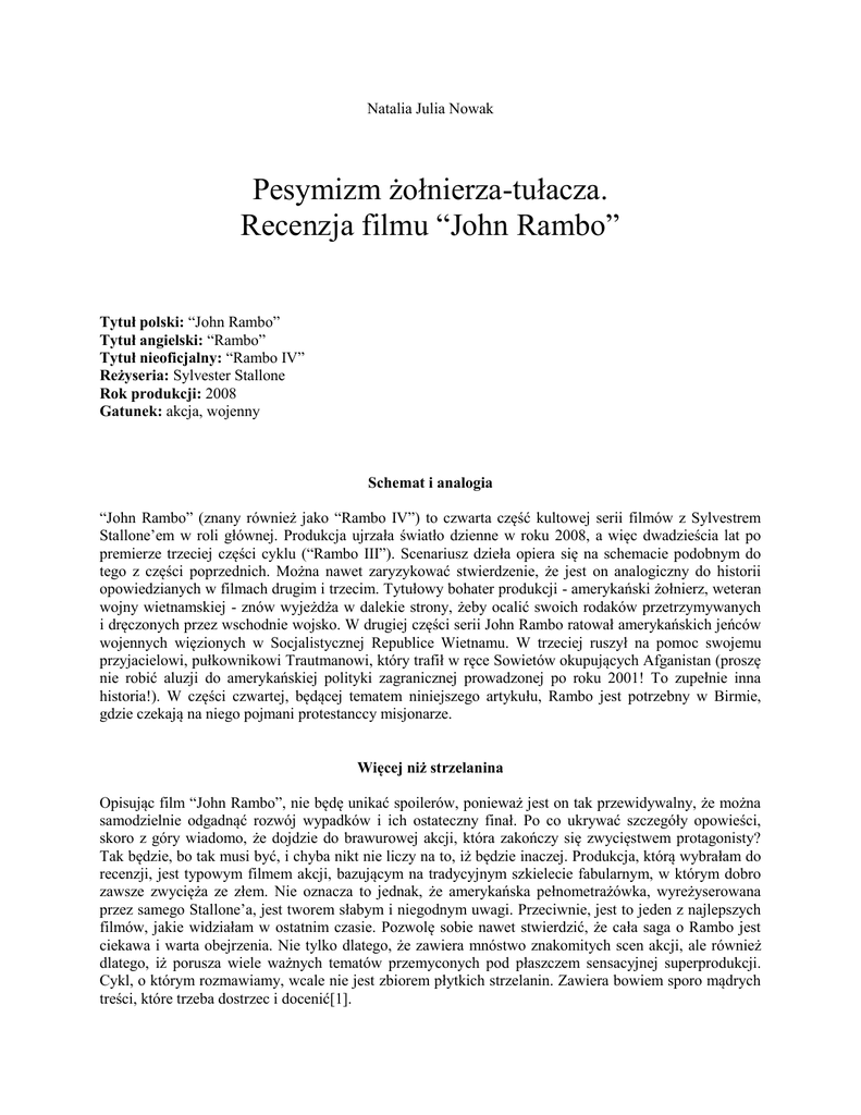 Natalia Julia Nowak Pesymizm żołnierza-tułacza. Recenzja filmu “John Rambo” Tytuł polski: “John Rambo” Tytuł angielski: “Rambo” Tytuł nieoficjalny: “Rambo IV” Reżyseria: Sylvester Stallone Rok produkcji: 2008 Gatunek: akcja, wojenny Schemat i analogia “John Rambo” (znany również jako “Rambo IV”) to czwarta część kultowej serii filmów z Sylvestrem Stallone’em w roli głównej. Produkcja ujrzała światło dzienne w roku 2008, a więc dwadzieścia lat po premierze trzeciej części cyklu (“Rambo III”). Scenariusz dzieła opiera się na schemacie podobnym do tego z części poprzednich. Można nawet zaryzykować stwierdzenie, że jest on analogiczny do historii opowiedzianych w filmach drugim i trzecim. Tytułowy bohater produkcji - amerykański żołnierz, weteran wojny wietnamskiej - znów wyjeżdża w dalekie strony, żeby ocalić swoich rodaków przetrzymywanych i dręczonych przez wschodnie wojsko. W drugiej części serii John Rambo ratował amerykańskich jeńców wojennych więzionych w Socjalistycznej Republice Wietnamu. W trzeciej ruszył na pomoc swojemu przyjacielowi, pułkownikowi Trautmanowi, który trafił w ręce Sowietów okupujących Afganistan (proszę nie robić aluzji do amerykańskiej polityki zagranicznej prowadzonej po roku 2001! To zupełnie inna historia!). W części czwartej, będącej tematem niniejszego artykułu, Rambo jest potrzebny w Birmie, gdzie czekają na niego pojmani protestanccy misjonarze. Więcej niż strzelanina Opisując film “John Rambo”, nie będę unikać spoilerów, ponieważ jest on tak przewidywalny, że można samodzielnie odgadnąć rozwój wypadków i ich ostateczny finał. Po co ukrywać szczegóły opowieści, skoro z góry wiadomo, że dojdzie do brawurowej akcji, która zakończy się zwycięstwem protagonisty? Tak będzie, bo tak musi być, i chyba nikt nie liczy na to, iż będzie inaczej. Produkcja, którą wybrałam do recenzji, jest typowym filmem akcji, bazującym na tradycyjnym szkielecie fabularnym, w którym dobro zawsze zwycięża ze złem. Nie oznacza to jednak, że amerykańska pełnometrażówka, wyreżyserowana przez samego Stallone’a, jest tworem słabym i niegodnym uwagi. Przeciwnie, jest to jeden z najlepszych filmów, jakie widziałam w ostatnim czasie. Pozwolę sobie nawet stwierdzić, że cała saga o Rambo jest ciekawa i warta obejrzenia. Nie tylko dlatego, że zawiera mnóstwo znakomitych scen akcji, ale również dlatego, iż porusza wiele ważnych tematów przemyconych pod płaszczem sensacyjnej superprodukcji. Cykl, o którym rozmawiamy, wcale nie jest zbiorem płytkich strzelanin. Zawiera bowiem sporo mądrych treści, które trzeba dostrzec i docenić[1]. Niespokojny duch “John Rambo” rozpoczyna się prezentacją materiałów dokumentalnych ukazujących najbardziej drastyczne aspekty wojny domowej, jaka toczy się od sześćdziesięciu lat na terenie Birmy (Azja Południowo-Wschodnia). Widz zostaje poinformowany o dramatycznej sytuacji Karenów: mniejszości etnicznej uciskanej przez birmańskie wojsko i bezskutecznie walczącej o niepodległość. Z materiałów wynika, że birmańscy żołnierze traktują Karenów z niebywałym okrucieństwem, nie oszczędzając kobiet, dzieci i mnichów. Gdy dokumentalny prolog dobiega końca, rozpoczyna się właściwa, fabularna część produkcji. Akcja przenosi się do sąsiedniej Tajlandii, gdzie od ponad dwudziestu lat mieszka główny bohater, John Rambo. Wypada odnotować, że Rambo mieszkał tam już w trzeciej części serii. Ten niespokojny duch, którego los zaprowadził aż do egzotycznej krainy, ima się bardzo różnych zajęć. O ile w części trzeciej pracował na budowie i uprawiał sporty walki, o tyle teraz zajmuje się łowieniem ryb, łapaniem węży, trochę kowalstwem i przeprawianiem ludzi przez rzekę. Tylko taki użytek może tutaj robić ze swoich największych atutów: sprytu, zręczności, odwagi i siły fizycznej. Małomówny samotnik Ludzie, otaczający tytułowego bohatera, nie mają pojęcia o jego heroicznych czynach z przeszłości. Nie wiedzą również, że ten małomówny samotnik potrafi - ilekroć zachodzi taka potrzeba - być brutalny, bezlitosny i nieustępliwy. Sam Rambo nie tylko nie chwali się swoimi dokonaniami, ale również unika opowiadania o sobie. Bohater nie ufa ludziom, bo ma zbyt wiele złych doświadczeń związanych z przedstawicielami tego gatunku. Tyle już przez nich wycierpiał, zarówno fizycznie, jak i psychicznie. Był katowany i upokarzany, doświadczał rażącej niesprawiedliwości, kiedyś został nawet oszukany i pozostawiony na pastwę losu. Poza tym, jako żołnierz niejednokrotnie stawał się naocznym świadkiem bezsensownego bestialstwa i bezwstydnego cynizmu. Jak on teraz ma ufać innym? Jak on ma być otwarty i życzliwy? Nikt mu nie wmówi, że ludzie są z natury dobrzy, a życie piękne. Zdanie o ludziach i życiu wyrobił sobie już dawno temu. Chociaż Rambo stara się funkcjonować normalnie, pewną ranę będzie miał już do końca swoich dni. To rana nieuleczalna: jak złe wspomnienia, jak wyrzuty sumienia. Tej rany, najcięższej ze wszystkich, nie widać gołym okiem, gdyż znajduje się na duszy. Żołnierz-tułacz John Rambo już w poprzednich częściach cyklu wydawał się introwertyczny, ale teraz sprawia wrażenie, jakby popadł w depresję i mizantropię. Często bywa przygnębiony, ale nie chce o tym rozmawiać ani otwarcie tego okazywać. Woli dusić wszystko w sobie, szukając pocieszenia w codziennej ciężkiej pracy. Nuży go towarzystwo innych ludzi, a zwłaszcza czcza gadanina idealistów, którym się wydaje, że mogą zbawić świat. On, w całym swoim życiu, zrobił bardzo wiele, a jednak nie udało mu się zmienić ponurej rzeczywistości. Nic więc dziwnego, że stracił wiarę we wszystko: w ludzi, w lepsze jutro, w sens podejmowania jakichkolwiek akcji. Jedyne, na czym mu obecnie zależy, to spokój i stabiliza