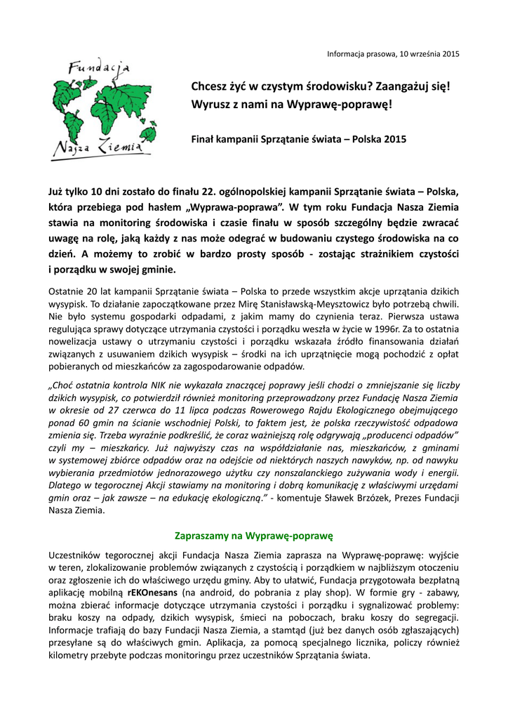 Informacja prasowa, 10 września 2015 Chcesz żyć w czystym środowisku? Zaangażuj się! Wyrusz z nami na Wyprawę-poprawę! Finał kampanii Sprzątanie świata – Polska 2015 Już tylko 10 dni zostało do finału 22. ogólnopolskiej kampanii Sprzątanie świata – Polska, która przebiega pod hasłem „Wyprawa-poprawa”. W tym roku Fundacja Nasza Ziemia stawia na monitoring środowiska i czasie finału w sposób szczególny będzie zwracać uwagę na rolę, jaką każdy z nas może odegrać w budowaniu czystego środowiska na co dzień. A możemy to zrobić w bardzo prosty sposób - zostając strażnikiem czystości i porządku w swojej gminie. Ostatnie 20 lat kampanii Sprzątanie świata – Polska to przede wszystkim akcje uprzątania dzikich wysypisk. To działanie zapoczątkowane przez Mirę Stanisławską-Meysztowicz było potrzebą chwili. Nie było systemu gospodarki odpadami, z jakim mamy do czynienia teraz. Pierwsza ustawa regulująca sprawy dotyczące utrzymania czystości i porządku weszła w życie w 1996r. Za to ostatnia nowelizacja ustawy o utrzymaniu czystości i porządku wskazała źródło finansowania działań związanych z usuwaniem dzikich wysypisk – środki na ich uprzątnięcie mogą pochodzić z opłat pobieranych od mieszkańców za zagospodarowanie odpadów. „Choć ostatnia kontrola NIK nie wykazała znaczącej poprawy jeśli chodzi o zmniejszanie się liczby dzikich wysypisk, co potwierdził również monitoring przeprowadzony przez Fundację Nasza Ziemia w okresie od 27 czerwca do 11 lipca podczas Rowerowego Rajdu Ekologicznego obejmującego ponad 60 gmin na ścianie wschodniej Polski, to faktem jest, że polska rzeczywistość odpadowa zmienia się. Trzeba wyraźnie podkreślić, że coraz ważniejszą rolę odgrywają „producenci odpadów” czyli my – mieszkańcy. Już najwyższy czas na współdziałanie nas, mieszkańców, z gminami w systemowej zbiórce odpadów oraz na odejście od niektórych naszych nawyków, np. od nawyku wybierania przedmiotów jednorazowego użytku czy nonszalanckiego zużywania wody i energii. Dlatego w tegorocznej Akcji stawiamy na monitoring i dobrą komunikację z właściwymi urzędami gmin oraz – jak zawsze – na edukację ekologiczną.” - komentuje Sławek Brzózek, Prezes Fundacji Nasza Ziemia. Zapraszamy na Wyprawę-poprawę Uczestników tegorocznej akcji Fundacja Nasza Ziemia zaprasza na Wyprawę-poprawę: wyjście w teren, zlokalizowanie problemów związanych z czystością i porządkiem w najbliższym otoczeniu oraz zgłoszenie ich do właściwego urzędu gminy. Aby to ułatwić, Fundacja przygotowała bezpłatną aplikację mobilną rEKOnesans (na android, do pobrania z play shop). W formie gry - zabawy, można zbierać informacje dotyczące utrzymania czystości i porządku i sygnalizować problemy: braku koszy na odpady, dzikich wysypisk, śmieci na poboczach, braku koszy do segregacji. Informacje trafiają do bazy Fundacji Nasza Ziemia, a stamtąd (już bez danych osób zgłaszających) przesyłane są do właściwych gmin. Aplikacja, za pomocą specjalnego licznika, policzy również kilometry przebyte podczas monitoringu przez uczestników Sprzątania świata. Zauważmy i chwalmy porządnych – plebiscyt na Czystą Gminę Fundacja Nasza Ziemia zaprasza do wskazania gmin, na terenie których panuje ogólny ład i porządek, które należycie informują społeczność lokalną o zasadach działania systemu gospodarki odpadami oraz reagują na zgłaszane przez mieszkańców nieprawidłowości. Służy temu pierwszy społeczny Plebiscyt na Czysta Gminę. Do 18 września, do godz. 18.00 można oddać swój głos za pomocą aplikacji mobilnej „rEKOnesans” lub poprzez stronę internetową www.sprzatanieswiata-polska.pl. Zwycięzcy wybrani zostaną w trzech kategoriach: gmina miejska, gmina miejsko-wiejska oraz gmina wiejska. Trwa duża rywalizacja i liderzy jeszcze mogą się zmienić. Głos można oddawać codziennie – podgląd do statystyk wg województw pod adresem: http://sprzatanieswiata-polska.pl/index.php/plebiscyt. A jak wypada w plebiscycie Wasza gmina? Ogłoszenie wyników – 19 września, o godzinie 13 podczas Ogólnopolskiego Finału Akcji Sprzątanie świata – Polska. Weekend Sprzątania świata - wydarzenia centralne Słupsk, 18 września W Słupsku dzięki gościnności Pana Prezydenta Roberta Biedronia zapoczątkujemy ogólnopolski sprzątaniowy weekend. Spotykamy się w piątek 18. września o godz. 10.00 w Parku Kultury i Wypoczynku na wielkim pikniku w Słupsku. Warszawa, 19 września W sobotę 19. września w godzinach 11.00 - 15.00 zapraszamy wszystkich chętnych na plażę przy Jeziorku Czerniakowskim, ul. Jeziorna. Jeziorko Czerniakowskie jest starorzeczem rzeki Wisły. To teren rezerwatu przyrody otoczony rozrastającym się miastem, który od lat ma problem z licznymi zanieczyszczeniami. Wraz z nurkami będziemy sprzątać pod wodą, z wędkarzami – na wodzie i z wolontariuszami – na lądzie. Tego dnia będą czekały też na dzieci i dorosłych liczne atrakcje edukacyjne. Podczas wydarzenia będą z nami Ambasadorowie Fundacji Nasza Ziemia: Ewelina Flinta i Grzegorz Kasdepke a gospodynią spotkania będzie Mira Stanisławska – Meysztowicz, inicjatorka akcji Sprzątanie Świata w Polsce. Wydarzenie organizowane jest we współpracy z Urzędem Dzielnicy Mokotów, Grupą Eksplorującą Podwarszawskie Nurkowiska, Kołem Wędkarskim PZW „Różanka”, Organizacją Odzysku Opakowań Rekopol S.A., Fundacją ProKarton, ElektroEko Organizacją Odzysku Sprzętu Elektrycznego i Elektronicznego S.A. oraz Stołecznym Wodnym Pogotowiem Ratunkowym. Szczegóły w załączonym zaproszeniu. Zapraszamy do udziału w tych wydarzeniach! Zachęcamy do kontaktu z nami: Sławek Brzózek, Prezes Zarządu Fundacji Nasza Ziemia - 501 535 032 Mira Stanisławska – Meysztowicz, inicjatorka akcji Sprzątania świata w Polsce - 501 535 037 Sekretariat Fundacji Nasza Ziemia - 22 622 81