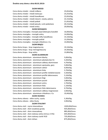 Średnie ceny złomu z dnia 06.01.2013r ZŁOM MIEDZI Cena złomu miedzi - miedź milbera Cena złomu miedzi - miedź świecąca Cena złomu miedzi - miedź kawałkowa Cena złomu miedzi - miedź niesort, nawój, palona Cena złomu miedzi - miedź pobiał Cena złomu miedzi - miedź piecyki, rurki pobielane Cena złomu miedzi - miedź wióry ZŁOM MOSIĄDZU Cena złomu mosiądzu -mosiądz poprodukcyjny kawałek Cena złomu mosiądzu - mosiądz wióry Cena złomu mosiądzu - mosiądz żółty kawałkowy Cena złomu mosiądzu - mosiądz pobiał Cena złomu mosiądzu - mosiądz chłodnice z Cu ZŁOM BRĄZU Cena złomu brązu - brąz magnetyczny Cena złomu brązu - brąz niemagnetyczny Cena złomu brązu - brąz wióry ZŁOM ALUMINIUM Cena złomu aluminium - aluminium blachy Cena złomu aluminium - aluminium plastyka bez Fe Cena złomu aluminium - aluminium odlewy aluminiowe Cena złomu aluminium - aluminium spożywka, gary Cena złomu aluminium - aluminium sektor Cena złomu aluminium - aluminium linka Cena złomu aluminium - aluminium profile nielakierowane Cena złomu aluminium - aluminium profile lakierowane Cena złomu aluminium - aluminium felgi Cena złomu aluminium - aluminium puszki Cena złomu aluminium - aluminium wióry Cena złomu aluminium - aluminium folia Cena złomu aluminium - aluminium folia lakierowana Cena złomu aluminium - aluminium odlewy magnezowe Cena złomu aluminium - aluminium chłodnice z Cu ZŁOM OŁOWIU Cena złomu ołowiu - ołów suchy, czysty Cena złomu ołowiu - ołów tłusty ZŁOM STALOWY Cena złomu stali - szyna niewsadowa Cena złomu stali - złom wsadowy gruby Cena złomu stali - złom niewsadowy Cena złomu stali - złom stalowy wióry (minus 2-5%) Cena złomu stali - złom stalowy cienki N10 Cena złomu stali - złom żeliwo 23,65zł/kg 23,25zł/kg 22,65zł/kg 22,15zł/kg 21,65zł/kg 20,15zł/kg 20,00zł/kg 16,00zł/kg 14,00zł/kg 14,10zł/kg 13,20zł/kg 14,00zł/kg 19,10zł/kg 19,30zł/kg 13,80zł/kg 5,00zł/kg 4,20zł/kg 4,70zł/kg 5,00zł/kg 6,00zł/kg 5,70zł/kg 5,50zł/kg 5,10zł/kg 5,00zł/kg 3,80zł/kg 2,70zł/kg 1,10zł/kg 0,70zł/kg 2,00zł/kg 10,40zł/kg 5,30zł/kg 4,90zł/kg 1020,00zł/tona 925,00zł/tona 885,00zł/tona 645,00zł/tona 735,00zł/tona 875,00zł/tona