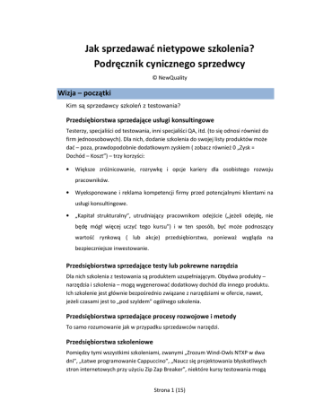 Jak sprzedawać nietypowe szkolenia? Podręcznik cynicznego sprzedwcy © NewQuality Wizja – początki Kim są sprzedawcy szkoleń z testowania? Przedsiębiorstwa sprzedające usługi konsultingowe Testerzy, specjaliści od testowania, inni specjaliści QA, itd. (to się odnosi również do firm jednoosobowych). Dla nich, dodanie szkolenia do swojej listy produktów może dać – poza, prawdopodobnie dodatkowym zyskiem ( zobacz również 0 „Zysk = Dochód – Koszt”) – trzy korzyści: • Większe zróżnicowanie, rozrywkę i opcje kariery dla osobistego rozwoju pracowników. • Wyeksponowane i reklama kompetencji firmy przed potencjalnymi klientami na usługi konsultingowe. • „Kapitał strukturalny”, utrudniający pracownikom odejście („jeżeli odejdę, nie będę mógł więcej uczyć tego kursu”) i w ten sposób, być może podnoszący wartość rynkową ( lub akcje) przedsiębiorstwa, ponieważ wygląda na bezpieczniejsze inwestowanie. Przedsiębiorstwa sprzedające testy lub pokrewne narzędzia Dla nich szkolenia z testowania są produktem uzupełniającym. Obydwa produkty – narzędzia i szkolenia – mogą wygenerować dodatkowy dochód dla innego produktu. Ich szkolenie jest głównie bezpośrednio związane z narzędziami w ofercie, nawet, jeżeli czasami jest to „pod szyldem” ogólnego szkolenia. Przedsiębiorstwa sprzedające procesy rozwojowe i metody To samo rozumowanie jak w przypadku sprzedawców narzędzi. Przedsiębiorstwa szkoleniowe Pomiędzy tymi wszystkimi szkoleniami, zwanymi „Zrozum Wind-Owls NTXP w dwa dni”, „Łatwe programowanie Cappuccino”, „Naucz się projektowania błyskotliwych stron internetowych przy użyciu Zip Zap Breaker”, niektóre kursy testowania mogą Strona 1 (15) pojawić się z nowiutkimi, błyskotliwymi nazwami, takimi jak: „Bug Busters”, „Szybciej na rynek”, „Rozwiązanie paradoksu oprogramowania”, itd. Przynęta Jak raz wpadniesz do którejkolwiek z tych kategorii, Wizja – „Profeteering (to nie jest błąd w pisowni!) made easy” – na pewno się ziści któregoś dnia. Dodanie kilku kursów testowania do obecnego produktu lub listy usług, wygląda naprawdę kusząco. Możesz znów sprzedać kompetencje, które i tak posiadasz. Poprawisz swój profesjonalny wizerunek, pokazując publicznie na scenie jaki jesteś zdolny – a oni ci za to zapłacą. Ostatnie, ale nie najmniej ważne: jeżeli nie jesteś już w kategorii super – guru, dochody twojej firmy ( lub twoje, jeśli jesteś na własnym rozrachunku), najprawdopodobniej wzrosną. Jako średnio znany konsultant, możesz podnieść stawkę pięć do dziesięciu razy za godzinę ucząc dziesięciu studentów zamiast najzwyczajniej pocić się dla pojedynczego klienta. Tak, więc usiądź, weź swoje ostatnie prezentacje z konferencji i spróbuj zrobić z tego cos dłuższego. Dwudniowy kurs wymaga około dwunastu godzin wykładów, wymaga – przyjmijmy dwadzieścia slajdów na godzinę – dwustu czterdziestu slajdów. To jest trochę więcej w porównaniu z szesnastoma slajdami, których użyłeś w swoim „Testowaniu oprogramowania w pigułce”, który zaprezentowałeś na ubiegłorocznym „EuroQualityComet”! Wtedy odkrywasz, że potrzebujesz jakieś ćwiczenia, być może spis treści, być może jakieś szblony….Wygląda to gorzej niż myślałeś na początku….lepiej najpierw zrobić jakieś plany (następny rozdział, 0). Ostatnia, ale wcale nie najmniej ważna rzecz: w tym momencie nie zwracasz zbytniej uwagi na to, czego twoi klienci mogą chcieć, tak jakby nie miało dla nich znaczenia, czego mogą naprawdę oczekiwać. Z pewnością każdy będzie zachwycał się twoim szkoleniem z testowania.! I jednocześnie twoi klienci nie są świadomi twojego wysokiego egocentrycznego ego w tym momencie, więc spuśćmy tu kurtynę. Niech więc się zacznie planowanie! Strategia Żeby zarobić na swojej przygodzie nauczania testowania, musisz dopilnować, żeby twój dochód był wyższy niż twoje koszty. Poza tym, jeżeli nie masz zatrudnienia, możesz chcieć wiedzieć czy twój zysk za godzinę będzie większy w porównaniu z tym co mógłbyś zarobić, gdybyś nie uczył : konsultował, opracowywał lub sprzedawał narzędzia, lub wprowadzał procesy albo cokolwiek co jest głównym nurtem twojego biznesu. Strona 2 (15) Zysk = Dochód – Koszty Aby maksymalizować dochód, chcesz sprzedać jak najwięcej. Zwiększenie średniej liczby uczestników kursu z pięciu do trzydziestu zdecydowanie wygląda na świetny sposób zwiększenia dochodu o około 600% bez konieczności pracowania ani minuty dłużej, z wyjątkiem mówienia trochę głośniej. Żeby to osiągnąć, będziesz musiał – poza narzuceniem uczestnikom szkolenia powstrzymanie się od zadawania pytań i wygłaszania komentarzy – więcej się reklamować i szkolenia, które przyciągną wielu potencjalnych klientów. A co z kursem “Zdalne automatyczne testowanie na WWW twego e-biznesu wraz z generowaniem wszystkich zapomnianych wymagań oraz proaktywnym eksploracyjnym zapełnianiem bazy danych CRM”? Teraz już być może uświadomiłeś sobie, że żeby naprawdę maksymalizować zyski, będziesz musiał robić to, czego nie lubisz – i nie potrafisz. Albo, dlatego, że to nie twoja dziedzina, albo, ponieważ wymaga to dużej znajomości domen, albo, po prostu dlatego, że to co się sprzedaje najlepiej, to tanie cuda – a te piekielnie trudno zdziałać. Żeby zminimalizować koszty, najchętniej najpierw zminimalizowałbyś czas poświęcony na opracowanie kursów. Przyszły rozszerzenie działalności i bieżące utrzymanie będą utrzymywane na niezbędnym minimum. Nie zapomnij o znalezieniu kilku tanich niewolników, którzy będą troszczyli się o twój plan zajęć, reklamę, rejestrację uczestników, wysyłanie faktur, wynajmowanie sal, zamawianie odpowiedniej ilości kopii twojego segregatora kursu i każdego miesiąca dostarczą ci rozsą