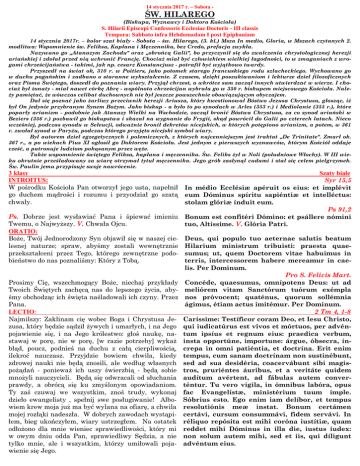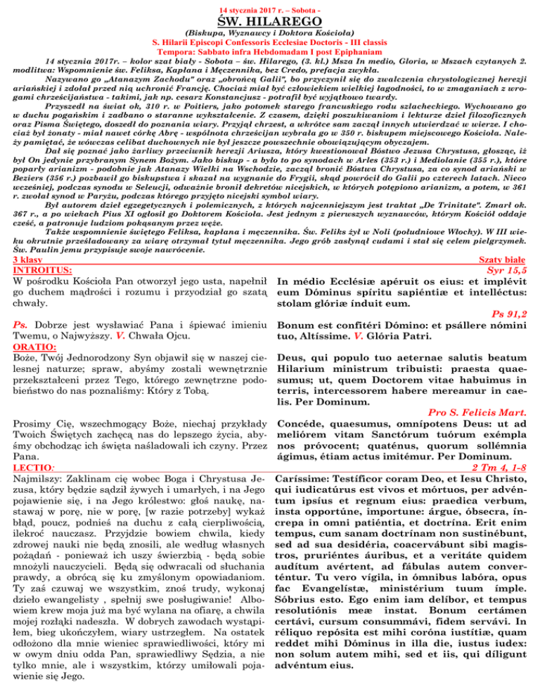 14 stycznia 2017 r. – Sobota - ŚW. HILAREGO (Biskupa, Wyznawcy i Doktora Kościoła) S. Hilarii Episcopi Confessoris Ecclesiae Doctoris - III classis Tempora: Sabbato infra Hebdomadam I post Epiphaniam 14 stycznia 2017r. – kolor szat biały - Sobota – św. Hilarego, (3. kl.) Msza In medio, Gloria, w Mszach czytanych 2. modlitwa: Wspomnienie św. Feliksa, Kapłana i Męczennika, bez Credo, prefacja zwykła. Nazywano go „Atanazym Zachodu" oraz „obrońcą Galii", bo przyczynił się do zwalczenia chrystologicznej herezji ariańskiej i zdołał przed nią uchronić Francję. Chociaż miał być człowiekiem wielkiej łagodności, to w zmaganiach z wrogami chrześcijaństwa - takimi, jak np. cesarz Konstancjusz - potrafił być wyjątkowo twardy. Przyszedł na świat ok, 310 r. w Poitiers, jako potomek starego francuskiego rodu szlacheckiego. Wychowano go w duchu pogańskim i zadbano o staranne wykształcenie. Z czasem, dzięki poszukiwaniom i lekturze dzieł filozoficznych oraz Pisma Świętego, doszedł do poznania wiary. Przyjął chrzest, a wkrótce sam zaczął innych utwierdzać w wierze. I chociaż był żonaty - miał nawet córkę Abrę - wspólnota chrześcijan wybrała go w 350 r. biskupem miejscowego Kościoła. Należy pamiętać, że wówczas celibat duchownych nie był jeszcze powszechnie obowiązującym obyczajem. Dał się poznać jako żarliwy przeciwnik herezji Ariusza, który kwestionował Bóstwo Jezusa Chrystusa, głosząc, iż był On jedynie przybranym Synem Bożym. Jako biskup - a było to po synodach w Arles (353 r.) i Mediolanie (355 r.), które poparły arianizm - podobnie jak Atanazy Wielki na Wschodzie, zaczął bronić Bóstwa Chrystusa, za co synod ariański w Beziers (356 r.) pozbawił go biskupstwa i skazał na wygnanie do Frygii, skąd powrócił do Galii po czterech latach. Nieco wcześniej, podczas synodu w Seleucji, odważnie bronił dekretów nicejskich, w których potępiono arianizm, a potem, w 361 r. zwołał synod w Paryżu, podczas którego przyjęto nicejski symbol wiary. Był autorem dzieł egzegetycznych i polemicznych, z których najcenniejszym jest traktat „De Trinitate". Zmarł ok. 367 r., a po wiekach Pius XI ogłosił go Doktorem Kościoła. Jest jednym z pierwszych wyznawców, którym Kościół oddaje cześć, a patronuje ludziom pokąsanym przez węże. Także wspomnienie świętego Feliksa, kapłana i męczennika. Św. Feliks żył w Noli (południowe Włochy). W III wieku okrutnie prześladowany za wiarę otrzymał tytuł męczennika. Jego grób zasłynął cudami i stał się celem pielgrzymek. Św. Paulin jemu przypisuje swoje nawrócenie. 3 klasy Szaty białe INTROITUS: Syr 15,5 W pośrodku Kościoła Pan otworzył jego usta, napełnił In médio Ecclésiæ apéruit os eius: et implévit go duchem mądrości i rozumu i przyodział go szatą eum Dóminus spíritu sapiéntiæ et intelléctus: chwały. stolam glóriæ índuit eum. Ps 91,2 Ps. Dobrze jest wysławiać Pana i śpiewać imieniu Bonum est confitéri Dómino: et psállere nómini Twemu, o Najwyższy. V. Chwała Ojcu. tuo, Altíssime. V. Glória Patri. ORATIO: Boże, Twój Jednorodzony Syn objawił się w naszej cie- Deus, qui populo tuo aeternae salutis beatum lesnej naturze; spraw, abyśmy zostali wewnętrznie Hilarium ministrum tribuisti: praesta quaeprzekształceni przez Tego, którego zewnętrzne podo- sumus; ut, quem Doctorem vitae habuimus in bieństwo do nas poznaliśmy: Który z Tobą. terris, intercessorem habere mereamur in caelis. Per Dominum. Pro S. Felicis Mart. Prosimy Cię, wszechmogący Boże, niechaj przykłady Concéde, quaesumus, omnípotens Deus: ut ad Twoich Świętych zachęcą nas do lepszego życia, aby- meliórem vitam Sanctórum tuórum exémpla śmy obchodząc ich święta naśladowali ich czyny. Przez nos próvocent; quaténus, quorum sollémnia Pana. ágimus, étiam actus imitémur. Per Dominum. LECTIO: 2 Tm 4, 1-8 Najmilszy: Zaklinam cię wobec Boga i Chrystusa Je- Caríssime: Testíficor coram Deo, et Iesu Christo, zusa, który będzie sądził żywych i umarłych, i na Jego qui iudicatúrus est vivos et mórtuos, per advénpojawienie się, i na Jego królestwo: głoś naukę, na- tum ipsíus et regnum eius: praedica verbum, stawaj w porę, nie w porę, [w razie potrzeby] wykaż insta opportúne, importune: árgue, óbsecra, ínbłąd, poucz, podnieś na duchu z całą cierpliwością, crepa in omni patiéntia, et doctrína. Erit enim ilekroć nauczasz. Przyjdzie bowiem chwila, kiedy tempus, cum sanam doctrínam non sustinébunt, zdrowej nauki nie będą znosili, ale według własnych sed ad sua desidéria, coacervábunt sibi magispożądań - ponieważ ich uszy świerzbią - będą sobie tros, pruriéntes áuribus, et a veritáte quidem mnożyli nauczycieli. Będą się odwracali od słuchania audítum avértent, ad fábulas autem converprawdy, a obrócą się ku zmyślonym opowiadaniom. téntur. Tu vero vígila, in ómnibus labóra, opus Ty zaś czuwaj we wszystkim, znoś trudy, wykonaj fac Evangelístæ, ministérium tuum ímple. dzieło ewangelisty , spełnij swe posługiwanie! Albo- Sóbrius esto. Ego enim iam delíbor, et tempus wiem krew moja już ma być wylana na ofiarę, a chwila resolutiónis meæ instat. Bonum certámen mojej rozłąki nadeszła. W dobrych zawodach wystąpi- certávi, cursum consummávi, fidem servávi. In łem, bieg ukończyłem, wiary ustrzegłem. Na ostatek réliquo repósita est mihi coróna iustítiæ, quam odłożono dla mnie wieniec sprawiedliwości, który mi reddet mihi Dóminus in illa die, iustus iudex: w owym dniu odda Pan, sprawiedliwy Sędzia, a nie non solum autem mihi, sed et iis, qui díligunt tylko mnie, ale i wszystkim, którzy umiłowali poja- advéntum eius. wienie się Jego. GRADUALE: Usta sprawiedliwego głoszą mądrość i język jego mówi to, co słuszne. V. Prawo jego Boga mieszka w sercu jego, a kroki się jego nie chwieją. ALLELÚIA: Alleluja, alleluja. V. Umiłował go Pan