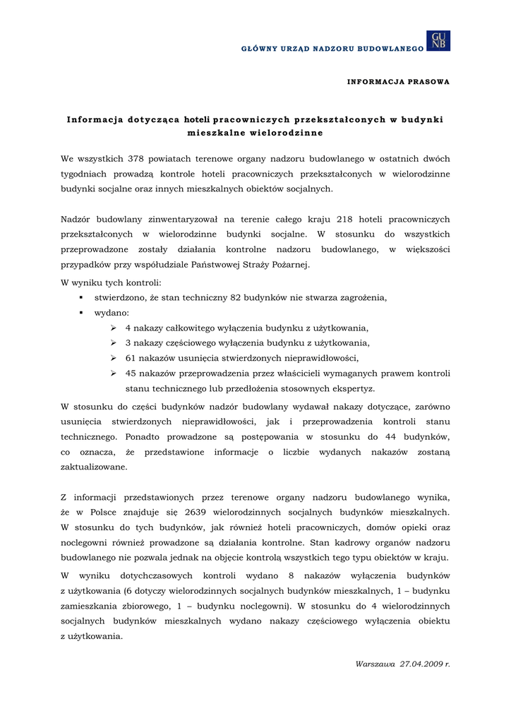 GŁÓWNY URZĄD NADZO RU BUDO WLANEGO INFORMACJA PRASOWA I nf or m ac j a d o t yc z ą ca hoteli p r ac o w n ic z y c h p r ze ks z t ał c o n y c h w b ud y n ki mi es z ka l n e w ie l o r o d zi n n e We wszystkich 378 powiatach terenowe organy nadzoru budowlanego w ostatnich dwóch tygodniach prowadzą kontrole hoteli pracowniczych przekształconych w wielorodzinne budynki socjalne oraz innych mieszkalnych obiektów socjalnych. Nadzór budowlany zinwentaryzował na terenie całego kraju 218 hoteli pracowniczych przekształconych przeprowadzone w wielorodzinne zostały działania budynki socjalne. kontrolne nadzoru W stosunku do wszystkich w większości budowlanego, przypadków przy współudziale Państwowej StraŜy PoŜarnej. W wyniku tych kontroli: stwierdzono, Ŝe stan techniczny 82 budynków nie stwarza zagroŜenia, wydano: 4 nakazy całkowitego wyłączenia budynku z uŜytkowania, 3 nakazy częściowego wyłączenia budynku z uŜytkowania, 61 nakazów usunięcia stwierdzonych nieprawidłowości, 45 nakazów przeprowadzenia przez właścicieli wymaganych prawem kontroli stanu technicznego lub przedłoŜenia stosownych ekspertyz. W stosunku do części budynków nadzór budowlany wydawał nakazy dotyczące, zarówno usunięcia stwierdzonych nieprawidłowości, jak i przeprowadzenia kontroli stanu technicznego. Ponadto prowadzone są postępowania w stosunku do 44 budynków, co oznacza, Ŝe przedstawione informacje o liczbie wydanych nakazów zostaną zaktualizowane. Z informacji przedstawionych przez terenowe organy nadzoru budowlanego wynika, Ŝe w Polsce znajduje się 2639 wielorodzinnych socjalnych budynków mieszkalnych. W stosunku do tych budynków, jak równieŜ hoteli pracowniczych, domów opieki oraz noclegowni równieŜ prowadzone są działania kontrolne. Stan kadrowy organów nadzoru budowlanego nie pozwala jednak na objęcie kontrolą wszystkich tego typu obiektów w kraju. W wyniku dotychczasowych kontroli wydano 8 nakazów wyłączenia budynków z uŜytkowania (6 dotyczy wielorodzinnych socjalnych budynków mieszkalnych, 1 – budynku zamieszkania zbiorowego, 1 – budynku noclegowni). W stosunku do 4 wielorodzinnych socjalnych budynków mieszkalnych wydano nakazy częściowego wyłączenia obiektu z uŜytkowania. Warszawa 27.04.2009 r. GŁÓWNY URZĄD NADZO RU BUDO WLANEGO INFORMACJA PRASOWA I nf or m ac j a o ob o w i ą zk ac h w ła ś ci ci el i i za r z ąd c ó w obi ek t ó w bu d o w la n y c h Zgodnie z Prawem budowlanym za bezpieczeństwo uŜytkowania obiektów budowlanych odpowiadają ich właściciele lub zarządcy. Mają obowiązek zapewnienia wykonania kontroli okresowych: • co najmniej raz w roku, polegających na sprawdzeniu stanu technicznego: - elementów budynku, budowli i instalacji naraŜonych na szkodliwe wpływy atmosferyczne i niszczące działania czynników występujących podczas uŜytkowania obiektu; • - instalacji i urządzeń słuŜących ochronie środowiska; - instalacji gazowych oraz przewodów kominowych. co najmniej raz na pięć lat, polegających na sprawdzeniu stanu technicznego i przydatności do uŜytkowania obiektu budowlanego, jego estetyki i otoczenia; kontrolą tą powinno być objęte równieŜ badanie instalacji elektrycznej i piorunochronnej w zakresie stanu sprawności połączeń, osprzętu, zabezpieczeń i środków ochrony od poraŜeń, oporności izolacji przewodów oraz uziemień instalacji i aparatów. Od 2007 r. szczególną uwagą zostały objęte ponadto obiekty wielkopowierzchniowe, traktowane umownie jako „obiekty podwyŜszonego ryzyka”, zarówno ze względu na moŜliwość przebywania w nich znacznej liczby ludzi, jak i na często nietypowe i skomplikowane rozwiązania konstrukcyjne. Uznano, Ŝe naleŜy je poddawać zaostrzonej kontroli, nie tylko podczas projektowania i realizacji, ale równieŜ podczas ich uŜytkowania. Od czerwca 2007 r. właściciel lub zarządca budynków o powierzchni zabudowy przekraczającej 2000 m2 oraz innych obiektów budowlanych o powierzchni dachu przekraczającej 1000 m2 ma obowiązek zapewnienia wykonania kontroli okresowej co najmniej 2 razy w roku, w terminach do 31 maja i do 30 listopada. Państwowy nadzór budowlany zidentyfikował i skontrolował 16 946 takich obiektów w całym kraju. Kontrole okresowe powinny być wykonywane - na zlecenie właściciela lub zarządcy – przez osoby posiadające właściwe kwalifikacje, czyli legitymujące się uprawnieniami budowlanymi w odpowiedniej specjalności. Warszawa 27.04.2009 r. INFORMACJE DOTYCZĄCE HOTELI PRACOWNICZYCH PRZEKSZTAŁCONYCH W BUDYNKI MIESZKALNE WIELORODZINNE (wg danych przedstawionych przez WINB) Obiekty w stanie nadającym się do uŜytkowania Województwo Obiekty, dla których wydano decyzję o wyłączeniu z uŜytkowania obiekty, w obiekty, w Liczba których częściowe całkowite których obiekty obiektów nakazano wyłączenie wyłączenie niebudzące nakazano przeprowadzenie z z zastrzeŜeń usunięcie kontroli lub uŜytkowania uŜytkowania nieprawidłowości ekspertyz Dolnośląskie Kujawsko-Pomorskie Lubelskie Lubuskie Łodzkie Małopolskie Mazowieckie Opolskie Podkarpackie Podlaskie Pomorskie 17 12 12 8 3 12 33 7 15 2 31 5 5 2 5 3 5 2 1 8 7 3 7 4 9 1 3 1 1 14 16 5 Śląskie Świętokrzyskie Warmińsko Mazurskie Wielkopolskie Zachodniopomorskie Ogółem 33 11 23 2 1 9 1 6 3 13 218 1 1 2 61 4 2 8 82 1 1 1 1 1 2 15 6 4 45 dot. osób 72 50 brak danych 1 1 3 4 51 173 Obiekty, co do których jest prowadzone postępowanie dot.osób 1 1 28 240 1 10 26 1 1580 26 1 22 7 brak danych 6 215 44 2121 Hotele pracownicze przekształcone w wielorodzinne budynki socjalne: I. Całkowite wyłączenie z uŜytkowania. 1. Wrocław (woj. dolnośląskie) – Socjalny budynek mieszkalny wielorodzinny przy ul. Stabłowickiej 127d. Liczba mieszkańców – 72 osoby. Murowany, podpiwniczony, o drewnianej konstrukcji szkieletowej. Drewniane stropy w częściach bocznych ugięte, belki częściowo spróchniałe, nadmierne 