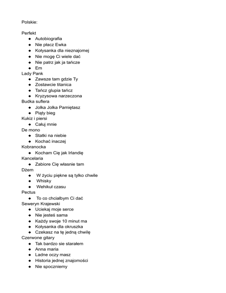 Polskie: Perfekt Autobiografia Nie płacz Ewka Kołysanka dla nieznajomej Nie mogę Ci wiele dać Nie patrz jak ja tańcze Em Lady Pank Zawsze tam gdzie Ty Zostawcie titanica Tańcz glupia tańcz Kryzysowa narzeczona Budka suflera Jolka Jolka Pamiętasz Piąty bieg Kukiz i piersi Całuj mnie De mono Statki na niebie Kochać inaczej Kobranocka Kocham Cię jak Irlandię Kancelaria Zabiore Cię własnie tam Dżem W życiu piękne są tylko chwile Whisky Wehikuł czasu Pectus To co chcialbym Ci dać Seweryn Krajewski Uciekaj moje serce Nie jesteś sama Każdy swoje 10 minut ma Kołysanka dla okruszka Czekasz na tę jedną chwilę Czerwone gitary Tak bardzo sie starałem Anna maria Ladne oczy masz Historia jednej znajomości Nie spoczniemy P.Szczepanik Kormorany Kochać Hey Teksański Mimo wszystko Krzysztof Krawczyk Chciałem być Lombard Przeżyj to sam Oddzial zamkniety Obudź się Rzeka R.Rynkowski Wznieś serce nad zło S.Soyka Tolerancja Skaldowie Ktoś mnie pokochał Ziyo Magiczne słowa T.love Warszawa 4liceum Nie, nie, nie Wilki Baśka Nie stało sie nic O sobie samym Moja babe Ira Nadzieja Ona jest ze snu Szcześliwego nowego jorku Marek Tranda Moja dumka M.Bajor Moja droga Chlopcy z placu broni Kocham Cię T.Żółtko Kochaj mnie, dotykaj mnie Rotary Na jednej z dzikich plaż Angielskie: Ben E. King Stand by me The beatles Twist n shout Let it be John Lenon Imagine Chubby checker Twist again The twist Dean Martin Sway The Police Every breath you take E.Clapton Wonderfull tonight Robin thicke Blurred lines Richie Valens La Bamba Sting All fo love Luis Amstrong What a wonderfull world Bee gees To love somebody Kings of leon Sex on fire Use somebody Bob Dylan (Guns n Roses) Knocking on heavens door Scorpions Wind of change U2 With or without you Where the streets have no name Village People YMCA Ricky Martin She bangs Michel Telo Nosa A Great Big World Say something Gustavo Lima Tche tcheeretche Leonard Cohen Halleujah Ed Sheeran Thinking out loud Biesiada: Gdybym miał gitarę Hej sokoły Szła dzieweczka Kalina malina i inne. oraz moje kompozycje: No czego chcesz Bo chcę Cię kochać Tancz i inne ;)