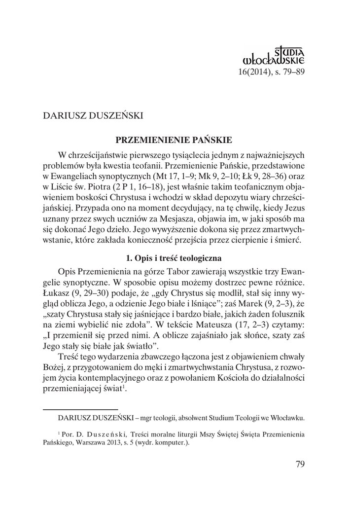16(2014), s. 79–89 Dariusz Duszeński Przemienienie Pańskie W chrześcijaństwie pierwszego tysiąclecia jednym z najważniejszych problemów była kwestia teofanii. Przemienienie Pańskie, przedstawione w Ewangeliach synoptycznych (Mt 17, 1–9; Mk 9, 2–10; Łk 9, 28–36) oraz w Liście św. Piotra (2 P 1, 16–18), jest właśnie takim teofanicznym objawieniem boskości Chrystusa i wchodzi w skład depozytu wiary chrześcijańskiej. Przypada ono na moment decydujący, na tę chwilę, kiedy Jezus uznany przez swych uczniów za Mesjasza, objawia im, w jaki sposób ma się dokonać Jego dzieło. Jego wywyższenie dokona się przez zmartwychwstanie, które zakłada konieczność przejścia przez cierpienie i śmierć. 1. Opis i treść teologiczna Opis Przemienienia na górze Tabor zawierają wszystkie trzy Ewangelie synoptyczne. W sposobie opisu możemy dostrzec pewne różnice. Łukasz (9, 29–30) podaje, że „gdy Chrystus się modlił, stał się inny wygląd oblicza Jego, a odzienie Jego białe i lśniące”; zaś Marek (9, 2–3), że „szaty Chrystusa stały się jaśniejące i bardzo białe, jakich żaden folusznik na ziemi wybielić nie zdoła”. W tekście Mateusza (17, 2–3) czytamy: „I przemienił się przed nimi. A oblicze zajaśniało jak słońce, szaty zaś Jego stały się białe jak światło”. Treść tego wydarzenia zbawczego łączona jest z objawieniem chwały Bożej, z przygotowaniem do męki i zmartwychwstania Chrystusa, z rozwojem życia kontemplacyjnego oraz z powołaniem Kościoła do działalności przemieniającej świat1. Dariusz DUSZEŃSKI – mgr teologii, absolwent Studium Teologii we Włocławku. 1 Por. D. D u s z e ń s k i, Treści moralne liturgii Mszy Świętej Święta Przemienienia Pańskiego, Warszawa 2013, s. 5 (wydr. komputer.). 79 Określając te wydarzenia technicznym terminem heksodo, Łukasz podkreślił, że przejście Jezusa ze śmierci do chwały ma charakter zbawczy, podobnie jak eksodos ludu izraelskiego z niewoli egipskiej. Eksodos Jezusa jest wypełnieniem Bożych planów zbawienia. Jezus jest umiłowanym Synem Bożym, w którym Ojciec ma upodobanie. Ofiarowanie umiłowanego Syna jest szczególnym wyrazem miłości Ojca. W komentarzach patrystycznych Chrystus często porównywany jest z Izaakiem. Góra Przemienienia kojarzy się z górą ofiarowania Izaaka. Jezus jest Mesjaszem, ale nie politycznym: jest On prawdziwym Sługą Bożym i Synem Człowieczym, który bierze na siebie winy ludzi. Jego uwielbienie i chwała łączy się nierozłącznie z męką i krzyżem. W ten sposób Przemienienie jest potwierdzeniem wyznania Piotra pod Cezareą Filipową (por. Mk 8, 29) i usankcjonowaniem objawienia Jezusa, Syna Człowieczego, cierpiącego i wywyższonego. Przemienienie łączy się z pierwszą zapowiedzią męki: „Syn Człowieczy musi wiele cierpieć” (Łk 9, 22). Należy zaznaczyć, że Przemienienie miało miejsce „w drodze” na krzyż2. O męce nieodłącznej od idei mesjańskich Starego Testamentu mówili z Chrystusem Mojżesz i Eliasz (Łk 9, 31). Jeśli Przemienienie miało utwierdzić wiarę Apostołów, to z drugiej strony, wobec niedawnego kryzysu, miało ich przygotować w oparciu o widzenie, którego byli świadkami, do nadchodzących wydarzeń męki i śmierci Chrystusa. W takim ujęciu Przemienienie stanowiłoby punkt kulminacyjny w publicznej działalności Chrystusa w tym znaczeniu, że zamykałoby pewien etap, od którego wydarzenia toczyć się będą w kierunku zapowiedzianej męki i śmierci3. Dramat Krzyża i chwała Zmartwychwstania to tajemnice wciąż na nowo przeżywane w Kościele – Ludzie Bożym zmierzającym na eschatologiczne spotkanie ze swoim Panem. Tak jak trzej wybrani Apostołowie, Kościół kontempluje przemienione oblicze Chrystusa, aby utwierdzić się w wierze, a później nie załamać się wobec Jego oblicza zniekształconego na krzyżu. W jednym i drugim przypadku Kościół jest oblubienicą stojącą przed Oblubieńcem, uczestniczącą w Jego tajemnicy, jaśniejącą Jego światłością. To światło dociera do wszystkich dzieci Kościoła, które są powołane, by iść za Chrystusem Por. J. K u d a s i e w i c z, Przemienienie Jezusa Chrystusa, w: Jezusa Chrystusa historia i tajemnica, red. W. Granat, E. Kopeć, Lublin 1982, s. 159, 175. 3 Por. E. D ą b r o w s k i, Przemienienie Chrystusa Pana, w: Podręczna encyklopedia biblijna, Poznań 1959, s. 361. 2 80 i Jemu powierzyć ostateczny sens swego życia, tak aby móc powiedzieć za Apostołem: „Dla mnie bowiem żyć – to Chrystus” (Flp 1, 21)4. W Przemienieniu nie tylko kontemplujemy tajemnicę Boga, lecz zostajemy wezwani do słuchania skierowanego do nas słowa Bożego. Ponad słowem Prawa u Mojżesza i proroctwa u Eliasza rozbrzmiewa słowo Ojca objawiające Syna. Przedstawiając „umiłowanego Syna”, Ojciec wzywa, aby Go słuchać (por. Mk 9, 7). Słuchanie, kontemplacja i posłuszeństwo stanowią więc drogi prowadzące na świętą górę, na której Trójca Święta objawia się w chwale Syna. „Przemienienie daje nam przedsmak chwalebnego przejścia Chrystusa, który przekształci nasze ciało poniżone na podobne do swego chwalebnego ciała” (Flp 3, 21)5. Dla głębszego skonkretyzowania głównej myśli opowiadania o Przemienieniu należy podkreślić, że włącza się ono, czy raczej pochodzi z tego wielkiego nurtu proroctw, które zbawienie eschatologiczne przedstawiają jako przebywanie w bliskiej obecności Boga. Dzięki tej obecności Bożej zbawieni cieszą się doskonałym poznaniem nauki Bożej, cieszą się pokojem, bezpieczeństwem i wszelkimi doczesnymi i duchowymi dobrami. W tajemnicy Przemienienia dostrzegamy Chrystusa, prawdziwego człowieka, który przez chwilę kilku świadkom ukazał swoje bóstwo, takie jakie objawi się wszystkim wybranym w chwili drugiego przyjścia. Do tej chwały zmierza Kościół. Chrystus przez to wydarzenie chciał ukazać, czym będzie Kościół w pr