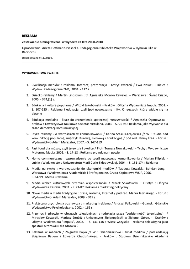 REKLAMA Zestawienie bibliograficzne w wyborze za lata 2000-2010 Opracowanie: Arleta Hoffmann-Piasecka. Pedagogiczna Biblioteka Wojewódzka w Rybniku Filia w Raciborzu Opublikowano 9.11.2010 r. WYDAWNICTWA ZWARTE 1. Cywilizacja mediów : reklama, Internet, prezentacja : zeszyt ćwiczeń / Ewa Nowel. - Kielce : Wydaw. Pedagogiczne ZNP, 2004. - 117 s. 2. Dziecko reklamy / Martin Lindstrom ; tł. Agnieszka Monika Kawalec. – Warszawa : Świat Książki, 2005. - 374,[1] s. 3. Edukacja i kultura popularna / Witold Jakubowski. - Kraków : Oficyna Wydawnicza Impuls, 2001. S. 107-125 : Reklama i edukacja, czyli (po) nowoczesne mity. O rzeczach, które widuje się na ekranie 4. Edukacja medialna : klucz do zrozumienia społecznej rzeczywistości / Agnieszka Ogonowska. Kraków : Towarzystwo Naukowe Societas Vistulana, 2003. - S. 91-98 : Reklama, jako wyzwanie dla zasad demokracji komunikacyjnej 5. Etyka reklamy - o wartościach w komunikowaniu / Karina Stasiuk-Krajewska // W : Studia nad komunikacją popularną, międzykulturową, sieciową i edukacyjną / pod red. Janiny Fras. - Toruń : Wydawnictwo Adam Marszałek, 2007. - S. 147-159 6. Fast food dla mózgu, czyli telewizja i okolice / Piotr Tomasz Nowakowski. - Tychy : Wydawnictwo Maternus Media, 2002. - S. 17-18 : Reklama prawdę nam powie 7. Homo communiccans : wprowadzenie do teorii masowego komunikowania / Marian Filipiak. Lublin : Wydawnictwo Uniwersytetu Marii Curie-Skłodowskiej, 2004. - S. 151-174 : Reklama 8. Media na rynku : wprowadzenie do ekonomiki mediów / Tadeusz Kowalski, Bohdan Jung. Warszawa : Wydawnictwa Akademickie i Profesjonalne. Grupa Kapitałowa WSiP, 2006. S. 64-99 : Media i reklama 9. Media wobec kulturowych przemian współczesności / Marek Sokołowski. – Olsztyn : Oficyna Wydawnicza Kastalia, 2003. - S. 71-87: Reklama i marketing polityczny 10. Nowe media a media tradycyjne : prasa, reklama, Internet / pod red. Marka Jezińskiego. - Toruń : Wydawnictwo Adam Marszałek, 2009. - 319 s. 11. Praktyczna psychologia poznawcza : marketing i reklama / Andrzej Falkowski. - Gdańsk : Gdańskie Wydawnictwo Psychologiczne, 2002. - 166 s. 12. Przemoc i zdrowie w obrazach telewizyjnych : (edukacja przez "codzienność" telewizyjną) / Mirosław Kowalski, Mariusz Drożdż ; Uniwersytet Zielonogórski w Zielonej Górze. - Kraków : Oficyna Wydawnicza "Impuls", 2008. - S. 131-146 : Wiesz wszystko - reklama telewizyjna jako spektakl o zdrowiu i dla zdrowia ? 13. Reklama w mediach / Zbigniew Bajka // W : Dziennikarstwo i świat mediów / pod redakcją Zbigniewa Bauera i Edwarda Chudzińskiego. - Kraków : Studium Dziennikarskie Akademii Pedagogicznej, Towarzystwo Autorów i Wydawców Prac Naukowych UNIVERSITAS, 2004. S. 374-388 14. Reklama społeczna, jako mechanizm perswazyjny / Beata Sałek // W : Studia nad komunikacją popularną, międzykulturową, sieciową i edukacyjną / pod red. Janiny Fras. - Toruń : Wydawnictwo Adam Marszałek, 2007. – S. 160-159 15. Wiedźma reklama / Joanna Olech // W : Nigdy nie jest za wcześnie - rozwój i edukacja małych dzieci / pod redakcją Teresy Ogrodzińskiej. - Warszawa : Fundacja Rozwoju Dzieci im. Jana Amosa Komeńskiego, 2004. - S. 151-154. ARTYKUŁY Z CZASOPISM 1. Agresja w reklamach kierowanych do dzieci / Maria Braun-Gałkowska // Edukacja i Dialog. - 2000, nr 5, s. 40-44 2. Alkohol w reklamie społecznej - ciekawy przykład z Portugalii / Magdalena Pietruszka // Świat Problemów. - 2009, nr 10 , s. 36-37 3. Czy nas to kręci? : o reklamach wykorzystujących motywy seksualne / Eugenia Mandal // Problemy Opiekuńczo-Wychowawcze. - 2007, nr 4, s. 21-22 4. Czy reklamy decydują o moich zakupach ? Scenariusz lekcji z edukacji czytelniczej i medialnej / Bożena Hajduga // Biblioteka w Szkole. - 2009, nr 3, s. 22 5. Czy świat bez reklamy byłby uboższy ? / Marcin Choroba // Polonistyka. - 2005, nr 9, s. 49-50 6. Dziecko – podmiot reklamy / Anna Albertowska // Edukacja i Dialog. - 2006, nr 1, s. 58-60 7. Dzieci-odbiorcy reklam / M Braun-Gałkowska // Wychowawca. - 2002, nr 7-8, s. 10-13 8. Dzieci w wieku przedszkolnym i wczesnoszkolnym, jako odbiorcy reklam / Jolanta Karbowniczek // Częstochowski Biuletyn Oświatowy. - 2009, nr 1, s. 39-46 9. Dziś poznamy świat reklamy. : Scenariusz lekcji edukacji czytelniczej i medialnej dla uczniów klasy II gimnazjum / Bożena Hajduga // Biblioteka w Szkole. - 2008, nr 6, s. 11 10. Fuzja wyobrażeń / Anna Maria Zawadzka // Charaktery. - 2009, nr 5, s. 58-61 11. Inwazja mocy i żądza pieniądza / D Cieślik.- Więź. - 2000, nr 5, s. 56-64 12. Jak działa reklama ? Scenariusz zajęć w szkole ponadgimnazjalnej / Kamilla Dudek // Biblioteka w Szkole. - 2003, nr 5, s. 9 13. Jak reklama namawia młodzież do palenia papierosów / Sabina Bartczak // Wychowanie, na co Dzień. - 2002, nr 10-11, s. 23-25 14. Językowe mechanizmy zjednywania odbiorcy w reklamie religijnej / Jagoda Rodzoch - Malek // Poradnik Językowy. - 2008, nr 10, s. 71-84 15. Kaznodziejstwo i reklama, albo czy można „sprzedać” Pana Boga / Andrzej Draguła // Więź. - 2001, nr 9, s. 67-79 16. Kilka aspektów ewolucji języka tekstów reklam w Polsce w latach 1990-2001 elementy perswazji retorycznej w reklamie : analiza diachroniczna / Wioletta Orlińska // Poradnik Językowy. - 2007, nr 3, s. 29-35 17. Kropla drąży skałę. Co może reklama społeczna / Monika Przybysz // Więź. - 2009, nr 7, s. 50-59 18. Kto nie daje się reklamie / Dorota Karwowska // Psychologia w Szkole. - 2008, nr 2, s. 93-100 19. Mechanizmy perswazji i reklamy środków psychoaktywnych w Internecie / Tomasz Zakrzewski [Cz. 1] // Serwis Informacyjny Narkomania. - 2009, nr 1, s.11-15 20. Mechanizmy perswazji i reklamy środków psychoaktywnych w Internecie. Cz. 2 Tomasz Zakrzewski // Serwis Informacyjny Narkomania. - 2009, nr 2, s. 11-13 21. Młodzież a zagrożenia współczesnej kultury / Sebastian Taboł // Kultura i Edukacja . - 2008, nr 1, s. 118-130 22. Perswazja w reklamie społecznej - czyli 