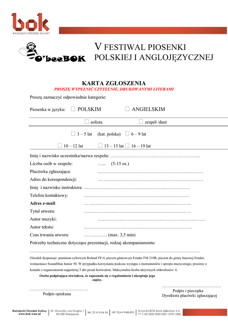 V FESTIWAL PIOSENKI POLSKIEJ I ANGLOJĘZYCZNEJ KARTA ZGŁOSZENIA PROSZĘ WYPEŁNIĆ CZYTELNIE, DRUKOWANYMI LITERAMI Proszę zaznaczyć odpowiednie kategorie: Piosenka w języku: POLSKIM ANGIELSKIM zespół /duet solista 3 – 5 lat 10 – 12 lat (kat. polska) 13 – 15 lat 6 – 9 lat 16 – 19 lat Imię i nazwisko uczestnika/nazwa zespołu: ………………………………………………….. Liczba osób w zespole: …... Placówka zgłaszająca: …………………………………………………………… Adres do korespondencji: …………………………………………………………… (5-15 os.) Imię i nazwisko instruktora: .……………………………………………..……………. Telefon kontaktowy: …………………………………………………………… Adres e-mail: … ..……………………………………………………….. Tytuł utworu: ……………………………………………………………. …..………………………………………………………… Autor muzyki: Autor tekstu: ..…………………………………………………………… Czas trwania utworu: …………… (max. 3,5 min) Potrzeby techniczne dotyczące prezentacji, rodzaj akompaniamentu: ………………………………………………………………………………………………… Ośrodek dysponuje: pianinem cyfrowym Roland FP-4, piecem gitarowym Fender FM 210R, piecem do gitary basowej Fender, wzmacniacz SoundMan Junior 50. W przypadku korzystania podczas występu z instrumentów i sprzętu muzycznego, prosimy o kontakt z organizatorem najpóźniej 5 dni przed festiwalem. Maksymalna liczba aktywnych mikrofonów: 6. Osoba podpisująca oświadcza, że zapoznała się z regulaminem i akceptuje jego zapisy. …………………………………… Podpis opiekuna …………………………………… Podpis i pieczątka Dyrektora placówki zgłaszającej