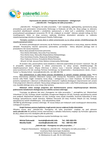 Zaproszenie do udziału w Programie charytatywno – ekologicznym „ Zakretki.info – Pomagamy nie tylko przyrodzie…” „Zakretki.info - Pomagamy nie tylko przyrodzie…” jest największą, ogólnopolską, spontaniczną akcją prowadzoną pod patronatem Uniwersytetu Rolniczego w Krakowie od kilku lat. Akcja polega na zbieraniu wszystkich plastikowych zakrętek z produktów spożywczych, a także tych z produktów chemicznych i przemysłowych posiadających oznaczenie PP, PE lub „trójkącik ze strzałek”. Zebrane zakrętki trafiają do firm recyklingowych, które za skup surowca, wpłacają określony ekwiwalent pieniężny na subkonto niepełnosprawnego dziecka w Organizacjach Pożytku Publicznego. Pieniądze uzyskane w naszej akcji w całości przeznaczane są na zakup sprzętu rehabilitacyjnego dla niepełnosprawnych dzieci. W imieniu potrzebujących zwracamy się do Paostwa o zaangażowanie w naszą akcję, poprzez zbiórkę zakrętek. Poszukujemy również sponsorów, patronatów, partnerów - którzy aktywnie pomogą nam w prowadzeniu tak naszej inicjatywy. Nasza akcja posiada honorowe patronaty: - Pana Marka Michalaka, Rzecznika Praw Dziecka; - Pana Marka Sowy, Marszałka Województwa Małopolskiego; - Pana Stanisława Kracika, Wojewody Małopolskiego; - Pana Tadeusza Ferenca, Prezydenta Miasta Rzeszowa; - JM prof. dr hab. Janusza Żmiji, Rektora Uniwersytetu Rolniczego. W zeszłym roku, poszerzyliśmy nasze działania o zbieranie pojemników po tuszach i tonerach. Tak, jak w przypadku zakrętek pieniądze w całości przeznaczamy na zakup sprzętu rehabilitacyjnego dla niepełnosprawnych dzieci. Więcej informacji o zbiórce tuszy i tonerów odnajdą Paostwo na stronie www.tuszeitonery.info lub uzyskają Paostwo kontaktując się bezpośrednio z Koordynatorem działu „Tusze i Tonery” p. Renatą Cichoo : [email protected] ; tel. 600 265 705 Nasi wolontariusze w całej Polsce pracują nieodpłatnie w ramach swojego wolnego czasu. Naszą stronę internetową odwiedza kilkanaście tysięcy osób miesięcznie. Posiadamy swoich koordynatorów na terenie całej Polski. Ciągle rozwijamy naszą akcję, i wzbogacamy ją o nowe inicjatywy. W chwili obecnej jesteśmy największym ( obecnym w kilkudziesięciu miastach) i najdłużej działającym nieprzerwanie (od prawie 4 lat) programem zbierania zakrętek. Naszą akcję wzbogacają twarze osób z całej Polski przekazując swój wolny czas, kawałek dobrego serca, oraz niosąc chęd pomocy. Głównym celem naszego programu jest bezinteresowna pomoc niepełnosprawnym dzieciom, podnoszenie świadomości ekologicznej oraz zbiórka surowca wtórnego. Trzymając się głównej idei akcji „Pomagamy nie tylko przyrodzie…”, pomogliśmy już: Wojciechowi Urbanikowi (12 lat), fundując wózek inwalidzki; Grzegorzowi Magierze (10 lat), fundując specjalistyczny wózek oraz podjazd; Wojciechowi Idziakowi (12 lat), fundując nowy wózek inwalidzki; Zuzannie Dukarskiej (2 lata), fundując specjalistyczny wózek dziecięcy; Rafałowi Owczarek (23 lata); Paulince Wójcik (11 lat), fundując specjalistyczny wózek rehabilitacyjny - oraz odzyskaliśmy około 140 000 kg plastikowego surowca wtórnego. W naszej kolejce jest kolejnych sześd oczekujących dzieciaczków, czekających na pomoc. Dzięki Paostwa pomocy będziemy mogli pomóc jeszcze większej liczbie dzieciaków. Oficjalna strona akcji „Zakrętki.info- Pomagamy nie tylko przyrodzie” znajduje się pod adresem www.zakretki.info Na podanej stronie internetowej w zakładce Dokumenty znajduje się Formularz zgłoszenia do akcji, plakat oraz inne niezbędne pliki do pobrania. Więcej informacji mogą Paostwo uzyskad kontaktując się z nami. Michał Żukrowski Monika Kubik [email protected] [email protected] Tel.: 505 638 476 Tel.: 669 421 909 „Zakretki.info – Pomagamy nie tylko przyrodzie… .” Program Charytatywno – Ekologiczny „Zakretki.info – Pomagamy nie tylko przyrodzie… .” Uczelniana Rada Samorządu Studentów Uniwersytet Rolniczy im. Hugona Kołłątaja w Krakowie, Al. Mickiewicza 21, pok. 39; 31-120 Kraków