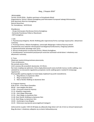Bieg „ Z Kopyta 2016” REGULAMIN: Termin: 03.09.2016r., Stadion sportowy w Gniazdowie‐Mzyki Organizatorzy: Gmina i Miasto Koziegłowy pod Patronatem Europoseł Jadwigi Wiśniewskiej Klub Sportowy Warriors Koziegłowy Ranczo Rosochacz Tel. Kontaktowy : 507970120 Współpraca: ‐ Grupa Animacyjno‐Nordicowa Gmina Koziegłowy ‐ Komenda Powiatowa Policji w Myszkowie ‐ OSP Koziegłowy I. Cele 1. Popularyzacja biegania, Nordic Walking jako najprostszej formy czynnego wypoczynku i aktywności ruchowej. 2. Promocja Gminy i Miasta Koziegłowy, samorządu dbającego o kulturę fizyczną swoich mieszkańców oraz walorów rekreacyjnych do biegania/nordicowania, integracja pokoleń. 3. Upowszechnianie zdrowego stylu życia. 4. Wzrost atrakcyjności turystycznej Gminy i Miasta Koziegłowy 5. Kształtowanie i promowanie pozytywnych wzorców zachowań wśród dzieci i młodzieży oraz aktywności ruchowej . II. Trasa Obejmuje nawierzchnię gruntowo‐piaszczystą Trasa oznakowana. Nie posiada atestu PZLA. Limit czasowy dla wszystkich dystansów: 2h 45min. Na trasie znajdują się sędziowie, którzy będą dokonywali oceny techniki marszu nordic walking, oraz udzielali kar za naruszenie regulaminu przepisów nordic walking (patrz rozdział IX niniejszego regulaminu). W przypadku upalnej pogody na trasie będą znajdował się punkt nawodnienia. 1. Bieg Główny na dystansie 10km 2. Bieg na dystansie 5km 3. Marsz Nordic Walking na dystansie 5km III. Program Imprezy 8.00‐10.30 – Praca Biura Zawodów 09.00 – start biegów dla dzieci 11.00 – Uroczyste otwarcie imprezy 11.15‐ Wspólna rozgrzewka 11.30 – Start Biegu Głównego 11.35 – Start Biegu na dystansie 5km 11.40‐ Start Nordic Walking na dystansie 5km 11.45‐ Start Biegu na dystansie 1km 14.00 – Zamknięcie trasy Biegów 14.45 – Dekoracja zwycięzców poszczególnych kategorii Jednocześnie w godz. 9.00‐10.30 będą się odbywały biegi dzieci od 5 do 15 lat na różnych dystansach: Bieg dla dzieci i młodzieży odbędzie się na bieżni lekkoatletycznej Kategoria I godz 09.00 PRZEDSZKOLAKI dystans 100m Kategoria II godz. 09 :20 SZKOŁA PODSTAWOWA *Klasy 1‐3 dziewczyny i chłopcy dystans 200m *Klasy 4‐6 dziewczyny i chłopcy dystans 400m Kategoria III godz.09:40 SZKOŁA GIMNAZJALNA *Klasy 1‐3 dziewczyny 800 m *Klasy 1‐3 chłopcy 1200 m IV. Uczestnictwo 1. Zawody są otwarte dla wszystkich zainteresowanych, zarówno osób zrzeszonych w klubach sportowych, jak i amatorów. Limit Uczestników wynosi 400 osób (250 osób‐ bieg, 150 osób‐ nordic walking). 2. Zawodnicy niepełnoletni muszą posiadać zgodę prawnych opiekunów na uczestnictwo w Biegu (podpisanie oświadczenia w Biurze Zawodów przez rodzica lub opiekuna prawnego po przedstawieniu dokumentu tożsamości). 3. Każdy zawodnik startuje wyłącznie na własną odpowiedzialność, co potwierdza złożeniem podpisu pod oświadczeniem o zdolności do udziału w zawodach. Organizator nie ubezpiecza uczestników. 4. Wszyscy startujący zawodnicy muszą zostać zweryfikowani w Biurze Zawodów. 5. Podczas weryfikacji zawodnicy muszą okazać dokument tożsamości ze zdjęciem. 6. Zawody odbędą się bez względu na warunki atmosferyczne, z zastrzeżeniem sytuacji zagrażającym bezpieczeństwu. 7. Wyniki końcowe dostępne będą po zakończeniu imprezy na stronie http://wynikionline.pl/ 8. Zawodnicy wyrażają zgodę na przetwarzanie ich danych osobowych dla potrzeb wewnętrznych Organizatora imprezy oraz na wykorzystanie ich wizerunku w materiałach informacyjnych i reklamowych. 9. W ramach pakietu startowego Uczestnicy otrzymują m.in. numer startowy wraz z agrafkami, posiłek regeneracyjny po biegu, wodę mineralną po biegu oraz pamiątkowy medal. V. Pomiar czasu Prowadzony będzie elektroniczny pomiar czasu z wykorzystaniem chipów umieszczonych w numerze startowym. Oficjalnym czasem biegów jest czas BRUTTO. Numer startowy należy umieścić w widocznym miejscu na klatce piersiowej. Numer startowy nie może być zakryty ani zasłonięty, w przeciwnym wypadku Organizator nie gwarantuje prawidłowości pomiaru czasu. Wyniki nieoficjalne obowiązują przez 72 godziny od publikacji w tym czasie można składać reklamacje oraz wnosić o korektę danych VI. Zgłoszenia i Opłaty 1. Zgłoszenia przyjmowane są poprzez wypełnienie formularza zgłoszeniowego dostępnego na stronie http://biurozawodow.pl/events/info/z‐kopyta‐2016 do dnia 31 sierpnia 2016 r. 2. Odbiór pakietu startowego będzie możliwy: w dniu zawodów 03 września 2016r. W miejscu Stadionu sportowego Gniazdów‐Mzyki w godzinach 8:00 – 9:30. 3. W przypadku przekroczenia 400 zgłoszeń do udziału w Biegu Organizator automatycznie kończy przyjmowanie zgłoszeń. 4. Za zgłoszenie uważa się wypełnienie formularza zgłoszeniowego i uiszczenie opłaty startowej. 5. Każdy z Uczestników Biegu ma obowiązek sprawdzenia przed Biegiem czy jest umieszczony na liście startowej. 6. Dzieci w towarzystwie rodziców lub opiekunów biorą udział w zabawach i wyścigach po uprzednim zarejestrowaniu się w Biurze Zawodów. 7. Wysokość opłaty startowej w Biegu Głównym, biegu na 5 km i Marszu Nordic Walking: 20 zł. Opłatę należy uiścić do dnia 30 sierpnia 2016r. Dzieci w wieku przedszkolnym oraz z klas I‐VI szkoły podstawowej i gimnazjum są zwolnione z opłaty startowej. 8. W dniu zawodów opłata startowa w Biegu Głównym, biegu na 5 km i Marszu Nordic Walking: 40 zł. 9. W dniu zawodów organizator będzie dysponował (poza osobami zgłoszonymi przez Internet i opłaconymi): 50 pakietami na wszystkie biegi / marsz NW. VII. Klasyfikacja I. Bieg Główny a. Open Kobiet i Open Mężczyzn b. Klasyfikacje wiekowe: ‐ K‐20 / M‐20 18‐39 lat (rocznik 1998‐1977) ‐ K‐40 / M‐40 40‐59 lat (rocznik 1976‐1957) ‐ K‐60 / M‐60 60 i więcej lat (rocznik 1956 i starsi) c. Najszybszy Mieszkaniec i Mieszkanka Gminy i Miasta Koziegłowy II. Marsz Nordic Walking a. Open Kob