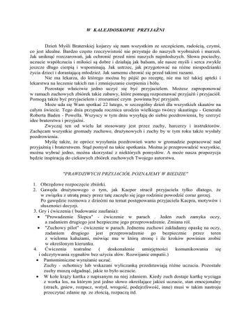 W KALEJDOSKOPIE PRZYJAŹNI Dzień Myśli Braterskiej kojarzy się nam wszystkim ze szczęściem, radością, czymś, co jest idealne. Bardzo często rzeczywistość nie przystaje do naszych wyobrażeń i marzeń. Jak uniknąć rozczarowań, jak ochronić przed nimi naszych najmłodszych. Słowa pociechy, uczucie współczucia i miłości są dobre i działają jak balsam, ale nasze myśli i serca zwykle jeszcze długo cierpią i wspominają. Jak ustrzec, jak przygotować na różne niespodzianki życia dzieci i dorastającą młodzież. Jak samemu chronić się przed takimi razami. Nie ma lekarza, do którego można by pójść po receptę, nie ma też takiej apteki i lekarstwa na leczenie takich ran i zmniejszanie cierpienia i bólu. Pozostaje właściwie jedno uczyć się być przyjacielem. Możesz zaproponować w ramach zuchowych zbiórek takie zabawy, które pomogą rozpoznawać przyjaźń i przyjaciół. Pomogą także być przyjacielem i zrozumieć czym powinna być przyjaźń. Może uda się Wam spotkać 22 lutego, w szczególny dzień dla wszystkich skautów na całym świecie. Tego dnia przypada rocznica urodzin wielkiego twórcy skautingu - Generała Roberta Baden - Powella. Wszyscy w tym dniu wysyłają do siebie pozdrowienia, by szerzyć idee braterstwa i przyjaźni. Zwyczaj ten od wielu lat stosowany jest przez zuchy, harcerzy i instruktorów. Zachęcam wszystkie gromady zuchowe, drużynowych i zuchy by w tym roku także wysłały pozdrowienia. Myślę także, że oprócz wysyłania pozdrowień warto w gromadzie popracować nad przyjaźnią i braterstwem. Stąd pomysł na takie spotkania. Można je przeprowadzić wszystkie, można wybrać jedno, można skorzystać z niektórych pomysłów. A może nasza propozycja będzie inspiracją do ciekawych zbiórek zuchowych Twojego autorstwa. "PRAWDZIWYCH PRZYJACIÓŁ POZNAJEMY W BIEDZIE" 1. Obrzędowe rozpoczęcie zbiórki. 2. Gawęda drużynowego o tym, jak Kacper stracił przyjaciela tylko dlatego, że w związku z utratą pracy przez tatę zaczęło się jego rodzinie powodzić coraz gorzej. Po gawędzie rozmowa z dziećmi na temat postępowania przyjaciela Kacpra, motywów i słuszności decyzji. 3. Gry i ćwiczenia ( budowanie zaufania): "Prowadzenie Ślepca" - ćwiczenie w parach . Jeden zuch zamyka oczy, a zadaniem drugiego jest bezpieczne jego przeprowadzenie. Zmiana ról. "Zuchowy pilot" - ćwiczenie w parach. Jednemu zuchowi zakładamy opaskę na oczy, zadaniem drugiego jest przeprowadzenie go bezpiecznie przez teren z wieloma kałużami, mówiąc mu w którą stronę i ile kroków powinien zrobić w określonym kierunku. 4. Ćwiczenia teatralne ( doskonalenie umiejętności komunikowania się i odczytywania sygnałów bez użycia słów. Rozwijanie empatii.) Pantomimiczne wyrażanie uczuć. Zuchy - ochotnicy lub wskazani wyliczanką przedstawiają różne uczucia. Pozostałe zuchy muszą odgadnąć, jakie to było uczucie. W kole krąży kartka z napisanym na niej zdaniem. Kiedy zuch dostaje kartkę wyciąga z worka los, na którym jest jedno słowo określające jakieś uczucie, stan emocjonalny (strach, gniew, rozpacz, wstyd, wrogość, podejrzliwość, inne) musi w takim nastroju przeczytać zdanie np. ze złością, rozpaczą itd. 5. Krąg rady: rozmowa z zuchami na temat: Jak się czuły, gdy były prowadzone i kierowane przez drugiego zucha, jak się czuły, gdy same prowadziły koleżankę lub kolegę, Czy łatwo jest kimś kierować, prowadzić go, Określenia, co się dzieje z twarzą osoby radosnej, zmartwionej, przestraszonej? Co się dzieje z rękami, gdy ktoś jest zdenerwowany, przyjazny, onieśmielony? Co się dzieje z nogami osoby bezradnej, chcącej nawiązać kontakt? Drużynowy podkreśla, że w gromadzie zuchów powinniśmy mieć do siebie zaufanie, każdy zuch powinien umieć rozpoznawać różne uczucia i stany emocjonalne i właściwie na nie reagować. Powinniśmy pomagać tym, którzy nie radzą sobie z onieśmieleniem i okazywaniem uczuć. Zuchy zastanowią się, kto w ich otoczeniu ma takie kłopoty i warto okazać mu, że nie jest sam, że obok może znaleźć, kolegę, kumpla, przyjaciela. Dla takiej osoby warto przygotować jakiś niewielki podarunek i dać mu tym samym znać o sobie, może to być, kartka z pozdrowieniami, zaproszenie na zbiórkę. 6. Piosenki i pląsy: nauka piosenki "Każdy zuch". 7. Majsterka: wykonanie kartki okolicznościowej i napisanie pozdrowień, wykonanie i napisanie zaproszenia na zbiórkę. 8. Zadanie międzyzbiórkowe - dostarczyć kartkę i zaproszenie adresatom. 9. Obrzędowe zakończenie zbiórki. "SZTUKA ZDOBYWANIA PRZYJACIÓŁ" 1. Obrzędowe rozpoczęcie zbiórki. Jeśli na zbiórkę przyjdą zaproszeni przez zuchy koledzy od początku znajdźcie dla nich miejsce na zbiórce, w szóstce kolegi, wydaje się będzie im najlepiej. 2. Gry i ćwiczenia ( przełamanie onieśmielenia, pomoc w zapamiętywaniu imion): "Nazywam się i ...". Wszyscy stają w kręgu. Każdy po kolei: wymienia swoje imię oraz pokazuje swój charakterystyczny gest, wymienia swoje imię oraz pokazuje pantomimicznie, co lubi robić, wymienia swoje imię oraz przedstawia pantomimicznie ulubione zwierzę, wymienia swoje imię oraz wydaje jakiś zabawny dźwięk. Za każdym razem grupa powtarza imię, ruchy lub dźwięki danej osoby. 'Rymowanki z piłką". Wszyscy stoją lub siedzą w kręgu. Dziecko wybiera jakąś osobę i rzuca do niej piłkę. Odbierający piłkę musi podać imię rzucającego. Teraz wszyscy podają jak najwięcej rymujących się wyrazów do tego imienia. 3. Gawęda ( na podstawie rozdziału "Kalejdoskop przyjaźni" książki Ryby i dzieci głosu nie mają? Twój głos o koleżeństwie, przyjaźni i miłości, autorstwa ks. Janusza Tarnowskiego oraz Dziecięcego Zespołu Redakcyjnego). Gdyby tak włożyć przyjaźń do kalejdoskopu to znaczy do takiej zabawki - rurki, w której znajdują się różnobarwne szkiełka. Dzięki umieszczonym tak małym zwierciadełkom moż