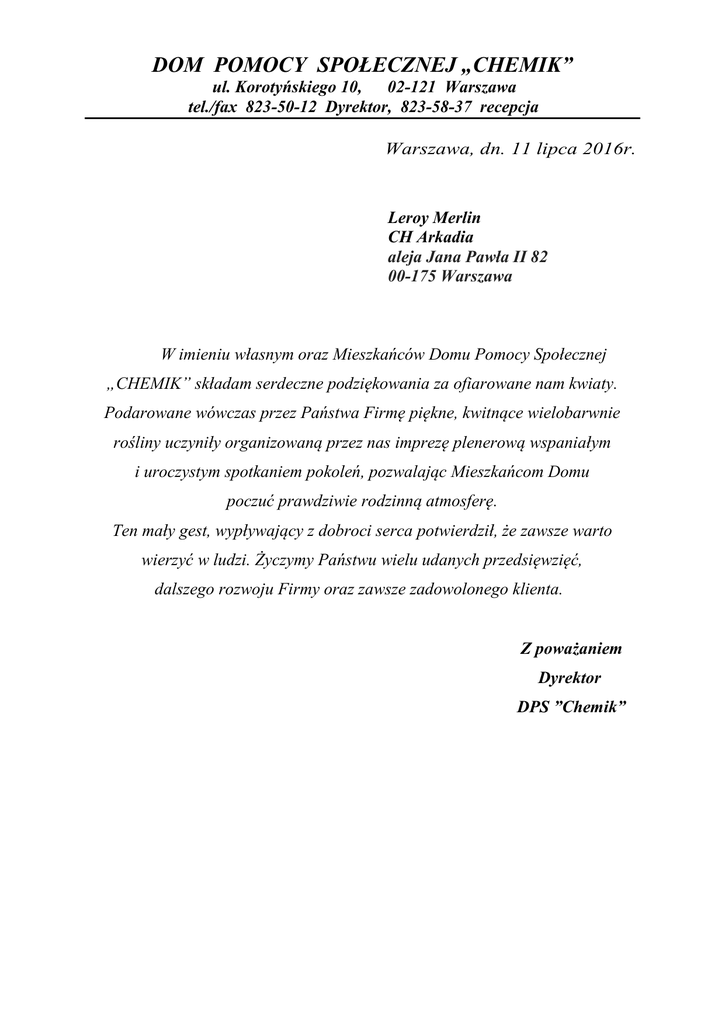 DOM POMOCY SPOŁECZNEJ „CHEMIK” ul. Korotyńskiego 10, 02-121 Warszawa tel./fax 823-50-12 Dyrektor, 823-58-37 recepcja Warszawa, dn. 11 lipca 2016r. Leroy Merlin CH Arkadia aleja Jana Pawła II 82 00-175 Warszawa W imieniu własnym oraz Mieszkańców Domu Pomocy Społecznej „CHEMIK” składam serdeczne podziękowania za ofiarowane nam kwiaty. Podarowane wówczas przez Państwa Firmę piękne, kwitnące wielobarwnie rośliny uczyniły organizowaną przez nas imprezę plenerową wspaniałym i uroczystym spotkaniem pokoleń, pozwalając Mieszkańcom Domu poczuć prawdziwie rodzinną atmosferę. Ten mały gest, wypływający z dobroci serca potwierdził, że zawsze warto wierzyć w ludzi. Życzymy Państwu wielu udanych przedsięwzięć, dalszego rozwoju Firmy oraz zawsze zadowolonego klienta. Z poważaniem Dyrektor DPS ”Chemik”