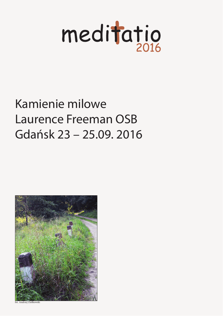 Kamienie milowe Laurence Freeman OSB Gdańsk 23 – 25.09. 2016 fot. Andrzej Ziółkowski 1 Sesja Milczenie i medytacja Czwartek 22.09.2016 18.00 – 19.00 rejestracja uczestników 19.00 – 19.45 kolacja 20.00 – 21.00 wprowadzenie do medytacji, modlitwa wieczorna i 2 x medytacja Piątek 23.09.2016 08.00 – 08.45 spacer medytacyjny, modlitwa poranna i medytacja 08.45 – 09.15 śniadanie 09.30 – 10.30 konferencja – ks. Stanislav Danielewsky/Ukraina [tł.] 10.45 – 11.45 modlitwa południowa i 2 x medytacja 11.45 – 12.15 przerwa kawowa 12.15 – 13.15 modlitwa południowa i 2 x medytacja 13.15 – 14.00 obiad 14.00 – 17.15 czas wolny na spacer po rezerwacie przyrody i plaży Meditatio „Kamienie milowe” 16.00 – 17.15 rejestracja uczestników 17.15 – 17.30 przejście do sali wykładowej 17.30 – 17.45 otwarcie Meditatio 17.45 – 18.30 wprowadzenie do medytacji i medytacja 18.30 – 18.45 przejście do stołówki 18.45 – 19.30 kolacja 19.45 – 21.30 Dzieciństwo – o. Laurence Freeman OSB [tł.] 21.30 – 22.00 modlitwa wieczorna i medytacja 2 Sobota 24.09.2016 06.30 – 07.00 praca z ciałem 07.00 – 07.30 modlitwa poranna i medytacja 07.30 – 08.15 śniadanie 08.15 – 08.30 przejście do sali wykładowej 08.30 – 10.15 Młodość – o. Laurence Freeman OSB 10.15 – 10.45 przerwa kawowa 10.45 – 12.30 Dojrzałość – o. Laurence Freeman OSB 12.30 – 13.00 modlitwa południowa i medytacja 13.00 – 14.00 obiad 14.00 – 15.30 Transformacja – o. Laurence Freeman OSB 15.45 – 16.15 przerwa kawowa 16.15 – 17.45 msza św. z uroczystością oblacji 18.00 – 18.45 kolacja 19.00 – 20.45 Pytania i odpowiedzi – o. Laurence Freeman OSB 21.00 – 21.30 modlitwa wieczorna i medytacja Niedziela 25.09.2016 06.30 – 07.00 praca z ciałem 07.30 – 08.00 modlitwa poranna i medytacja 08.15 – 08.55 śniadanie 09.15 – 10.30 Konferencja – o. Marie Susai Chinnappan OMI/Indie [tł.] 10.30 – 11.00 przerwa kawowa 11.00 – 12.00 WCCM na Ukrainie i Litwie 12.00 – 12.30 modlitwa południowa i medytacja 12.45 – 13.45 obiad 14.00 – zakończenie 3 Rekolekcjonista Laurence Freeman OSB urodził się w Londynie 17 lipca 1951 roku. Stopień magistra literatury angielskiej zdobył w New College w Oksfordzie. Pracował początkowo w ONZ-ecie, bankowości i w mediach jako dziennikarz, aby ostatecznie wstąpić do zakonu benedyktynów w opactwie Ealing w Londynie. Nowicjat odbył pod kierunkiem Johna Maina OSB. Wraz z nim wyjechał w 1977 roku do Montrealu, gdzie założyli klasztor benedyktyński, który stał się duchowym centrum dla grup medytujących chrześcijan na całym świecie i zainspirował jeden z nurtów odnowy kontemplacyjnej w Kościele zachodnim. Po śmierci o. Johna Maina w 1982 roku został przeorem tego klasztoru. W 1991 roku wrócił do Londynu i został członkiem benedyktyńskiej wspólnoty klasztoru Chrystusa Króla w Cockfosters należącym do Oliwetańskiej Kongregacji Benedyktyńskiej. Obecnie jest dyrektorem Światowej Wspólnoty Medytacji Chrześcijańskiej (WCCM). Laurence Freeman OSB podróżuje po całym świecie i prowadzi rekolekcje medytacyjne, jest mówcą na konferencjach międzynarodowych, podkreślając znaczenie aspektu duchowego w najważniejszych sprawach współczesnego świata: w edukacji, w służbie zdrowia, terapii uzależnień, w biznesie, sprawiedliwości społecznej i ochronie środowiska naturalnego. Wraz z Dalajlamą od wielu lat współprowadzi spotkania w dialogu buddyjsko-chrześcijańskim noszące nazwę Droga Pokoju. W 2009 roku rząd kanadyjski nadał o. Freemanowi Order Kanady (OC) w uznaniu jego zasług „jako duchowego przewodnika i dyrektora Światowej Wspólnoty Medytacji Chrześcijańskiej, orędownika pokoju, dialogu międzyreligijnego i wzajemnego porozumienia”. Ojciec Laurence jest autorem licznych książek poświęconych medytacji chrześcijańskiej. Wykaz polskich tłumaczeń znajduje sie na www.wccm.pl. 4 Spis treści Program . . . . . . . . . . . . . . . . . . . . . . . . . . . . . . . . . 2 Rekolekcjonista . . . . . . . . . . . . . . . . . . . . . . . . . . . . . 4 Kamienie milowe . . . . . . . . . . . . . . . . . . . . . . . . . . . . 6 Etapy dojrzewania . . . . . . . . . . . . . . . . . . . . . . . . . . . . 7 Medytacja Chrześcijańska . . . . . . . . . . . . . . . . . . . . . . . 20 Medytacja i Eucharystia . . . . . . . . . . . . . . . . . . . . . . . . 25 Czytania na 25 września 2016 . . . . . . . . . . . . . . . . . . . . . 27 Brewiarz rekolekcyjny . . . . . . . . . . . . . . . . . . . . . . . . . . 30 Słowo na dalszą medytacyjną drogę . . . . . . . . . . . . . . . . . 46 5 fot. Andrzej Ziółkowski Kamienie milowe Dzieciństwo, młodość, wiek dojrzały, jesień życia i w końcu śmierć, są to okresy naszej ziemskiej drogi i każdy z nas przechodzi przez nie w bardzo osobisty sposób. Ostatecznym celem życia człowieka pozostaje zjednoczenie z Bogiem, a medytacja chrześcijańska jest prostą praktyką przypominania tego wspaniałego daru do jakiego Bóg nas powołał w swoim Królestwie. Ojciec Laurence Freeman ukaże nam, jak medytacja pomaga doświadczyć każdego z okresów życia jako kamienia milowego we wzrastaniu w chrześcijańskiej wierze. Ojciec John Main tak o tym mówi: „Zadziwiającym pięknem modlitwy jest, że nasze serce otwiera się tak naturalnie, jak rozkwita kwiat. Aby pozwolić kwiatu otworzyć się i zakwitnąć, wystarczy pozwolić mu być, więc jeśli po prostu jesteśmy, jeśli wyciszymy się i pozostaniemy w bezruchu i ciszy, nasze serce nie może się nie otworzyć, a Duch Święty nie może nie wypełnić całego naszego istnienia. To jest przecież powód, dla którego zostaliśmy stworzeni” (John Main, Cisza i trwanie). 6 Etapy dojrzewiania Można spojrzeć na proces dojrzewania człowieka z wielu różnych perspektyw: naukowej, kulturowej, religijno-duchowej itp... Przyjrzymy się kilku przykładom. Psychologiczna mapa dojrzewania wiary Jam