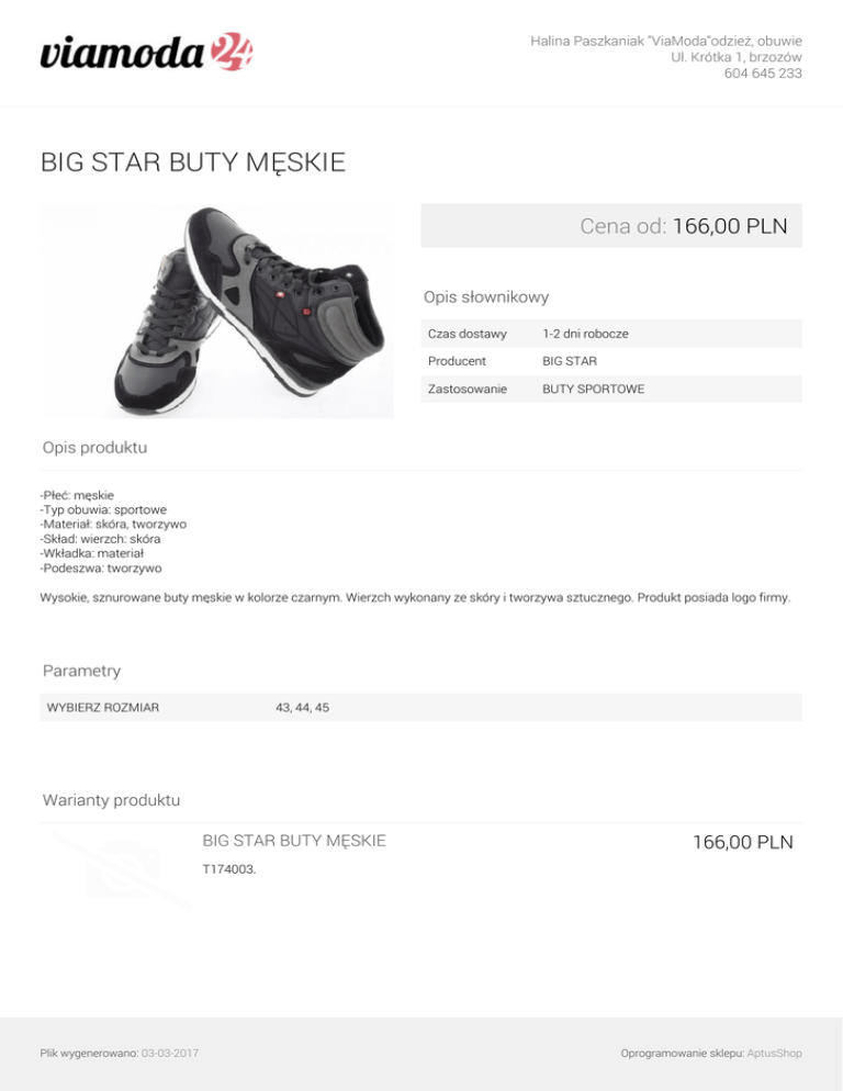 Halina Paszkaniak "ViaModa"odzież, obuwie Ul. Krótka 1, brzozów 604 645 233 BIG STAR BUTY MĘSKIE Cena od: 166,00 PLN Opis słownikowy Czas dostawy 1-2 dni robocze Producent BIG STAR Zastosowanie BUTY SPORTOWE Opis produktu -Płeć: męskie -Typ obuwia: sportowe -Materiał: skóra, tworzywo -Skład: wierzch: skóra -Wkładka: materiał -Podeszwa: tworzywo Wysokie, sznurowane buty męskie w kolorze czarnym. Wierzch wykonany ze skóry i tworzywa sztucznego. Produkt posiada logo firmy. Parametry WYBIERZ ROZMIAR 43, 44, 45 Warianty produktu BIG STAR BUTY MĘSKIE 166,00 PLN T174003. Plik wygenerowano: 03-03-2017 Oprogramowanie sklepu: AptusShop Halina Paszkaniak "ViaModa"odzież, obuwie Ul. Krótka 1, brzozów 604 645 233 Galeria Plik wygenerowano: 03-03-2017 Powered by TCPDF (www.tcpdf.org) Oprogramowanie sklepu: AptusShop