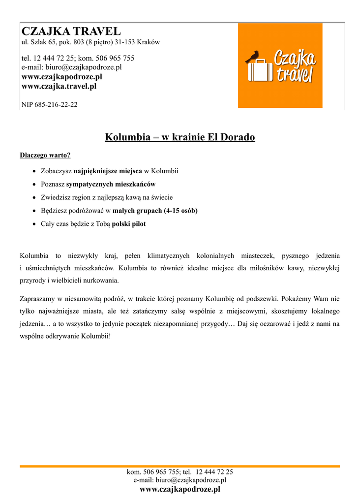 CZAJKA TRAVEL ul. Szlak 65, pok. 803 (8 piętro) 31-153 Kraków tel. 12 444 72 25; kom. 506 965 755 e-mail: [email protected] www.czajkapodroze.pl www.czajka.travel.pl NIP 685-216-22-22 Kolumbia – w krainie El Dorado Dlaczego warto? Zobaczysz najpiękniejsze miejsca w Kolumbii Poznasz sympatycznych mieszkańców Zwiedzisz region z najlepszą kawą na świecie Będziesz podróżować w małych grupach (4-15 osób) Cały czas będzie z Tobą polski pilot Kolumbia to niezwykły kraj, pełen klimatycznych kolonialnych miasteczek, pysznego jedzenia i uśmiechniętych mieszkańców. Kolumbia to również idealne miejsce dla miłośników kawy, niezwykłej przyrody i wielbicieli nurkowania. Zapraszamy w niesamowitą podróż, w trakcie której poznamy Kolumbię od podszewki. Pokażemy Wam nie tylko najważniejsze miasta, ale też zatańczymy salsę wspólnie z miejscowymi, skosztujemy lokalnego jedzenia… a to wszystko to jedynie początek niezapomnianej przygody… Daj się oczarować i jedź z nami na wspólne odkrywanie Kolumbii! kom. 506 965 755; tel. 12 444 72 25 e-mail: [email protected] www.czajkapodroze.pl PROGRAM 1 dzień: Wylot w godzinach porannych z Polski do Bogoty. 2 dzień: BOGOTA Tego dnia poznamy stolicę Kolumbii – Bogotę. Rozpoczniemy od spaceru po historycznej dzielnicy La Candelaria. Zobaczymy Plaza Bolivar, Muzeum Botero oraz Muzeum Złota. Na koniec wjedziemy kolejką linową na Wzgórze Monserrate, na którym będziemy podziwiać panoramę miasta oraz odwiedzimy tamtejszy kościół. Po południu dla chętnych istnieje możliwość wzięcia udziału w wycieczkach fakultatywnych: Zwiedzanie na rowerze, podczas którego przejedziemy przez Bogotę, podziwiając po drodze architekturę miasta, Lekcja gotowania, w trakcie której odwiedzimy lokalny targ, na którym kupimy świeże produkty, z których następnie ugotujemy znane potrawy kuchni kolumbijskiej, Lekcja salsy, w czasie której nauczyciele znanej szkoły tańca Paso Latino nauczą nas podstawowych kroków, które następnie wypróbujemy podczas tańca w sławnej Galeria Café Libro, Gra w tejo, czyli w tradycyjny kolumbijski sport, w który grają wszyscy już od ponad 500 lat, poza grą będziemy mieli również okazję na spróbowanie lokalnych piw. Nocleg w Bogocie. 3 dzień: BOGOTA - NEMOCON – VILLA DE LEYVA Po śniadaniu ruszamy do Villa de Leyva. Po drodze będziemy mieli okazję zobaczyć dawną kopalnię soli w Nemocon, w sercu której znajduje się kaplica Matki Boskiej z Góry Karmel. Żeby to zobaczyć zjedziemy na prawie 60 metrów pod ziemię. Po południu dotrzemy do Villa de Leyva. Nocleg w Villa de Leyva. 4 dzień: VILLA DE LEYVA i okolice Ten dzień spędzimy zwiedzając kolonialne miasteczko Villa De Leyva i okolice. Odwiedzimy klasztor Santo Ecce Homo, Muzeum El Fosil oraz El Infiernito – stanowisko archeologiczne, będące pamiątką po prekolumbijskiej kulturze Czibcza-Muisca. Ostatnim przystankiem tego dnia będzie Pozos Azules, czyli kompleks malowniczych jezior. kom. 506 965 755; tel. 12 444 72 25 e-mail: [email protected] www.czajkapodroze.pl 5 dzień: BOGOTA – ARMENIA Po śniadaniu wracamy do Bogoty, skąd nastąpi przelot samolotem lokalnych linii lotniczych do Armenii, czyli pięknego miasta leżącego w samym sercu regionu znanego z najlepszej kolumbijskiej kawy. 6 dzień: ARMENIA Tego dnia odwiedzimy plantację kawy, na której z bliska przyjrzymy się kawie i dowiemy się o niej wszystkiego. 7 dzień: COCORA - SALENTO Po śniadaniu ruszamy w stronę Valle de Cocora, miejscowości, w której zobaczymy słynne palmy woskowe. Na koniec dotrzemy do Salento. 8 dzień: MEDELLIN Przejazd do Medellin. 9 dzień: MEDELLIN Zwiedzanie Medellin, czyli drugiego pod względem wielkości miasto w Kolumbii. Medellin jeszcze 20 lat temu było jednym z najniebezpieczniejszych miast na świecie. Jednak na początku XXI wieku w mieście za częły zachodzić ogromne zmiany i obecnie jest to jedno z najnowocześniejszych miast świata. 10 dzień: MEDELLIN Czas wolny w Medellin. Dla chętnych istnieje możliwość wzięcia udziału w wycieczkach fakultatywnych: Zwiedzanie Guatapé i Piedra del Peñol, podczas którego odwiedzimy Guatapé - niewielką miejscowość nad jeziorem oraz Piedra del Peñol, czyli 200 metrowy blok skalny, z którego roztacza się przepiękny widok na najbliższą okolicę, Zwiedzanie rezerwaru La Miel, w trakcie którego będziemy wspinać się na 20 metrowy wodospad La Miel oraz będziemy mieli okazję zobaczyć andyjską florę i faunę, Lekcja jazdy konnej, w tradycyjnym kolumbijskim stylu chalanería, kom. 506 965 755; tel. 12 444 72 25 e-mail: [email protected] www.czajkapodroze.pl Spacer po La Minorista, czyli popularnym wśród miejscowych targu wypełnionego stoiskami ze świeżymi owocami, warzywami i kwiatami, Lekcja gotowania, w trakcie której ugotujemy znane lokalne potrawy, Zwiedzanie miasta śladami graffiti, podczas którego lokalni artyści zaprezentują nam swoje najciekawsze dzieła. 11 dzień: CARTAGENA Po śniadaniu nastąpi przelot samolotem lokalnych linii do Cartageny, która od 1984 roku znajduje się na Liście Światowego Dziedzictwa UNESCO. Cartagena jest miastem w północnej części kraju, położonym nad Morzem Karaibskim. 12 dzień: CARTAGENA Tego dnia poznamy bliżej Cartagenę, nazywaną również Perłą Karaibów. Odwiedzimy fort San Felipe de Barajas, dotrzemy do klasztoru i kościoła La Candelaria położonego na wzgórzu de La Popa oraz zobaczymy dzielnicę Getsemani. 13 dzień: LA BOQUILLA Po śniadaniu zapoznamy się z okolicami Cartageny. Rozpoczniemy w La Boquilla – pobliskiej wiosce wędkarskiej. Następnie udamy się na wycieczkę kajakową po lasach namorzynowych na bagnach Cienaga de Juan Polo. 14 dzień: ROSARIO ISLANDS Tego dnia udamy się do oddalonego o 40 km od Cartageny parku narodowego Wysp Rosario, czyli archipelagu składającego się z 27 wysp koralowych. Nocleg w Cartagenie. 15 dzień: CARTAGENA Czas wolny w C