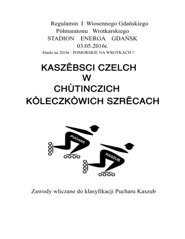 Regulamin I Wiosennego Gdańskiego Półmaratonu Wrotkarskiego STADION ENERGA GDAŃSK 03.05.2016r. /Hasło na 2016r : POMORSKIE NA WROTKACH !/ Zawody wliczane do klasyfikacji Pucharu Kaszub 1.Organizatorzy Półmaratonu: -Arena Gdańsk Operator Sp. z O.O. Ul Pokoleń Lechii Gdańsk 1, 80-560 Gdańsk -Stowarzyszenie Wrotkarskie „Gdańskie Lwy”,ul. Batalionów Chłopskich 39, 80-008 Gdańsk,Prezes- Julian Ziółkowski propagator i koordynator zawodów,Tel 515-390-900, e-mail : [email protected] -Fundacja Sport Support z programem LIDER ANIMATOR-Obudź Swoje Ciało, 2.Cel imprezy: -Promocja wrotkarstwa i rolkarstwa w Polsce, -Krzewienie kultury fizycznej wśród dzieci ,młodzieży i dorosłych, -Promowanie okolic nadmorskich ,terenów należących do gminy i miasta Gdańsk, -zainteresowanie mieszkańców miasta, gminy i gości dyscypliną sportu jakim jest wrotkarstwo ,poprzez stworzenie im warunków do osobistego dopingowania zawodników, -propagowanie aktywnego wypoczynku wśród mieszkańców i letników, -integracja grup społecznych ,patologicznych i rodzin ubogich, 3.Biuro maratonu: -biuro zawodów -03.05.2016r/wtorek czynne od godz. 9,00 mieścić się będzie: Stadion Energa w Gdańsku ul.Pokoleń Lechii Gdańsk 1 4.Zapisy: -drogą e-meilową przy pomocy Firmy odpowiadającej za pomiar elektroniczny „DOMTEL SPORT”. Zapisy przez Internet będą przyjmowane do dnia 30.04.2016 włącznie, -w dniu zawodów –biuro zawodów .Opłaty startowe : -do 31.03.2016 opłata wynosi 50zł, -od 01.04 do 30.04.2016 opłata wynosi 65zł, -w dniu zawodów -wpłata w Biurze Zawodów opłata wynosi 100zł, -dzieci do lat 15 włącznie startują bezpłatnie. 6.Opłaty należy wpłacać na adres: Stowarzyszenie Wrotkarskie „Gdańskie Lwy ” ,80-008 Gdańsk, ul Batalionów Chłopskich 39 NUMER KONTA : 26 1090 1098 0000 0001 2972 1184 W tytule przelewu prosimy wpisać : Wiosenny Gdański Półmaraton Wrotkarski -Opłata startowa, 7.Opłata startowa nie podlega zwrotowi. 8.Dystanse i terminy: 03 maja/wtorek 2016- I Wiosenny Gdański Półmaraton Wrotkarski A1. Start główny-półmaraton - 21km - godz. 13,00 /limit czasowy to 2godz/ , Na dystansie głównym tj 21 km mogą startować osoby urodzone w roku 2000 i starsze. A2. dystans Fitness - 10km - godz. 12,00 /limit czasowy to 55 minut/ , Na dystansie Fitness tj 10 km mogą startować osoby urodzone w roku 2004 i starsze, A3.-biegi dzieci -do lat 12-dystans 600metrów-start godz. 11.15 -13-15lat-dystans 1000metrów-start godz.11.30 UWAGA !!! istnieje możliwość zmiany dystansów i klasyfikacji wiekowych biegów dzieci -zależeć będzie to od ilości uczestników !!! TRASA – prawostronna,lewoskrętna. Zawody zostaną rozegrane na terenie obiektu sportowego Stadion Energa w Gdańsku przy ul Pokoleń Lechii Gdańsk 1. Trasa wyścigu: Pętla usytuowana na trasie wokół korony stadionu i przyległym parkingu. . Jedna pętla liczy ok 1,4 km-zawodnicy będą mieli do przejechania na 21km 15 pętli. A na dystansie Fitness 10km - 7 pętli. 9.Udział w zawodach: W zawodach może wziąć udział każdy posiada aktualne badania lekarskie bądź podpisze oświadczenie o zdolności i braku przeciwwskazań do biegu ,a także zapoznał się z Regulaminem i zaakceptował go .Dzieci do 18 roku życia muszą posiadać pisemną zgodę rodziców lub opiekunów na start w zawodach. 10.Pomiar elektroniczny: -Zapewnia „DOMTEL SPORT”, 11.Zasady uczestnictwa: -Wszyscy zawodnicy są zobowiązani do startu w kasku ochronnym, -wskazane są także ochraniacze na ręce i nogi, -Każdy zawodnik otrzyma CZIP wpięty w numer startowy ,który należy przyczepić na piersi. -limit czasu-czas zamknięcia trasy 2godz.dla biegu głównego 21km, 1 godz w biegu Fitness 10km , -z uwagi ,iż zawodnicy jeżdżą po pętli ,dlatego wyprzedzani uczestnicy winni trzymać się prawej strony drogi i umożliwić wyprzedzenie się przez nadjeżdżających z tyłu .Dla ostrzeżenia wyprzedzanych , zawodnik ,który chce wyprzedzić może stosować ostrzegawcze okrzyki typu: ” UWAGA”, ”LEWA WOLNA”, ”LEWA IDZIE” ,lub inne –eliminujemy w ten sposób możliwość kolizji .Zawodnicy muszą zachować szczególną ostrożność przy wyprzedzaniu !, -czołówkę wyścigu prowadzi motocyklista na motorze lub skuterze !, -podczas zawodów uczestnik powinien stosować się do poleceń sędziów i Organizatorów odpowiedzialnych za bezpieczeństwo i przebieg zawodów a także służb porządkowych , -za skracanie trasy zawodnik zostanie zdyskwalifikowany, -po przekroczeniu limitu czasu zawodnik musi zejść z trasy i zdjąć numer startowy, -obowiązuje szeroko pojęte sportowe zachowanie zawodników ! -ostateczna decyzja w rozwiązywaniu sporów i interpretacja niniejszego Regulaminu należy do organizatorów biegu, 12.Klasyfikacje: a/biegi dziecięce: -dzieci do lat 12 włącznie-chłopcy i dziewczęta-start wspólny, -dzieci 13do 16lat włącznie-chłopcy i dziewczęta-start wspólny, b/bieg główny-21km-półmaraton -klasyfikacja generalna kobiet i mężczyzn-start wspólny. -klasyfikacje wiekowe kobiet i mężczyzn: -16-19lat, -20-29lat, -30-39lat, -40-49lat, -50-59lat, -60-69lat, -powyżej 70lat. c/Fitness-10km -klasyfikacja generalna kobiet i mężczyzn -start wspólny, 13. Nagrody: -biegi dziecięce: każdy uczestnik otrzymuje pamiątkowy upominek, niespodzianka !, -bieg główny: -każdy uczestnik ,który ukończy bieg otrzymuje pamiątkowy medal, -w klasyfikacji generalnej bieg główny -21km miejsca 1-3-zwycięzcy otrzymują : I-miejsce-500zł II-miejsce-300zł III-miejsce-150zł, i kwiaty, – w klasyfikacjach wiekowych miejsca 1-3-zwycięzcy otrzymują kwiaty , -w klasyfikacji generalnej Fitness-10km – I,II,III m w kat .kobiet i mężczyzn-zawodnicy otrzymują kwiaty i nagrody niespodzianki, 14.Opłata startowa zostaje przeznaczona na pamiątkowy medal, okolicznościową koszulkę, numer startowy ,agrafki, koszty organizacji . 15.Wręczenie nagród odbędzie się na te