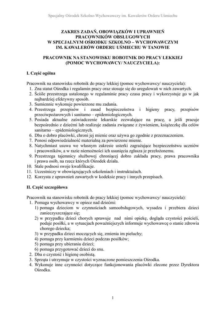 Specjalny Ośrodek Szkolno-Wychowawczy im. Kawalerów Orderu Uśmiechu ZAKRES ZADAŃ, OBOWIĄZKÓW I UPRAWNIEŃ PRACOWNIKÓW OBSŁUGOWYCH W SPECJALNYM OŚRODKU SZKOLNO – WYCHOWAWCZYM IM. KAWALERÓW ORDERU UŚMIECHU W TANOWIE PRACOWNIK NA STANOWISKU ROBOTNIK DO PRACY LEKKIEJ (POMOC WYCHOWAWCY/ NAUCZYCIELA): I. Część ogólna Pracownik na stanowisku robotnik do pracy lekkiej (pomoc wychowawcy/ nauczyciela): 1. Zna statut Ośrodka i regulamin pracy oraz stosuje się do uregulowań w nich zawartych. 2. Ściśle przestrzega ustalonego w regulaminie pracy czasu pracy i wykorzystuje go w jak najbardziej efektywny sposób. 3. Sumiennie wykonuje powierzone mu zadania. 4. Przestrzega przepisów i zasad bezpieczeństwa i higieny pracy, przepisów przeciwpożarowych i sanitarno – epidemiologicznych. 5. Posiada aktualne zaświadczenie lekarskie zezwalające na pracę, a jeśli pracuje bezpośrednio z dziećmi lub realizuje zadania związane z żywieniem, książeczkę dla celów sanitarno – epidemiologicznych. 6. Dba o dobro placówki, chroni jej mienie oraz używa go zgodnie z przeznaczeniem. 7. Ponosi odpowiedzialność materialną za powierzone mienie. 8. Natychmiast usuwa we własnym zakresie usterki zagrażające bezpieczeństwu uczniów i pracowników, a w razie niemożności ich usunięcia zgłasza je przełożonemu. 9. Przestrzega tajemnicy służbowej chroniącej dobro zakładu pracy, prawa pracownika i prawa osób, na rzecz których Ośrodek działa. 10. Stale podnosi swoje kwalifikacje. 11. Uczestniczy w obowiązujących szkoleniach i instruktażach. 12. Korzysta z uprawnień zawartych w kodeksie pracy i innych przepisach. II. Część szczegółowa Pracownik na stanowisku robotnik do pracy lekkiej (pomoc wychowawcy/ nauczyciela): 1. Pomaga wychowawcy w opiece nad dziećmi: 1) pomaga dzieciom w czynnościach samoobsługowych, wysadza i przebiera dzieci zanieczyszczające się; 2) w przypadku dzieci chorych sprawuje nad nimi opiekę, dogląda czystości pościeli, podaje posiłki, a w sytuacjach poważniejszych informuje wychowawcę o stanie zdrowia chorego dziecka; 3) w przypadku dzieci moczących się, zmienia im pieluchy; 4) pomaga przy karmieniu dzieci podczas posiłków; 5) pomaga przy ubieraniu dzieci; 6) pomaga przygotować dzieci do snu. 2. Dba o czystość i higienę osobistą. 3. Sprząta i utrzymuje w czystości wyznaczone pomieszczenia Ośrodka. 4. Wykonuje inne czynności dotyczące funkcjonowania placówki zlecone przez Dyrektora Ośrodka. 1 Specjalny Ośrodek Szkolno-Wychowawczy im. Kawalerów Orderu Uśmiechu PRACOWNIK NA STANOWISKU ROBOTNIK DO PRACY LEKKIEJ (OPIEKUN NOCNY): I. Część ogólna Pracownik na stanowisku robotnik do pracy lekkiej (opiekun nocny): 1. Zna Statut Ośrodka i Regulamin Pracy oraz stosuje się do uregulowań w nich zawartych. 2. Ściśle przestrzega ustalonego w regulaminie pracy czasu pracy i wykorzystuje go w jak najbardziej efektywny sposób. 3. Sumiennie wykonuje powierzone mu zadania. 4. Przestrzega przepisów i zasad bezpieczeństwa i higieny pracy, przepisów przeciwpożarowych i sanitarno – epidemiologicznych. 5. Posiada aktualne zaświadczenie lekarskie zezwalające na pracę, a jeśli pracuje bezpośrednio z dziećmi lub realizuje zadania związane z żywieniem, książeczkę dla celów sanitarno – epidemiologicznych. 6. Dba o dobro placówki, chroni jej mienie oraz używa go zgodnie z przeznaczeniem. 7. Ponosi odpowiedzialność materialną za powierzone mienie. 8. Natychmiast usuwa we własnym zakresie usterki zagrażające bezpieczeństwu uczniów i pracowników, a w razie niemożności ich usunięcia zgłasza je przełożonemu. 9. Przestrzega tajemnicy służbowej chroniącej dobro zakładu pracy, prawa pracownika i prawa osób, na rzecz których Ośrodek działa. 10. Stale podnosi swoje kwalifikacje. 11. Uczestniczy w obowiązujących szkoleniach i instruktażach. 12. Korzysta z uprawnień zawartych w kodeksie pracy i innych przepisach. II. Część szczegółowa Pracownik na stanowisku robotnik do pracy lekkiej (opiekun nocny): 1. Pomaga wychowawcy w opiece nad dziećmi: 1) pomaga dzieciom w czynnościach samoobsługowych, wysadza i przebiera dzieci zanieczyszczające się; 2) w przypadku dzieci chorych sprawuje nad nimi opiekę, dogląda czystości pościeli, podaje posiłki, a w sytuacjach poważniejszych informuje wychowawcę o stanie zdrowia chorego dziecka; 3) w przypadku dzieci moczących się, zmienia im pieluchy; 4) nie dopuszcza do przemieszczania się dzieci w nocy w celu innym niż załatwianie potrzeby fizjologicznej, 5) zwraca uwagę na przestrzeganie ciszy nocnej w sypialniach dzieci. 2. Zamyka drzwi wejściowe w godzinach nocnych. Przed zamknięciem sprawdza cały teren Ośrodka pod względem bezpieczeństwa. 3. Sprawdza, czy zabezpieczenia pomieszczeń w budynkach Ośrodka są prawidłowe. 4. Dopilnowuje w godzinach nocnych gaszenia wszystkich punktów świetlnych, oprócz oświetlenia ciągów komunikacyjnych wykorzystywanych w nocy. 5. Strzeże majątku całego Ośrodka. W wypadkach budzących podejrzenia alarmuje telefonicznie ochronę lub inne instytucje: policję lub straż pożarną. 6. Dba o czystość i higienę osobistą. 7. Czuwa przez cały okres dyżuru, w odstępach godzinnych kontroluje wszystkie kondygnacje, a o wyznaczonym czasie zależnym od pory roku zapala i gasi światło na terenie Ośrodka. 8. Przebywa na dyżurze tak długo, dopóki nie zgłosi się osoba zmieniająca (w żadnym 2 Specjalny Ośrodek Szkolno-Wychowawczy im. Kawalerów Orderu Uśmiechu wypadku nie opuszcza miejsca pracy po zakończeniu dyżuru nocnego, a przed pojawieniem się innego pracownika przejmującego obowiązki nadzoru nad dziećmi i mieniem). 9. Codziennie sprząta i utrzymuje w czystości pomieszczenia Ośrodka. 10. Wykonuje inne czynności dotyczące funkcjonowania placówki zlecone przez Dyrektora Ośrodka. PRACOWNIK NA STANOWISKU ROBOTNIK DO PRACY LEKKIEJ (SPRZĄTACZKA): I. Część ogólna Pracownik na st