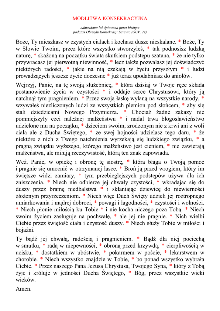 MODLITWA KONSEKRACYJNA odmawiana lub śpiewana przez biskupa podczas Obrzędu Konsekracji Dziewic (OCV, 24) Boże, Ty mieszkasz w czystych ciałach i kochasz dusze nieskalane. * Boże, Ty w Słowie Twoim, przez które wszystko stworzyłeś, * tak podnosisz ludzką naturę, * skażoną na początku świata skutkiem podstępu szatana, * że nie tylko przywracasz jej pierwotną niewinność, * lecz także pozwalasz jej doświadczyć niektórych radości, * jakie na nią czekają w życiu przyszłym * i ludzi prowadzących jeszcze życie doczesne * już teraz upodabniasz do aniołów. Wejrzyj, Panie, na tę swoją służebnicę, * która dzisiaj w Twoje ręce składa postanowienie życia w czystości * i oddaje serce Chrystusowi, który ją natchnął tym pragnieniem. * Przez swoją łaskę wylaną na wszystkie narody, * wzywałeś niezliczonych ludzi ze wszystkich plemion pod słońcem, * aby się stali dziedzicami Nowego Przymierza. * Chociaż żadne zakazy nie pomniejszyły czci należnej małżeństwu * i nadal trwa błogosławieństwo udzielone mu na początku, * dzieciom swoim, zrodzonym nie z krwi ani z woli ciała ale z Ducha Świętego, * ze swej hojności udzielasz tego daru, * że niektóre z nich z Twego natchnienia wyrzekają się ludzkiego związku, * a pragną związku wyższego, którego małżeństwo jest cieniem, * nie zawierają małżeństwa, ale miłują rzeczywistość, którą ten znak zapowiada. Weź, Panie, w opiekę i obronę tę siostrę, * która błaga o Twoją pomoc i pragnie się umocnić w otrzymanej łasce. * Broń ją przed wrogiem, który im świętsze widzi zamiary, * tym przebieglejszych podstępów używa dla ich zniszczenia. * Niech nie odbierze jej chwały czystości, * wkradając się do duszy przez bramę niedbalstwa * i skłaniając dziewicę do niewierności złożonym przyrzeczeniom. * Niech więc Duch Święty udzieli jej roztropnego umiarkowania i mądrej dobroci, * powagi i łagodności, * czystości i wolności. * Niech płonie miłością ku Tobie * i nie kocha niczego poza Tobą. * Niech swoim życiem zasługuje na pochwałę, * ale jej nie pragnie. * Nich wielbi Ciebie przez świętość ciała i czystość duszy. * Niech służy Tobie w miłości i bojaźni. Ty bądź jej chwałą, radością i pragnieniem. * Bądź dla niej pociechą w smutku, * radą w niepewności, * obroną przed krzywdą, * cierpliwością w ucisku, * dostatkiem w ubóstwie, * pokarmem w poście, * lekarstwem w chorobie. * Niech wszystko znajdzie w Tobie, * bo ponad wszystko wybrała Ciebie. * Przez naszego Pana Jezusa Chrystusa, Twojego Syna, * który z Tobą żyje i króluje w jedności Ducha Świętego, * Bóg, przez wszystkie wieki wieków. Amen.