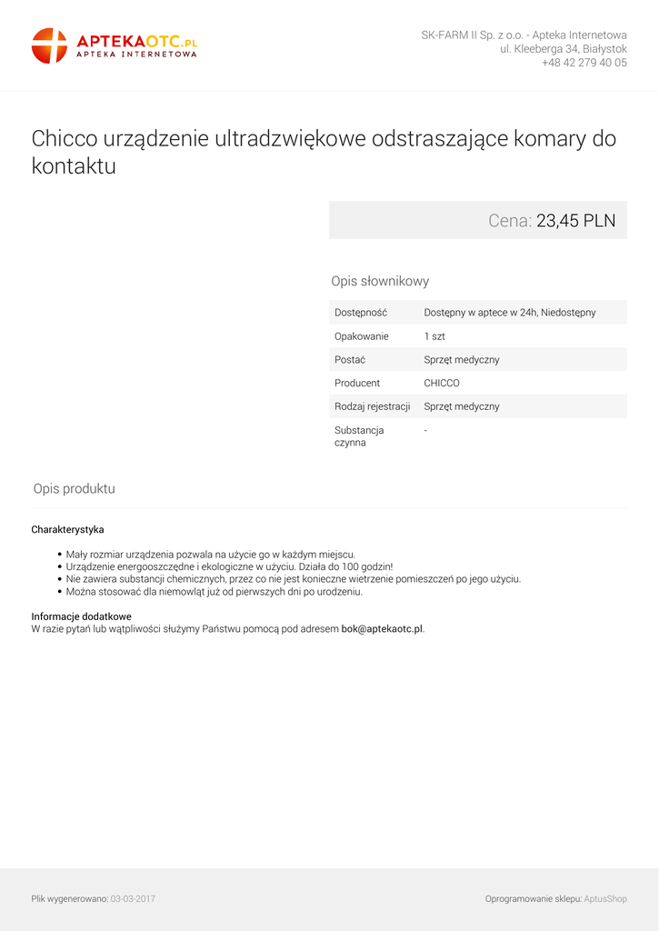 SK-FARM II Sp. z o.o. - Apteka Internetowa ul. Kleeberga 34, Białystok +48 42 279 40 05 Chicco urządzenie ultradzwiękowe odstraszające komary do kontaktu Cena: 23,45 PLN Opis słownikowy Dostępność Dostępny w aptece w 24h, Niedostępny Opakowanie 1 szt Postać Sprzęt medyczny Producent CHICCO Rodzaj rejestracji Sprzęt medyczny Substancja czynna - Opis produktu Charakterystyka Mały rozmiar urządzenia pozwala na użycie go w każdym miejscu. Urządzenie energooszczędne i ekologiczne w użyciu. Działa do 100 godzin! Nie zawiera substancji chemicznych, przez co nie jest konieczne wietrzenie pomieszczeń po jego użyciu. Można stosować dla niemowląt już od pierwszych dni po urodzeniu. Informacje dodatkowe W razie pytań lub wątpliwości służymy Państwu pomocą pod adresem [email protected]. Plik wygenerowano: 03-03-2017 Powered by TCPDF (www.tcpdf.org) Oprogramowanie sklepu: AptusShop