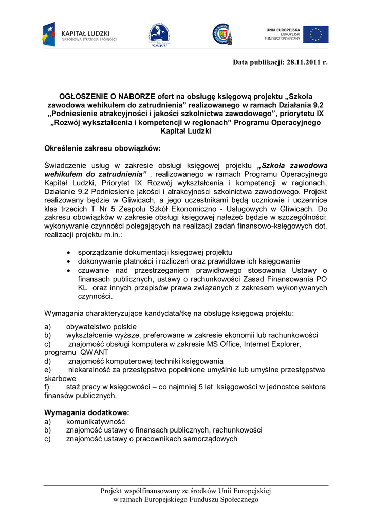 Data publikacji: 28.11.2011 r. OGŁOSZENIE O NABORZE ofert na obsługę księgową projektu „Szkoła zawodowa wehikułem do zatrudnienia” realizowanego w ramach Działania 9.2 „Podniesienie atrakcyjności i jakości szkolnictwa zawodowego”, priorytetu IX „Rozwój wykształcenia i kompetencji w regionach” Programu Operacyjnego Kapitał Ludzki Określenie zakresu obowiązków: Świadczenie usług w zakresie obsługi księgowej projektu „Szkoła zawodowa wehikułem do zatrudnienia” , realizowanego w ramach Programu Operacyjnego Kapitał Ludzki, Priorytet IX Rozwój wykształcenia i kompetencji w regionach, Działanie 9.2 Podniesienie jakości i atrakcyjności szkolnictwa zawodowego. Projekt realizowany będzie w Gliwicach, a jego uczestnikami będą uczniowie i uczennice klas trzecich T Nr 5 Zespołu Szkół Ekonomiczno - Usługowych w Gliwicach. Do zakresu obowiązków w zakresie obsługi księgowej należeć będzie w szczególności: wykonywanie czynności polegających na realizacji zadań finansowo-księgowych dot. realizacji projektu m.in.: sporządzanie dokumentacji księgowej projektu dokonywanie płatności i rozliczeń oraz prawidłowe ich księgowanie czuwanie nad przestrzeganiem prawidłowego stosowania Ustawy o finansach publicznych, ustawy o rachunkowości Zasad Finansowania PO KL oraz innych przepisów prawa związanych z zakresem wykonywanych czynności. Wymagania charakteryzujące kandydata/tkę na obsługę księgową projektu: a) obywatelstwo polskie b) wykształcenie wyższe, preferowane w zakresie ekonomii lub rachunkowości c) znajomość obsługi komputera w zakresie MS Office, Internet Explorer, programu QWANT d) znajomość komputerowej techniki księgowania e) niekaralność za przestępstwo popełnione umyślnie lub umyślne przestępstwa skarbowe f) staż pracy w księgowości – co najmniej 5 lat księgowości w jednostce sektora finansów publicznych. Wymagania dodatkowe: a) komunikatywność b) znajomość ustawy o finansach publicznych, rachunkowości c) znajomość ustawy o pracownikach samorządowych Projekt współfinansowany ze środków Unii Europejskiej w ramach Europejskiego Funduszu Społecznego Wybór Kandydata/tki nastąpi w oparciu o najbardziej korzystne oferty z zachowaniem zasad jawności, przejrzystości i uczciwej konkurencji. Dokumenty, do złożenia których zobowiązani są kandydaci: 1. list motywacyjny, 2. życiorys – curriculum vitae, 3. kserokopie dokumentów potwierdzających wymagane wykształcenie oraz doświadczenie zawodowe, 4. oświadczenie o niekaralności (do pobrania ze strony). Termin składania ofert: 2 grudnia 2011 r. do godz. 13:00 w sekretariacie Zespołu Szkół Ekonomiczno – Usługowych w Gliwicach przy ul. Kozielskiej 1 Termin rozpoczęcia pracy w projekcie: od 5 grudnia 2011 r. Przewidywany termin zakończenia: 31 lipca 2013 r. Wymagane dokumenty należy złożyć w zaklejonej kopercie z adnotacją: nabór ofert na stanowisko obsługi księgowej projektu „Szkoła zawodowa wehikułem do zatrudnienia” Aplikacje, które wpłyną po wyżej określonym terminie nie będą rozpatrywane. Informacja o wyniku naboru będzie umieszczona na stronie internetowej pod adresem: http://zseu.webd.pl/projekt/ oraz na tablicy informacyjnej w siedzibie Szkoły przy ul. Kozielskiej 1 w Gliwicach. Wymagane dokumenty aplikacyjne: list motywacyjny, szczegółowe CV (z uwzględnieniem przebiegu kariery zawodowej), powinny być opatrzone klauzulą: Wyrażam zgodę na przetwarzanie moich danych osobowych zawartych w ofercie pracy w ramach projektu „Szkoła zawodowa wehikułem do zatrudnienia” dla potrzeb niezbędnych do realizacji procesu rekrutacji zgodnie z ustawą z dnia 29 sierpnia 1997 r. o ochronie danych osobowych (Dz. U. z 2002 r. Nr 101, poz. 926 z późn. zm.). ZATWIERDZAM Dyrektor Zespołu Szkół Ekonomiczno - Usługowych Krystian Szatka Projekt współfinansowany ze środków Unii Europejskiej w ramach Europejskiego Funduszu Społecznego