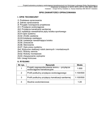 Projekt budowlany przyłączy wodociągowo-kanalizacyjnych do Gminnego Ludowego Klubu Sportowego w Żołędowie na działkach nr 257/2, 257/5, 257/10, 258, 260/3, 260/4 Inwestor – Urząd Gminy Osielsko ul. Szosa Gdańska 55A 86-031 Osielsko SPIS ZAWARTOŚCI OPRACOWANIA I. OPIS TECHNICZNY 1. Podstawa opracowania 2. Zakres opracowania 3. Przyjęte rozwiązania projektowe 3.1. Przyłącze wodociągowe 3.2. Przyłącza kanalizacji sanitarnej 3.3. Instalacja nawadniania płyty boiska sportowego 3.3.1.Opis systemu 3.3.2. Źródło zasilania 3.3.3.Instalacja zasilająca 3.3.4. Instalacja nawadniająca boisko 3.3.5. Zraszacze 3.3.6. Sterowanie 3.3.7. Opis pracy systemu 3.4. Wytyczne realizacji robót ziemnych i montażowych 3.4.1. Roboty ziemne 3.4.2. Roboty montażowe 3.4.3. Zasypywanie wykopów 3.5. Uwagi końcowe II. RYSUNKI Nr rys. 1 Rysunek Projekt zagospodarowania terenu – przyłącza wodociągowo-kanalizacyjne Skala 1:500 2 Profil podłużny przyłącza wodociągowego 1:100/500 3 Profil podłużny przyłączy kanalizacji sanitarnej 1:100/500 4 Studnia wodomierzowa 1:20 Projekt budowlany przyłączy wodociągowo-kanalizacyjnych do Gminnego Ludowego Klubu Sportowego w Żołędowie na działkach nr 257/2, 257/5, 257/10, 258, 260/3, 260/4 Inwestor – Urząd Gminy Osielsko ul. Szosa Gdańska 55A 86-031 Osielsko I. OPIS TECHNICZNY do projektu budowlanego przyłączy wodociągowo-kanalizacyjnych oraz systemu nawadniającego 1.0 Podstawa opracowania. - Zlecenie Inwestora - Załączniki formalno-prawne - Aktualny plan sytuacyjno-wysokościowy; - Ustalenia dokonane z Inwestorem; - Aktualne normy i przepisy. 2.0 Zakres opracowania. Zakresem niniejszego opracowania objęto: - zaopatrzenie w wodę kompleksu budynków poprzez wykonanie przyłącza wodociągowego z rur PE100 Ø90x8.2 PN12.5 SDR11 od istniejącej sieci wodociągowej Ø90PE - odprowadzających ścieki do istniejących studni kanalizacyjnych na działce 257/5 poprzez przyłącza kanalizacji sanitarnej Ø160x4.7PVC, - instalacja nawadniania płyty boiska sportowego. 3.0 Przyjęte rozwiązania projektowe 3.1. Przyłącze wodociągowe Przyłącze wodociągowe projektuje się z rur i kształtek polietylenowych Ø90x8.2, SDR11, PN12.5. Włączenie należy wykonać przez trójnik żeliwny kołnierzowy równoprzelotowy Ø80. Za włączeniem zamontować zasuwę żeliwną kołnierzową odcinającą Ø80 wyposażoną w obudowę i skrzynkę uliczną. Pomiar zużycia wody przewiduje się w studni wodomierzowej żelbetowej Ø2500, którą wykonać zgodnie z normą PN-91/B-10728 „Studnie wodociągowe”. Studnię wyposażyć w właz pełny z podwójną pokrywą, górną klasy D400. Wentylację grawitacyjną wykonać przewodami Ø110PVC i wyprowadzić na wysokość min. 0.5m i zakończyć kominkami wentylacyjnymi. W studni zamontować wodomierz skrzydełkowy, jednostrumieniowy DN80 klasy C np. firmy Actaris (wynikająca z obliczeń). Zabudowę zestawu wykonać zgodnie z normą PN-B/10720. Za wodomierzem na instalacji wewnętrznej, należy zainstalować zawór antyskażeniowy klasy BA Ø80 oraz kurek spustowy Ø25 zgodnie z normą PN-92/B-01706 oraz PNEN1717:2003. Przyłącze wykonać z rur wg PN-EN 12201, zewnętrzne przewody wodociągowe. Budowa i badanie PN-B-10725:1997 oraz WTWiOSW z 2001r. Nad rurociągiem wodociągowym w odległości 50cm ułożyć taśmę sygnalizacyjną koloru niebieskiego, natomiast drut wskaźnikowy DY6 (1,5mm2) mocowany do górnej tworzącej przewodu połączony z zestawem wodomierzowym (opaska zaciskowa metalowa) i wyprowadzony do skrzynki zasuwki. Próbę szczelności wykonać po ułożeniu przewodów i wykonaniu warstwy ochronnej. Wszystkie złącza w czasie próby powinny być odkryte. Próbę wykonywać hydraulicznie na ciśnienie 1,5 razy w stosunku do ciśnienia roboczego nie mniej niż 1,0 MPa dla rur PN10. Projekt budowlany przyłączy wodociągowo-kanalizacyjnych do Gminnego Ludowego Klubu Sportowego w Żołędowie na działkach nr 257/2, 257/5, 257/10, 258, 260/3, 260/4 Inwestor – Urząd Gminy Osielsko ul. Szosa Gdańska 55A 86-031 Osielsko Przed oddaniem do eksploatacji przepłukać i przeprowadzić dezynfekcję podchlorynem wapnia lub sodu zawierającego co najmniej 50 mg Cl2/dm3 przy czasie kontaktu 24h. Po dezynfekcji należy ponownie przewód przepłukać i dokonać analizie bakteriologicznej wody. Szczegóły dotyczące rozwiązań technicznych przedstawiono w części graficznej niniejszego opracowania. 3.2. Przyłącza kanalizacji sanitarnej Powstające ścieki socjalne z budynków odprowadzane będą przewodami PVC ∅160x4,7 wg PN-EN1401, SN8 łączonych kielichowo na uszczelkę gumową do miejskiej sieci kanalizacyjnej ∅200PVC przebiegającej na działce nr 257/5. Włączenia do istniejącego kanału wykonać na istniejące studnie Ø1200. Na przyłączu wybudować studzienki rewizyjne zlokalizowaną na terenie działki Inwestora. Projektowane studnie przykryć żelbetową płytą nastudzienną. Na projektowanych studniach zastosować włazy klasy D-400. Z budynku nr 7 ścieki odprowadzane będą przez zastosowanie systemu Presskan. Przewód ciśnieniowy układać na głębokości ok. -1.60m. Budowę, badania i odbiory kanalizacji wykonać zgodnie z normą PN-EN1610 oraz WTWiOSK z 2003r. Szczegóły dotyczące rozwiązań technicznych przedstawiono w części graficznej niniejszego opracowania. 3.3. Instalacja nawadniania płyty boiska sportowego 3.3.1.Opis systemu Przyjęto system nawadniania płyty boiska oparty o urządzenia systemu Perrot oferowane przez Perrot Polska. Rozwiązanie oparte jest na dwunastu zraszaczach, z czego tylko dwa znajdują się bezpośrednio w płycie boiska (powszechnie stosowany europejski standard). Istnieje kilka bardzo istotnych powodów zabudowy tylko dwóch zraszaczy w płycie boiska: - zredukowanie do minimum ryzyka kontuzji spowodowanej upadkiem i uderzeniem o element zraszacza w przypadku stadionów olimpijskich zredukowanie do minimum prawdopodobieństwa usz