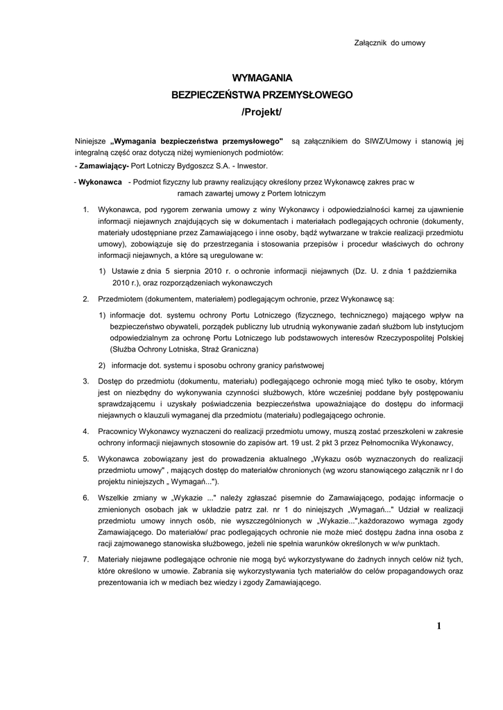 Załącznik do umowy WYMAGANIA BEZPIECZEŃSTWA PRZEMYSŁOWEGO /Projekt/ Niniejsze „Wymagania bezpieczeństwa przemysłowego" są załącznikiem do SIWZ/Umowy i stanowią jej integralną część oraz dotyczą niżej wymienionych podmiotów: - Zamawiający- Port Lotniczy Bydgoszcz S.A. - Inwestor. - Wykonawca - Podmiot fizyczny lub prawny realizujący określony przez Wykonawcę zakres prac w ramach zawartej umowy z Portem lotniczym 1. Wykonawca, pod rygorem zerwania umowy z winy Wykonawcy i odpowiedzialności karnej za ujawnienie informacji niejawnych znajdujących się w dokumentach i materiałach podlegających ochronie (dokumenty, materiały udostępniane przez Zamawiającego i inne osoby, bądź wytwarzane w trakcie realizacji przedmiotu umowy), zobowiązuje się do przestrzegania i stosowania przepisów i procedur właściwych do ochrony informacji niejawnych, a które są uregulowane w: 1) Ustawie z dnia 5 sierpnia 2010 r. o ochronie informacji niejawnych (Dz. U. z dnia 1 października 2010 r.), oraz rozporządzeniach wykonawczych 2. Przedmiotem (dokumentem, materiałem) podlegającym ochronie, przez Wykonawcę są: 1) informacje dot. systemu ochrony Portu Lotniczego (fizycznego, technicznego) mającego wpływ na bezpieczeństwo obywateli, porządek publiczny lub utrudnią wykonywanie zadań służbom lub instytucjom odpowiedzialnym za ochronę Portu Lotniczego lub podstawowych interesów Rzeczypospolitej Polskiej (Służba Ochrony Lotniska, Straż Graniczna) 2) informacje dot. systemu i sposobu ochrony granicy państwowej 3. Dostęp do przedmiotu (dokumentu, materiału) podlegającego ochronie mogą mieć tylko te osoby, którym jest on niezbędny do wykonywania czynności służbowych, które wcześniej poddane były postępowaniu sprawdzającemu i uzyskały poświadczenia bezpieczeństwa upoważniające do dostępu do informacji niejawnych o klauzuli wymaganej dla przedmiotu (materiału) podlegającego ochronie. 4. Pracownicy Wykonawcy wyznaczeni do realizacji przedmiotu umowy, muszą zostać przeszkoleni w zakresie ochrony informacji niejawnych stosownie do zapisów art. 19 ust. 2 pkt 3 przez Pełnomocnika Wykonawcy, 5. Wykonawca zobowiązany jest do prowadzenia aktualnego „Wykazu osób wyznaczonych do realizacji przedmiotu umowy" , mających dostęp do materiałów chronionych (wg wzoru stanowiącego załącznik nr l do projektu niniejszych „ Wymagań..."). 6. Wszelkie zmiany w „Wykazie ..." należy zgłaszać pisemnie do Zamawiającego, podając informacje o zmienionych osobach jak w układzie patrz zał. nr 1 do niniejszych „Wymagań..." Udział w realizacji przedmiotu umowy innych osób, nie wyszczególnionych w „Wykazie...",każdorazowo wymaga zgody Zamawiającego. Do materiałów/ prac podlegających ochronie nie może mieć dostępu żadna inna osoba z racji zajmowanego stanowiska służbowego, jeżeli nie spełnia warunków określonych w w/w punktach. 7. Materiały niejawne podlegające ochronie nie mogą być wykorzystywane do żadnych innych celów niż tych, które określono w umowie. Zabrania się wykorzystywania tych materiałów do celów propagandowych oraz prezentowania ich w mediach bez wiedzy i zgody Zamawiającego. 1 8. Zgodnie z art.71 ust. 3 ustawy - nadzór, kontrolę, szkolenie i doradztwo w zakresie ochrony informacji niejawnych przekazanych Wykonawcy , z ramienia Zamawiającego, sprawować będzie: 1) Pełnomocnik ds. ochrony informacji niejawnych Port Lotniczy Bydgoszcz S.A. - ………………… 9. Zasady poruszania się ludzi, samochodów i sprzętu Wykonawcy, na terenie realizowanego zadania, Wykonawca uzgodni z Użytkownikiem obiektu. 10. Wykonawcę obowiązuje zakaz wnoszenia w strefę zastrzeżoną lotniska: aparatów fotograficznych, kamer, telefonów komórkowych oraz innego sprzętu utrwalającego obraz i dźwięk. Każdorazowe wniesienie/ wykorzystanie w/w sprzętu wymaga zgody Zamawiającego 11. W przypadku naruszenia bezpieczeństwa materiałów podlegających ochronie, przekazanych Wykonawcy lub przez niego wytworzonych, Wykonawca spowoduje właściwe zabezpieczenie dowodów naruszenia i natychmiast powiadomi o tym fakcie Zamawiającego, a w uzasadnionych wypadkach również - Agencję Bezpieczeństwa Wewnętrznego. 12. W przypadku zlecenia wykonania prac objętych umową Wykonawca przed przekazaniem Podwykonawcy materiałów /prac/ podlegających ochronie - w części lub całości, musi zastosować te same procedury sprawdzające, jakie Zamawiający zastosował przy wyłanianiu Wykonawcy. Oznacza to, że: 1) Podczas wyboru Podwykonawców muszą być przestrzegane w pełnym zakresie zasady i procedury ochrony informacji niejawnych, oznacza to, że podwykonawca musi spełniać te same wymagania w zakresie ochrony informacji niejawnych jak Wykonawca. 2) Wykonawca ponosi pełną odpowiedzialność za prowadzenie szkolenia w zakresie przestrzegania przez Podwykonawców zasad niniejszych „Wymagań..." oraz za: nadzór, kontrolę, szkolenie i doradztwo w zakresie obowiązku ochrony przez Podwykonawcę przekazanych informacji niejawnych. Zał. nr 1 - Wykaz osób wyznaczonych do realizacji zadania, ZAMAWIAJĄCY /mnp/ Pełnomocnik Ochrony (informacji niejawnych)Zamawiającego WYKONAWCA /mnp/ Pełnomocnik Wykonawcy Ochrony (informacji niejawnych) 2 Załącznik nr 1 do „ Wymagań Bezpieczeństwa Przemysłowego" /Pieczęć nagłówkowa Wykonawcy/ WYKAZ OSÓB ODPOWIEDZIALNYCH ZA OCHRONĘ INFORMACJI NIEJAWNYCH UMOWY NR ........... Z DNIA ..........2013 r. Lp 1 1 2 3 4 5 6 Imię i nazwisko Nr Ewid. PESEL 2 Dokument tożsamości. Nazwa Seria i numer dokumentu dokumentu 3 4 Zajmowane stanowisko 5 Poświadczenie bezpieczeństwa/ Upoważnienie Numer Klauzula Data Organ tajności ważności wydający 6 7 8 9 n n+1 Podpis i data Pełnomocnika Ochrony Wykonawcy ...................................................... mnp Podpis i data Wykonawcy .............................................. mnp